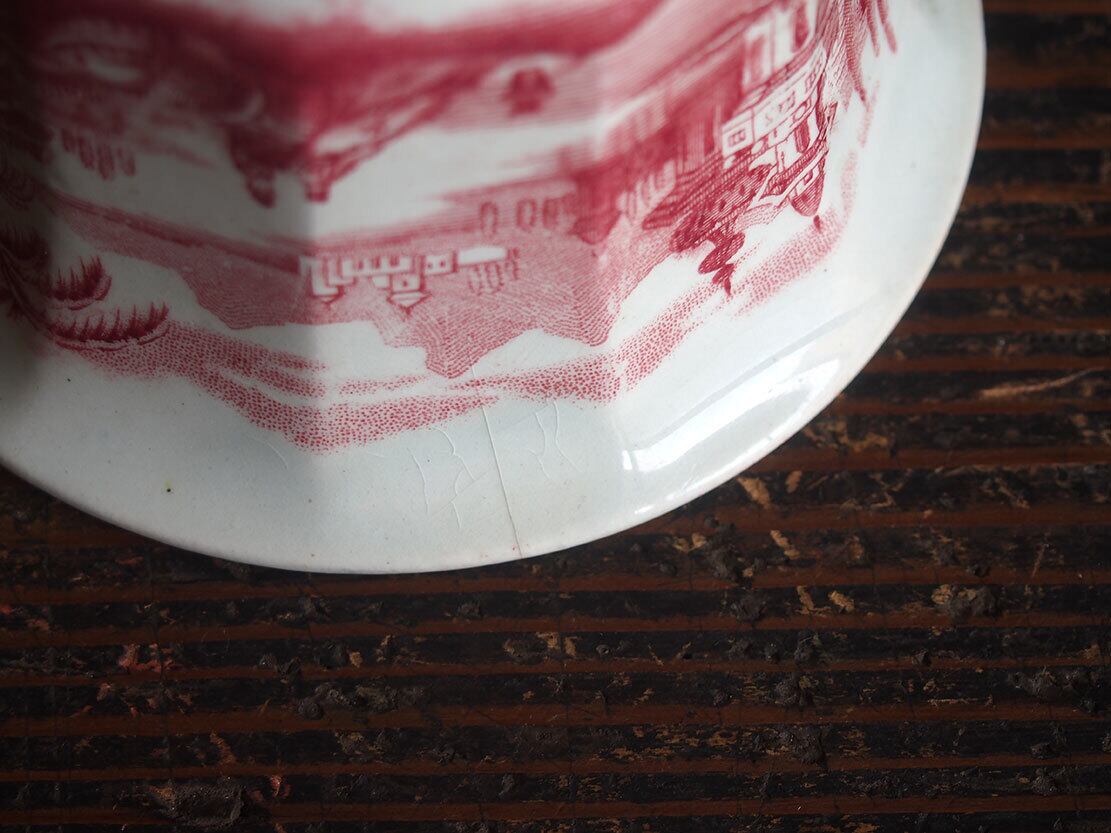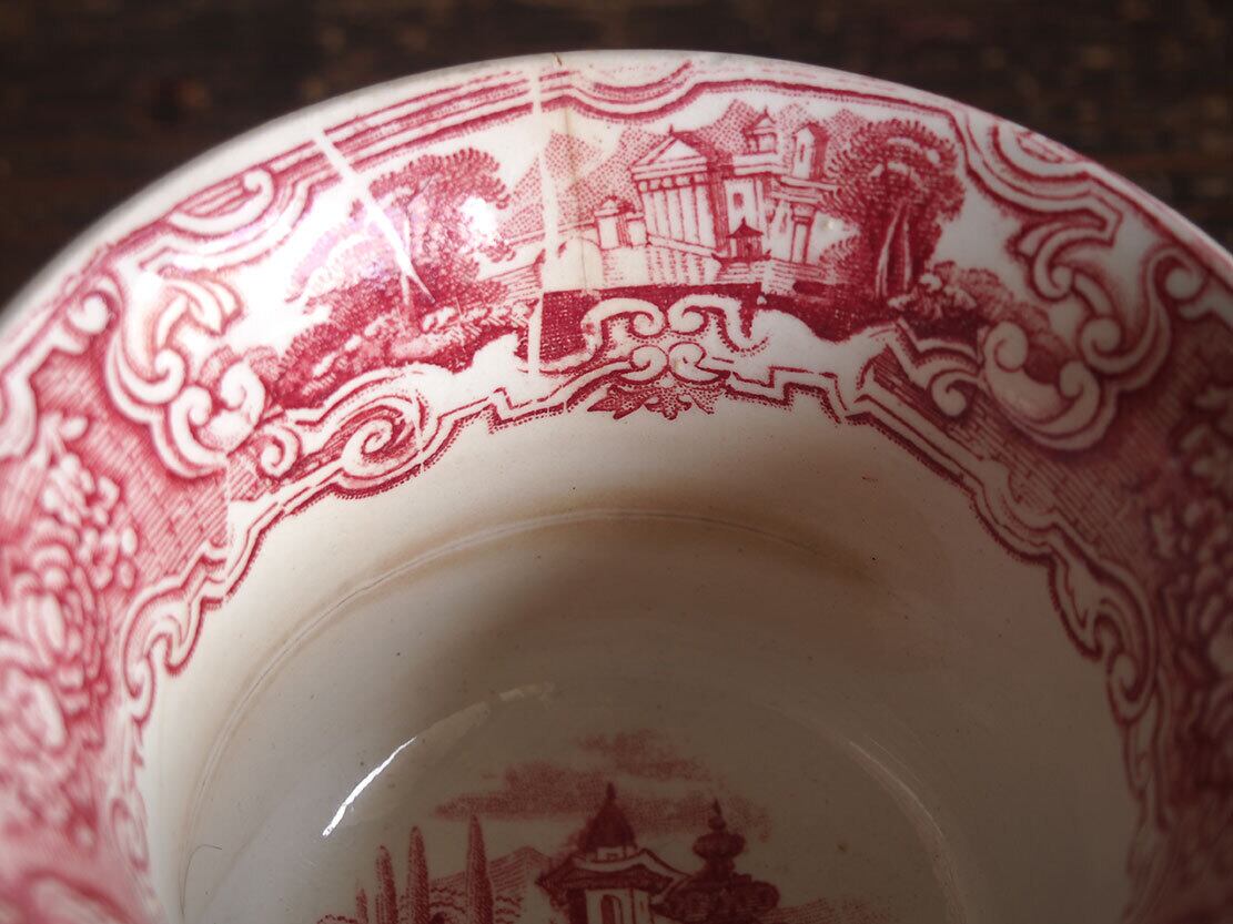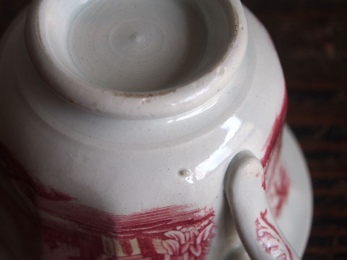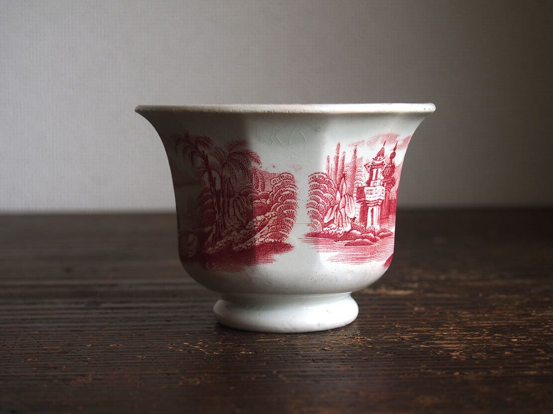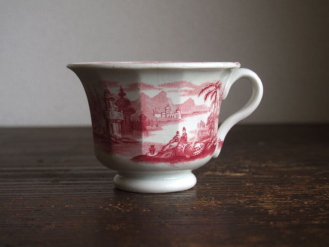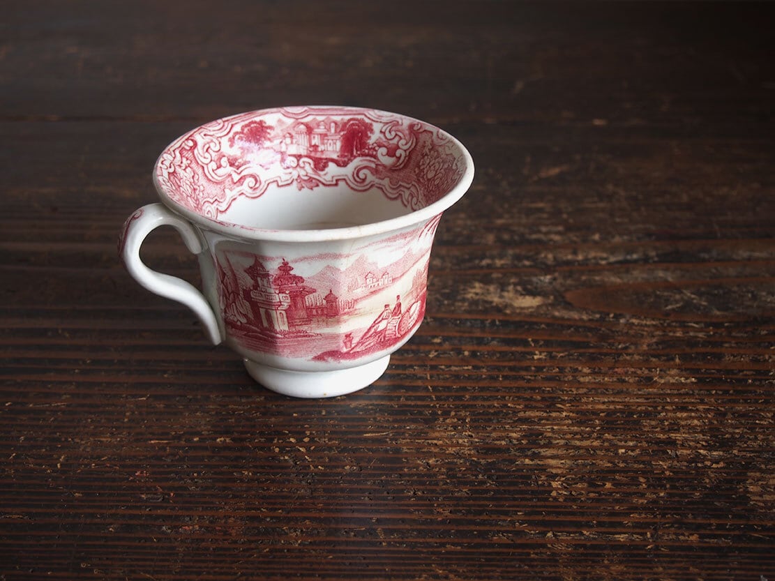 ヨーロッパの蚤の市で入手。ブラック・トランスファーウエァのカップ、19世紀。1841年創業、英国人のピックマンによってセビリアの修道院を利用して作られたスペインの古陶。1800年初頭に英国からの膨大な陶器製品のスペインへの輸入を禁止されたのち、スペイン国内で生産するために英国から多数のマイスターが派遣され指導したと言われています。二人の人物がいる湖畔の風景紋様。縁にニュウがあります、写真でご確認ください。コレクションにも。