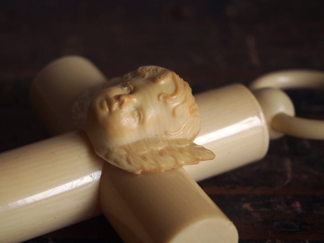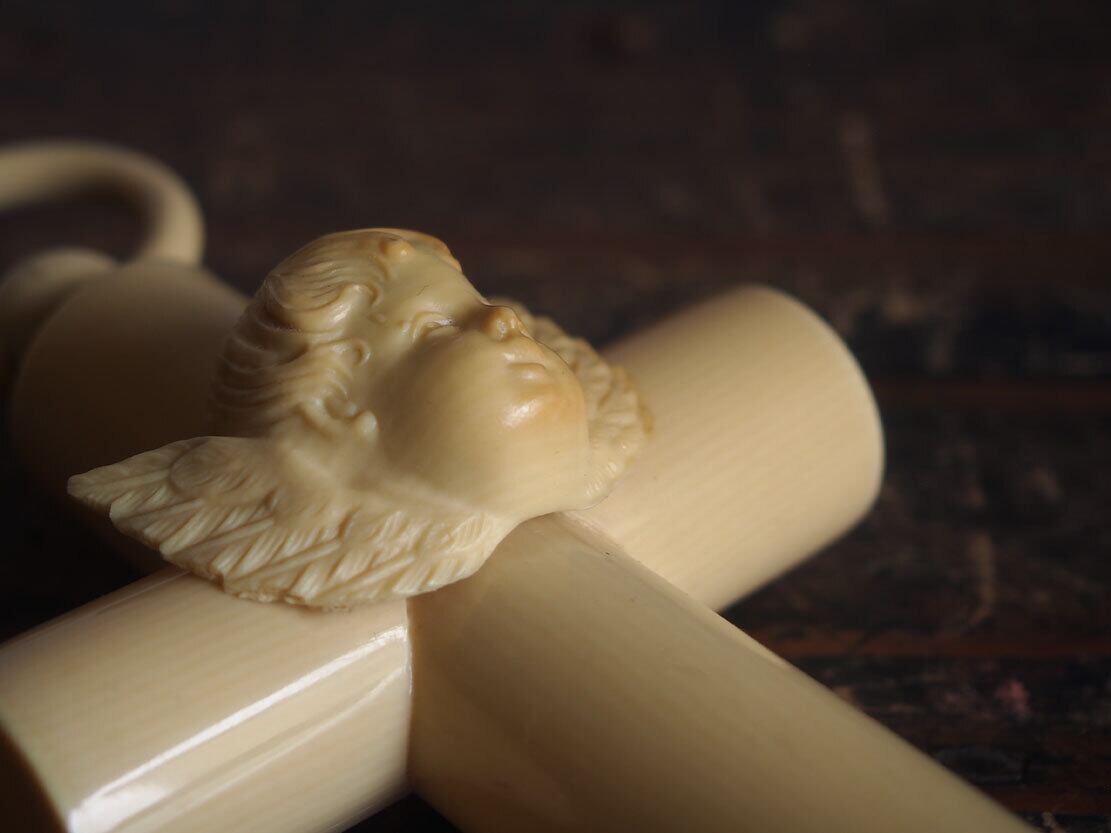 これはベビーベッドにつけるお守りです。材質はガラリスとは牛乳を原料とした樹脂で象牙の代替え品として使われたものです。1930年ぐらい?天使の顔が少し茶色に変色しています。特に目立つダメージはありません。古い物と言う事をご理解の上のご入札をお願い致します。