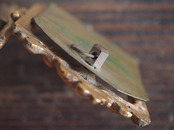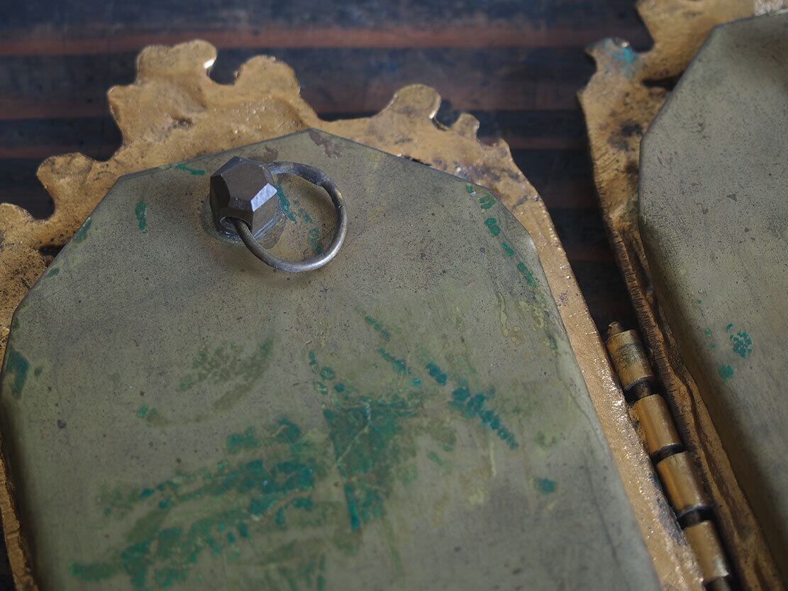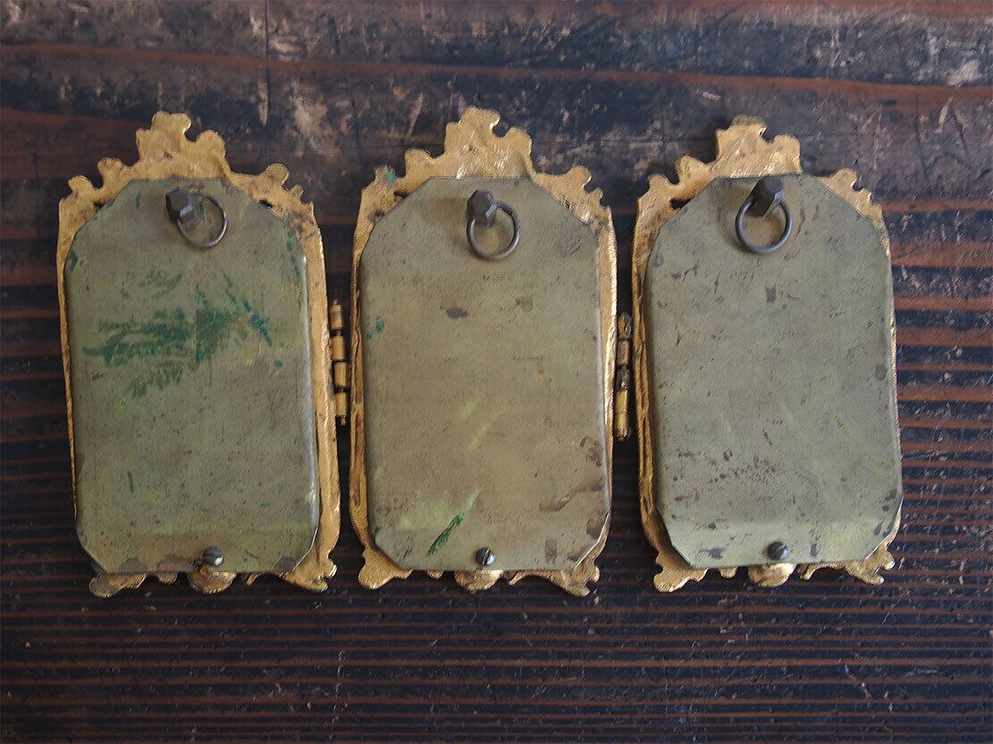 南欧の骨董市にて入手、1900年代ぐらい?。ロカイユ模様の3連フォトフレーム。蝶番に多少のがたつきがあり、傷や塗装の摩耗などあります。ガラスは入手時からありませんでした。窓の内径5.8cm×9cm。3枚を折りたたむことはできません、もともとそのような作りのようです。リメイク、参考資料にも。