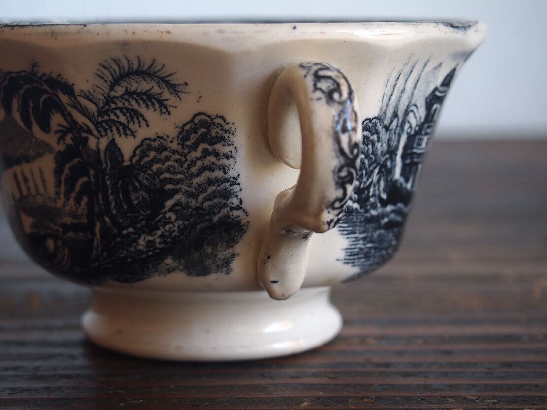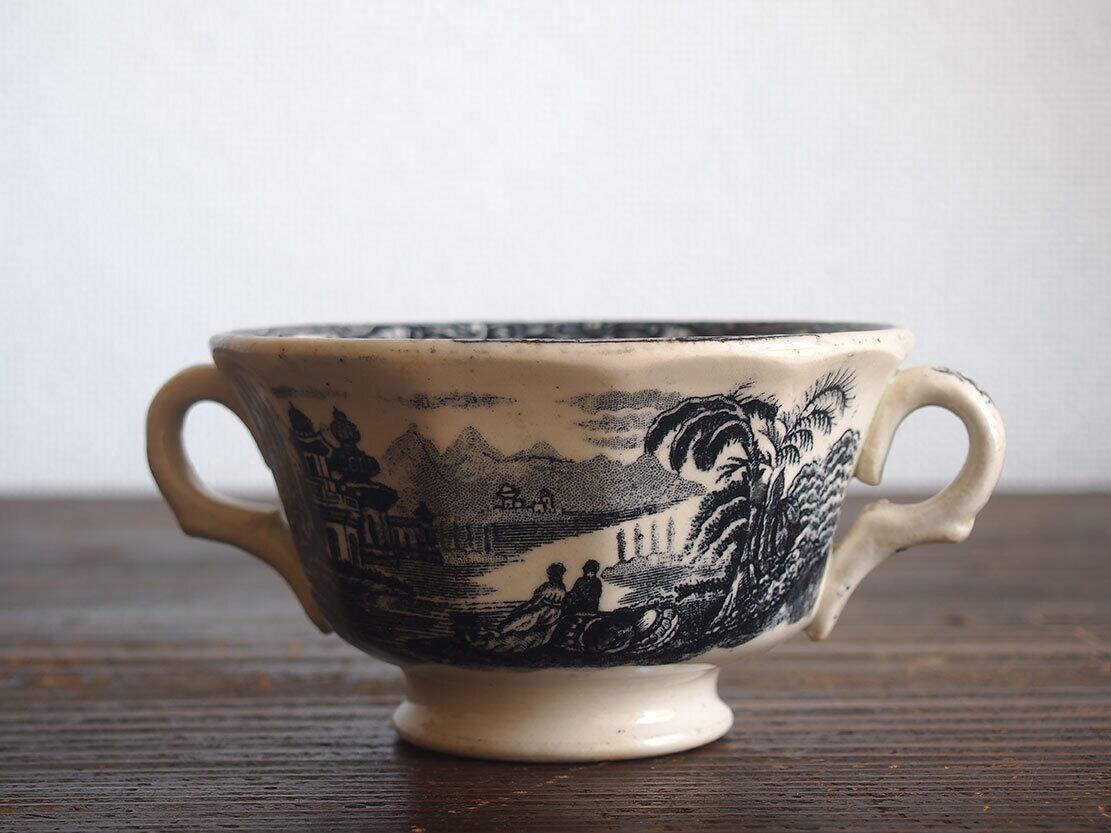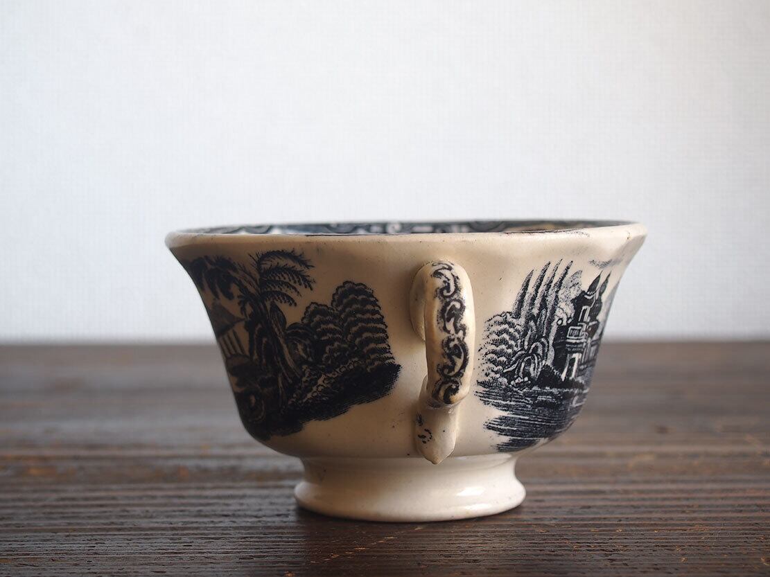 ヨーロッパの蚤の市で入手。ブラック・トランスファーウエァのカップ、19世紀。1841年創業、英国人のピックマンによってセビリアの修道院を利用して作られたスペインの古陶。1800年初頭に英国からの膨大な陶器製品のスペインへの輸入を禁止されたのち、スペイン国内で生産するために英国から多数のマイスターが派遣され指導したと言われています。湖畔の風景の紋様でしょうか。両側に取っ手が付いているカップは初めての取り扱いです。スープなどをサーブするために使われたものでしょう。両耳も含めた幅15.5cm。多少の黄変、貫入などあります。コレクション、実用にもいかがでしょう。