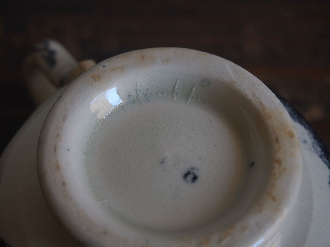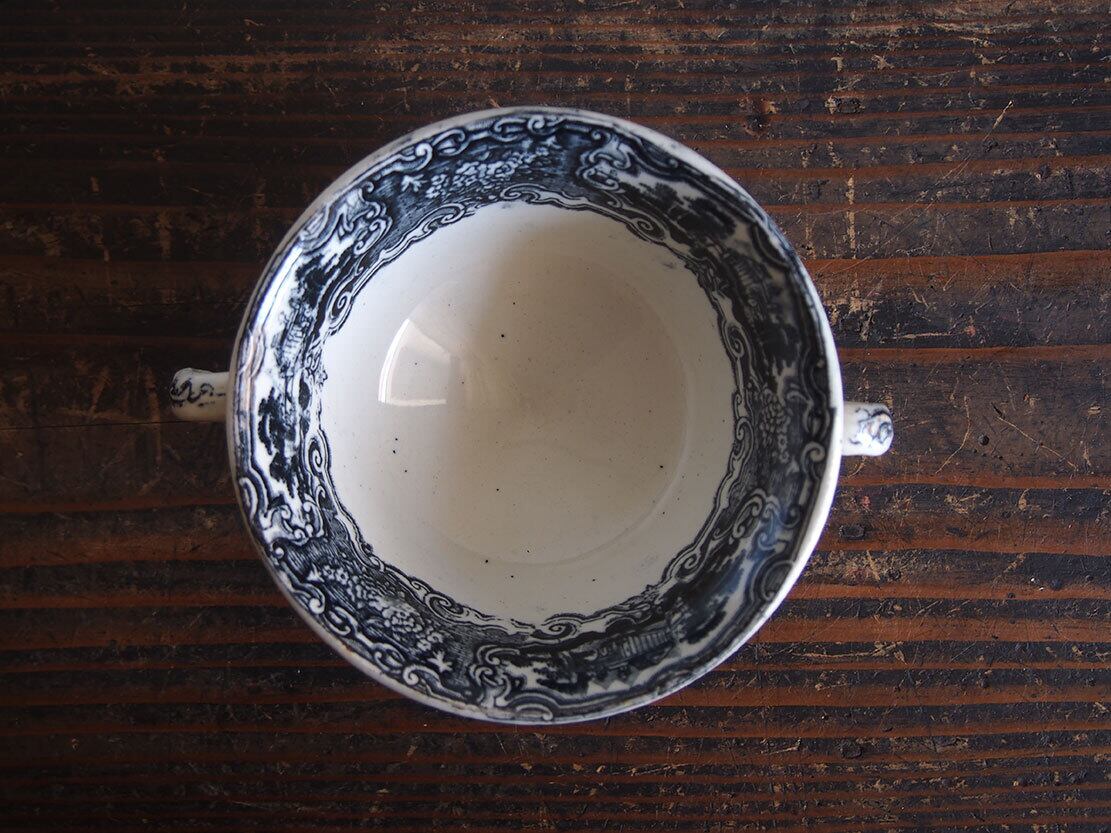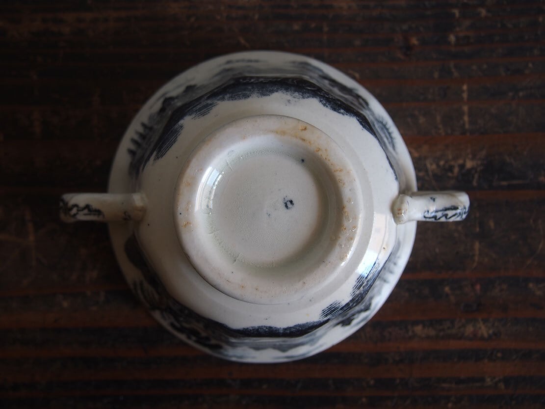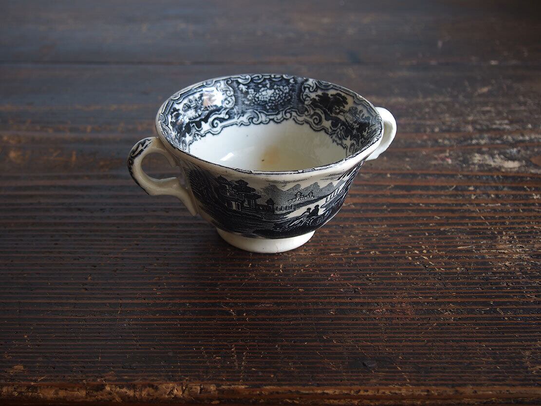 ヨーロッパの蚤の市で入手。ブラック・トランスファーウエァのカップ、19世紀。1841年創業、英国人のピックマンによってセビリアの修道院を利用して作られたスペインの古陶。1800年初頭に英国からの膨大な陶器製品のスペインへの輸入を禁止されたのち、スペイン国内で生産するために英国から多数のマイスターが派遣され指導したと言われています。湖畔の風景の紋様でしょうか。両側に取っ手が付いているカップは初めての取り扱いです。スープなどをサーブするために使われたものでしょう。両耳も含めた幅15.5cm。多少の黄変、貫入などあります。コレクション、実用にもいかがでしょう。