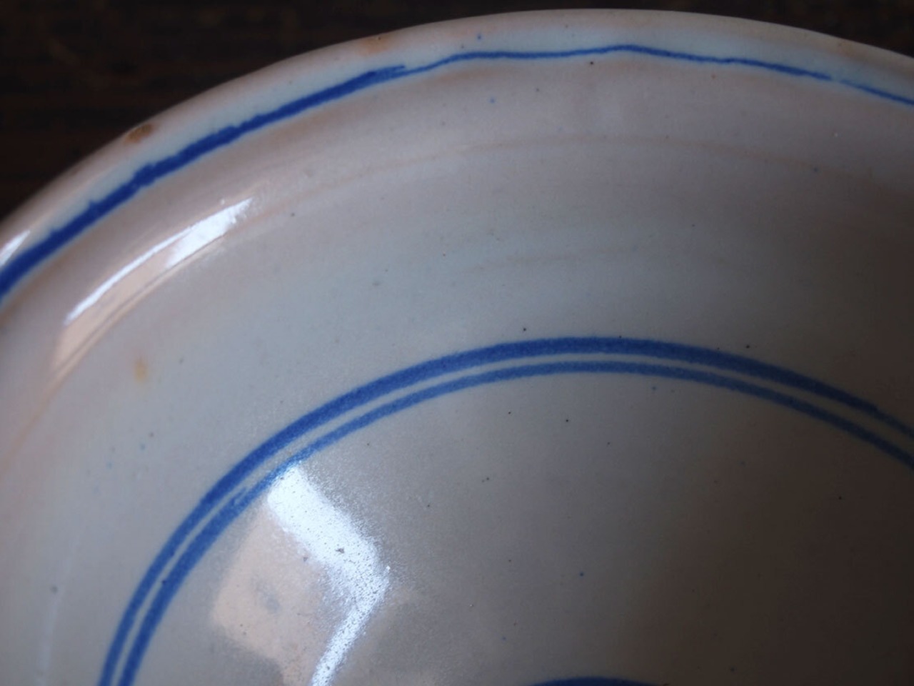 マニセス 白に青いラインの素朴なボウル 鉢 15.4cm サラディエ 陶器 20世紀 スペイン古陶 スペインデルフト アンティーク/K226