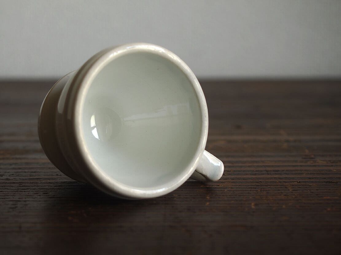 ヨーロッパの蚤の市で入手。1910年代ぐらい。おそらくスペイン、セビージャの陶器。すっぽり手になじむ小ぶりのカップ。深さ4.3cm、底直径3.8cm。わずかに青味を帯びた釉薬、ハンドルの上にヘアラインがあります、写真でご確認いただけます。コレクション、実用にもいかがでしょう。