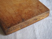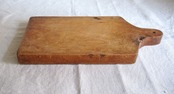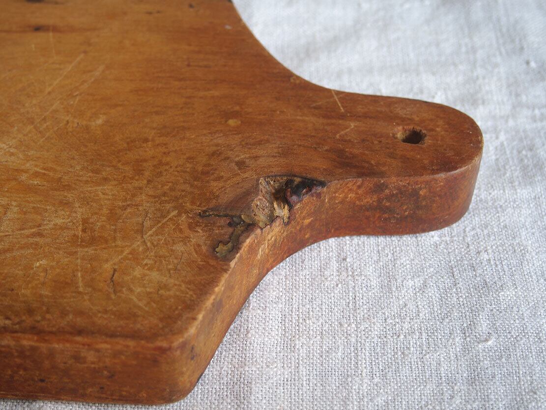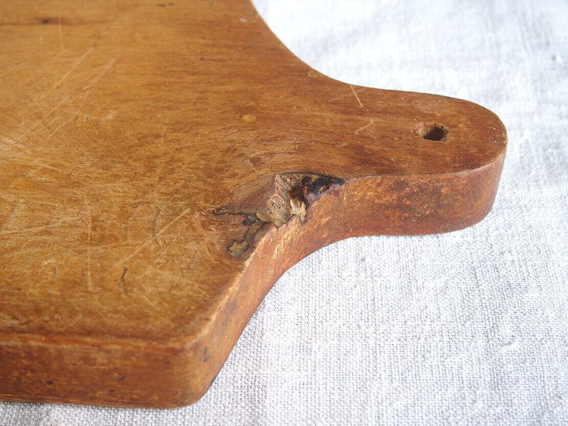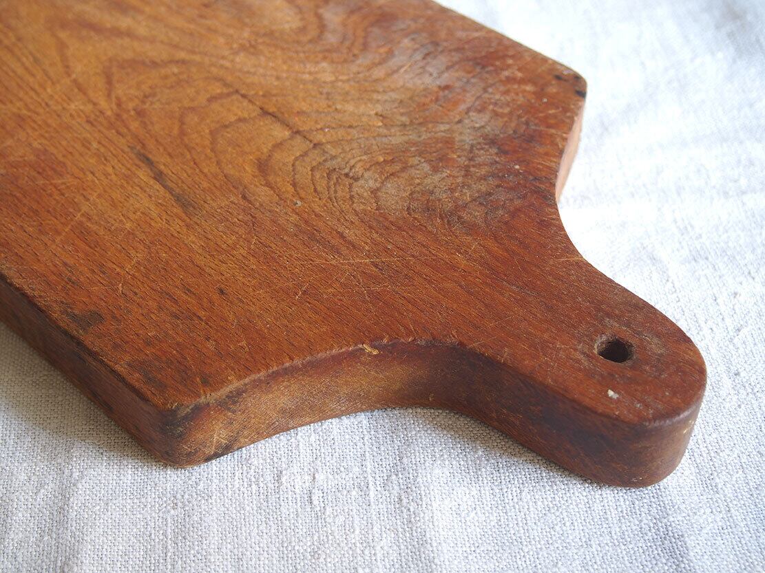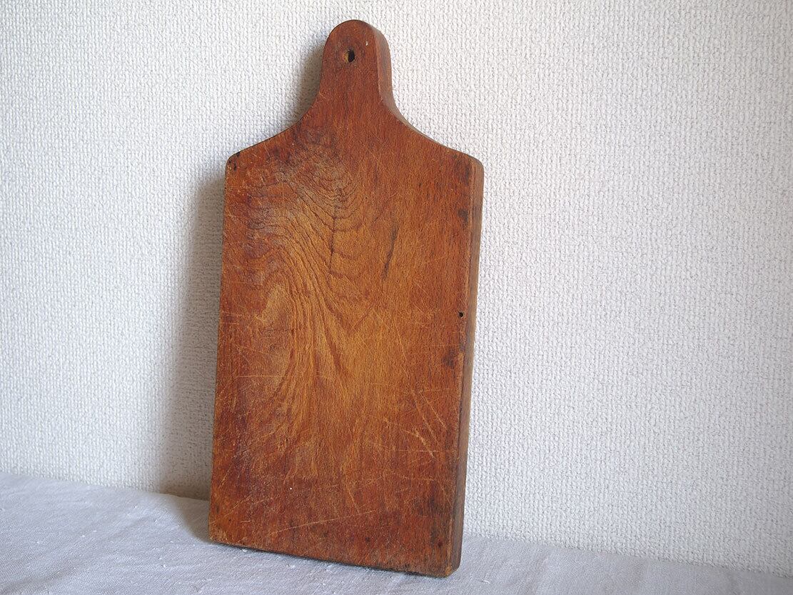 南欧から入手した木製のカッティングボード。1930年ぐらい?年代不明。木の節やナイフ傷などあります。穴の空いている取って部分を除いた長さは約25.5。リメイク、参考資料にも。