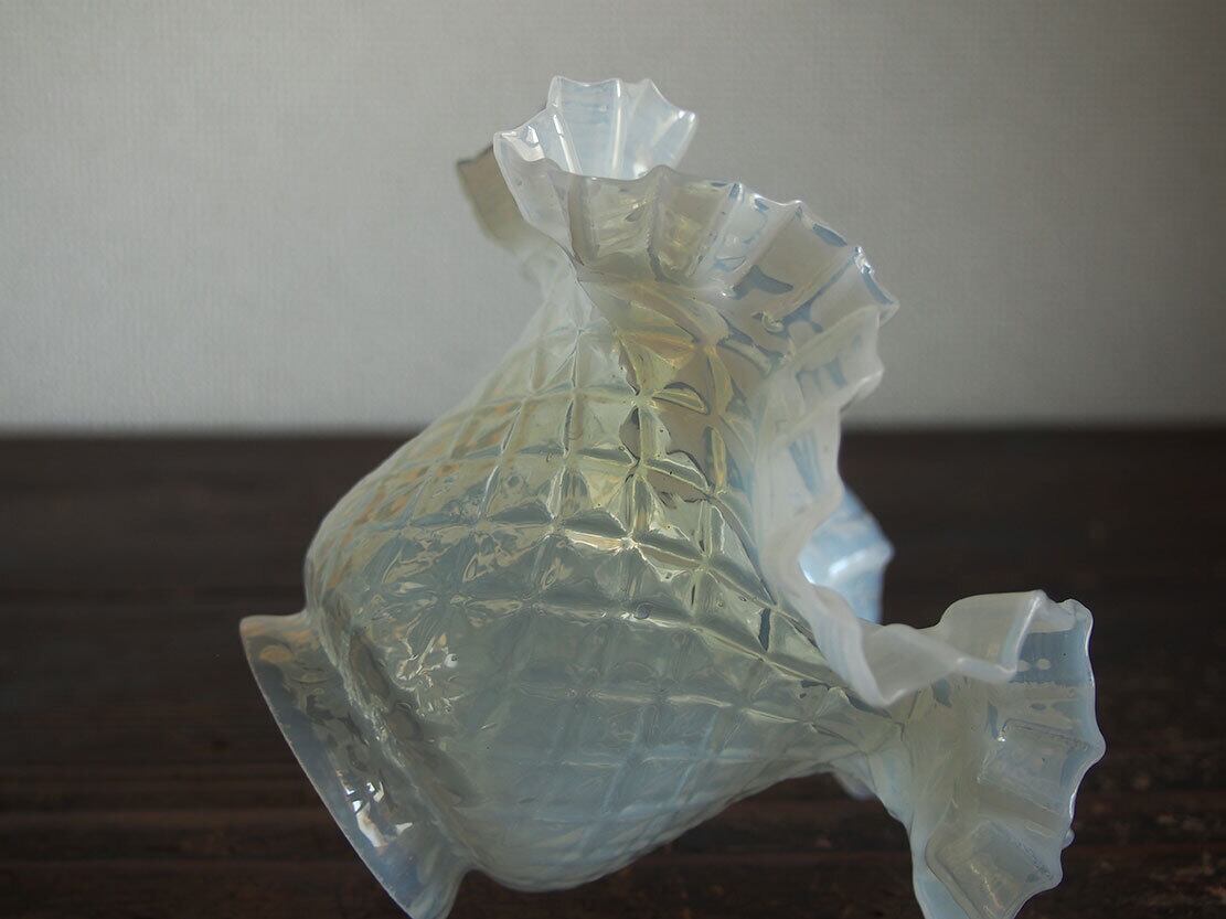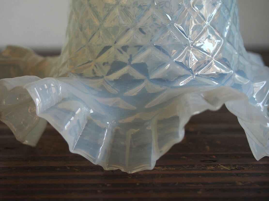 虹色の輝き 格子柄のオパールガラス フリルガラス ランプシェード電笠 直径15.3cm 大正ロマン オパールセント ヨーロッパ フランスアンティーク/K223