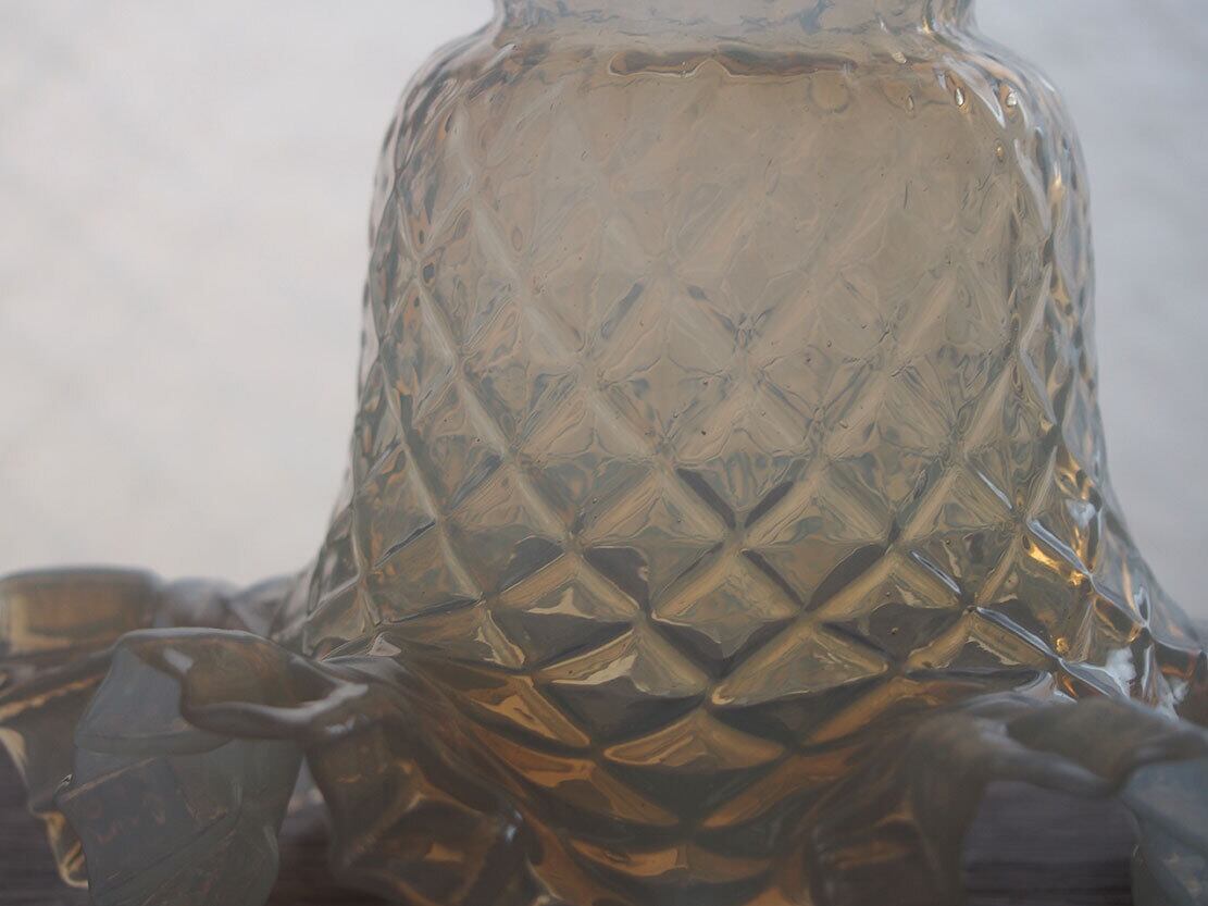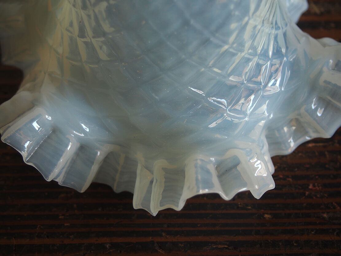 ヨーロッパのアンティーク市にて入手、1930年ぐらい? 美しいハンドメイドのガラスシェード。ソケット挿入口外径5.6cm くびれ部分外径4.5cm くびれ部分内径4.5cm。うっすらと青みを帯びたオパールガラス。比較的薄手の繊細なシェードです。特に目立つダメージの無い良い状態のものです。フリルの部分に短く細かい傷のようなものがありますが、これは製造過程でできたもののようです。日本の規格のソケットE26がご利用いただけます。参考資料、リメイクなどにどうぞ。