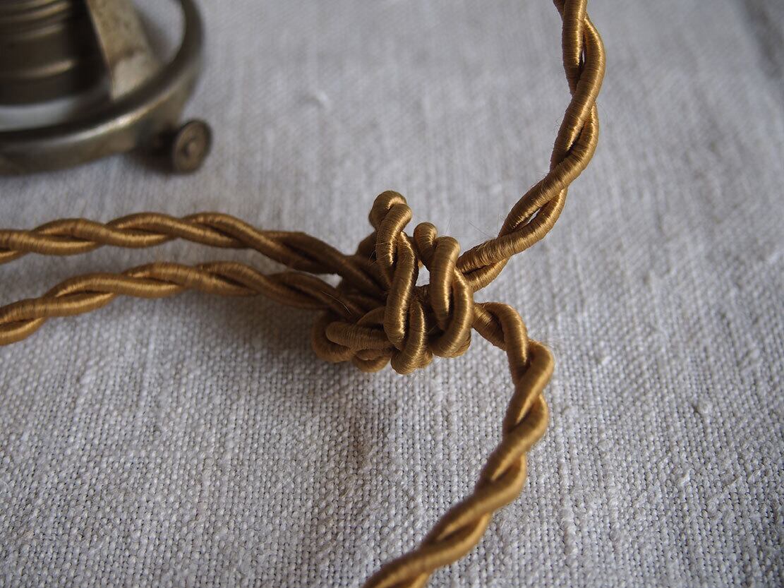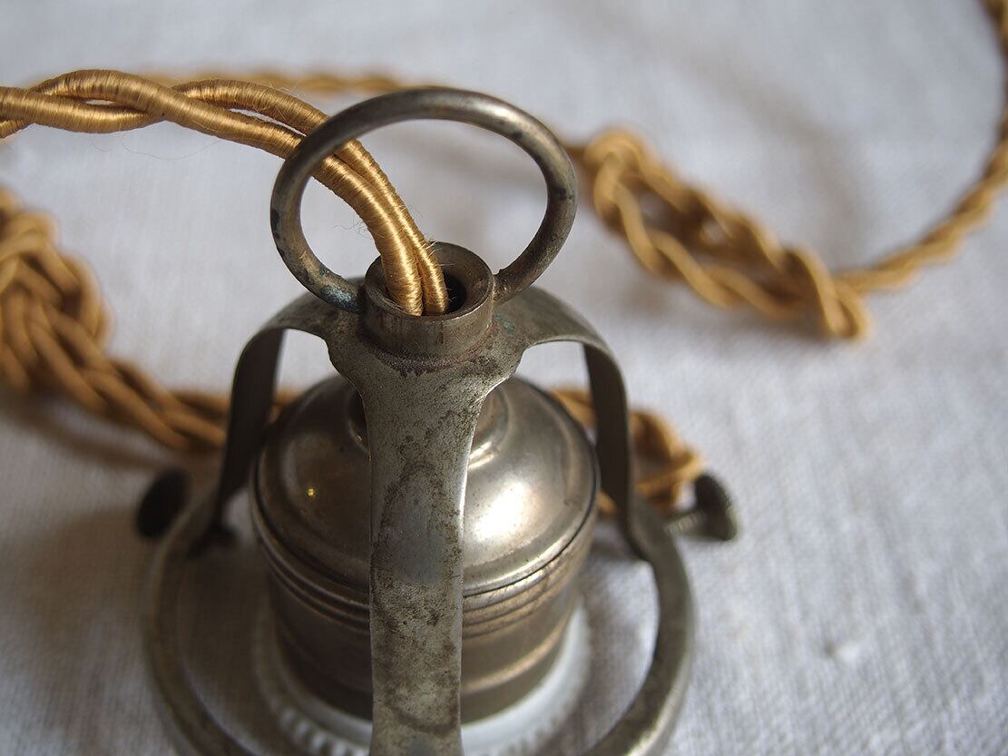 ヨーロッパのアンティーク市にて入手、1940年ぐらい?ペンダントライト用の真鍮照明部品ギャラリー。ソケットを付けるギャラリーの輪部分直径6.3cm、コードのみ100cm。コードは付属していますが、交換して利用することをお勧めします。ソケットの口のパーツは陶器製、写真のように分解可能ですが、古いもので精度がよくないので、ネジ部分の取り付けがスムーズでない場合があります。ギャラリーについているネジ3個少々硬めです。日本で入手できる電球のソケットサイズE26対応。動作確認していますが、古いものなので、商品が届いて万が一点灯しなかった場合は恐れ入りますが、お客様の方で修理をお願いします。参考資料、リメイクなどにもどうぞ。*電球はお取引に含まれません。