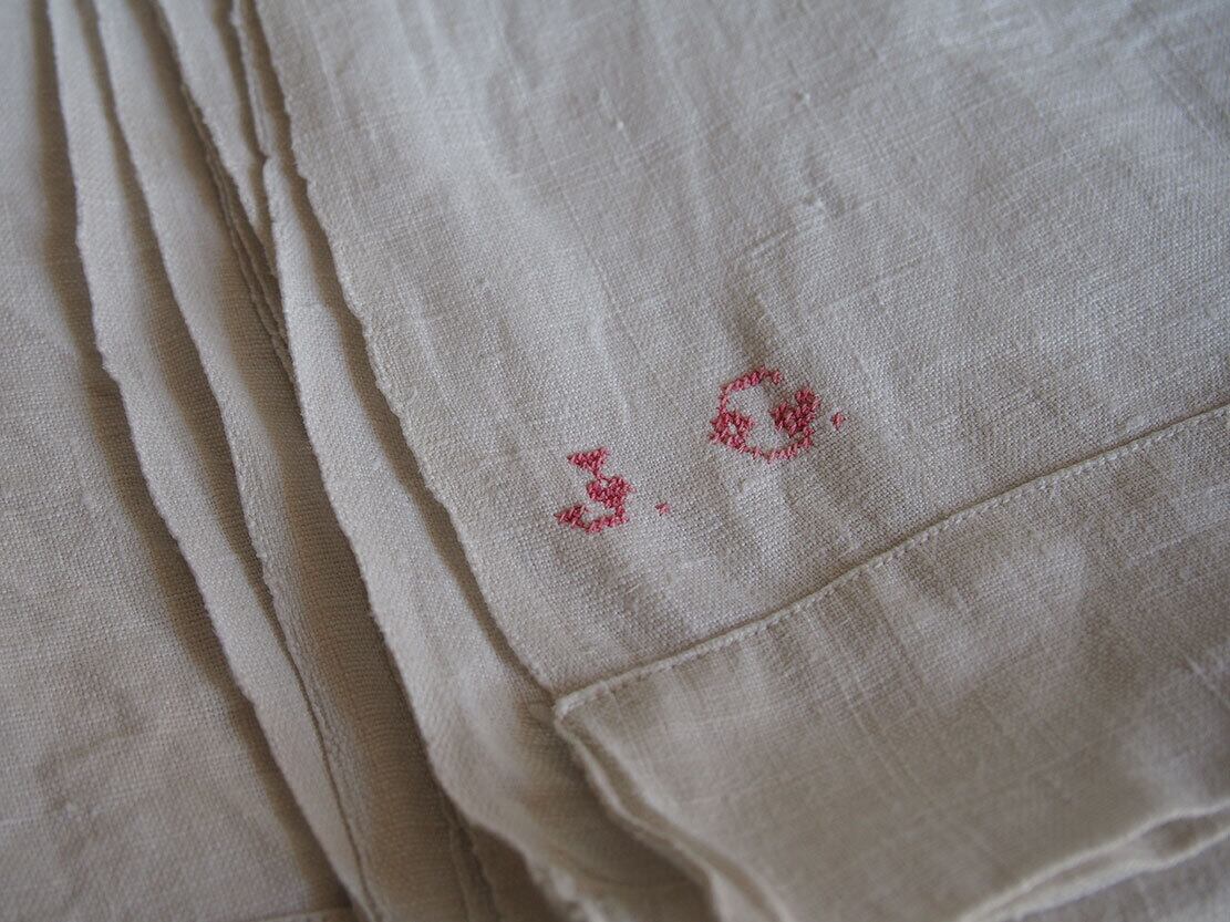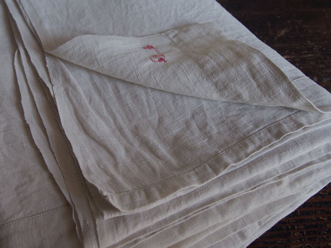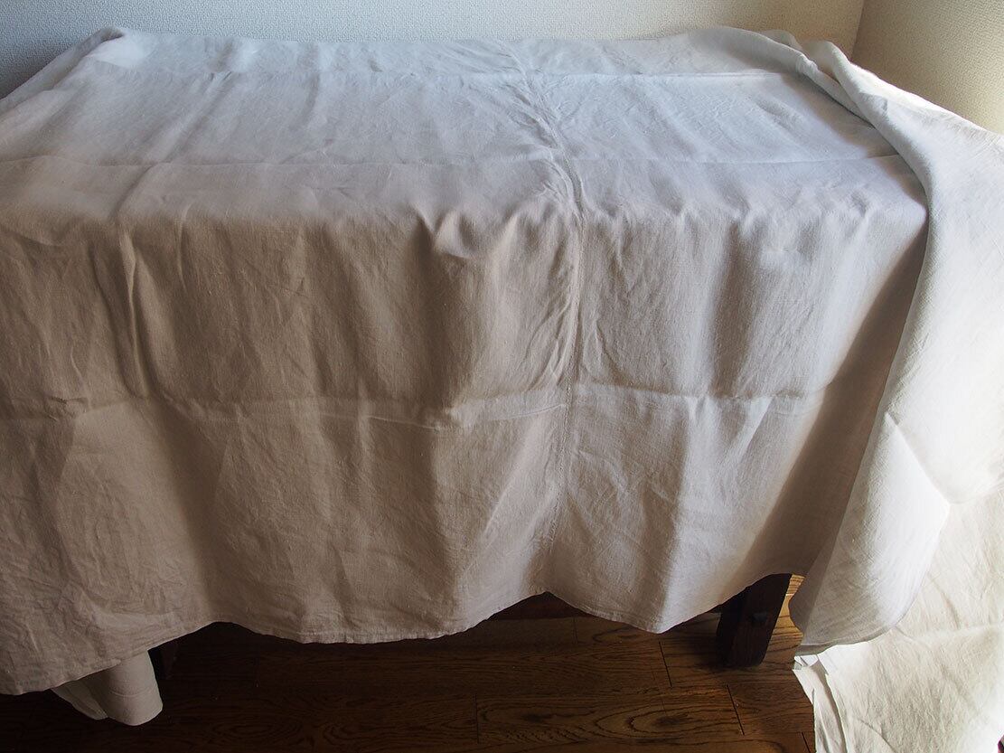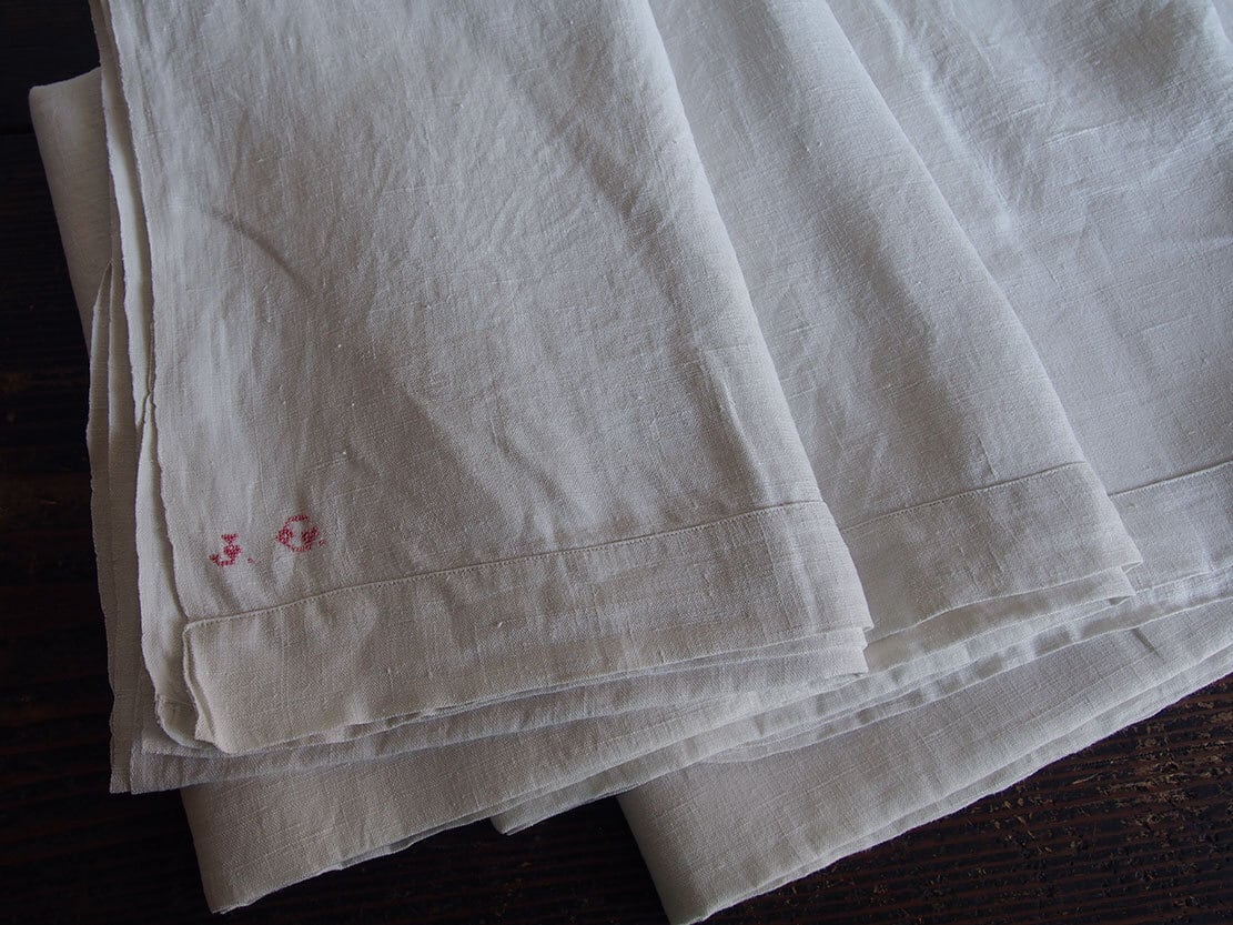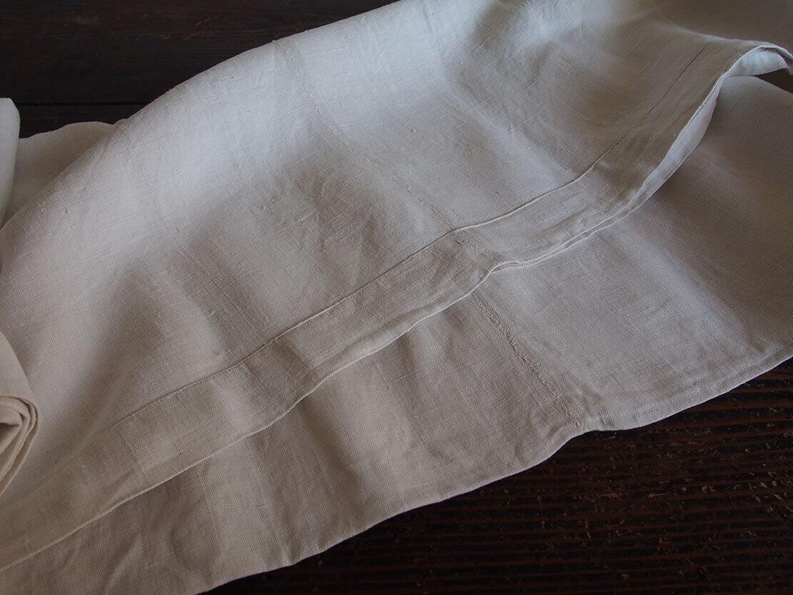 欧州のアンティーク市にて入手。1930年ぐらい。 中央に幅を広くするための継ぎ目あり、2枚ハギ。昔は幅広の織機が普及していなかった為、数枚を継いで幅の広いシーツを作っていました。角に小さなクロス刺繍のイニシャルJOあり、洗濯場で他の家庭のシーツと間違えないように刺されたものです。 昔のナイティなどにも利用された、素朴な平織りリネンです。洗濯済み。昔の手作業をお楽しみ下さい。参考資料、リメイクなどにもどうぞ。ファブリック、衣装、手芸関連を得意としております。他の商品も是非ご覧下さい。