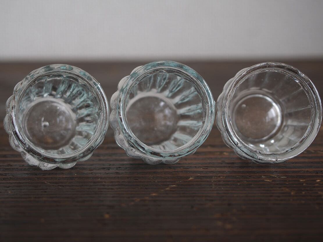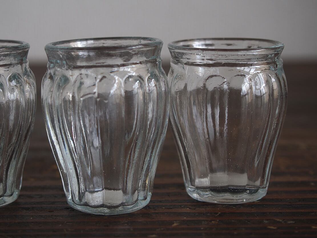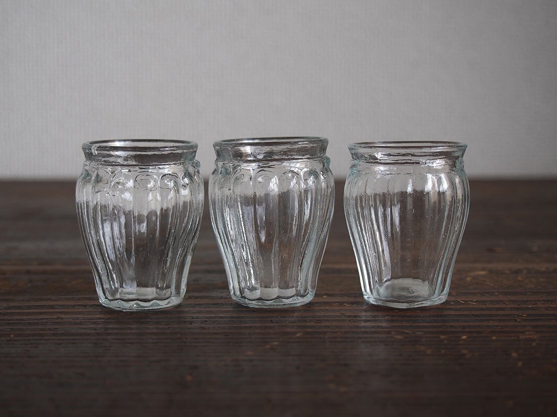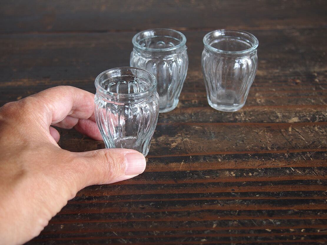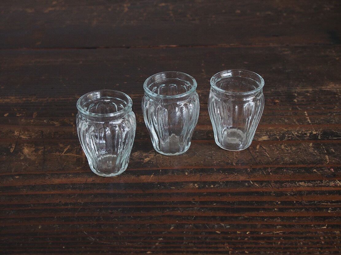 南欧のアンティーク市にて入手。小さなプレスガラスのグラス3個。昔のビストロなどで使われたもの、またはノベルティでしょうか?。口が細くなっているので髪や布を置いて紐で留めて使ったのかもしれません。小さな気泡や歪みがあります。1個の重さ約約34g。特に目立つダメージはありません。参考資料、リメイクなどにもどうぞ。バラ売はいたしません。