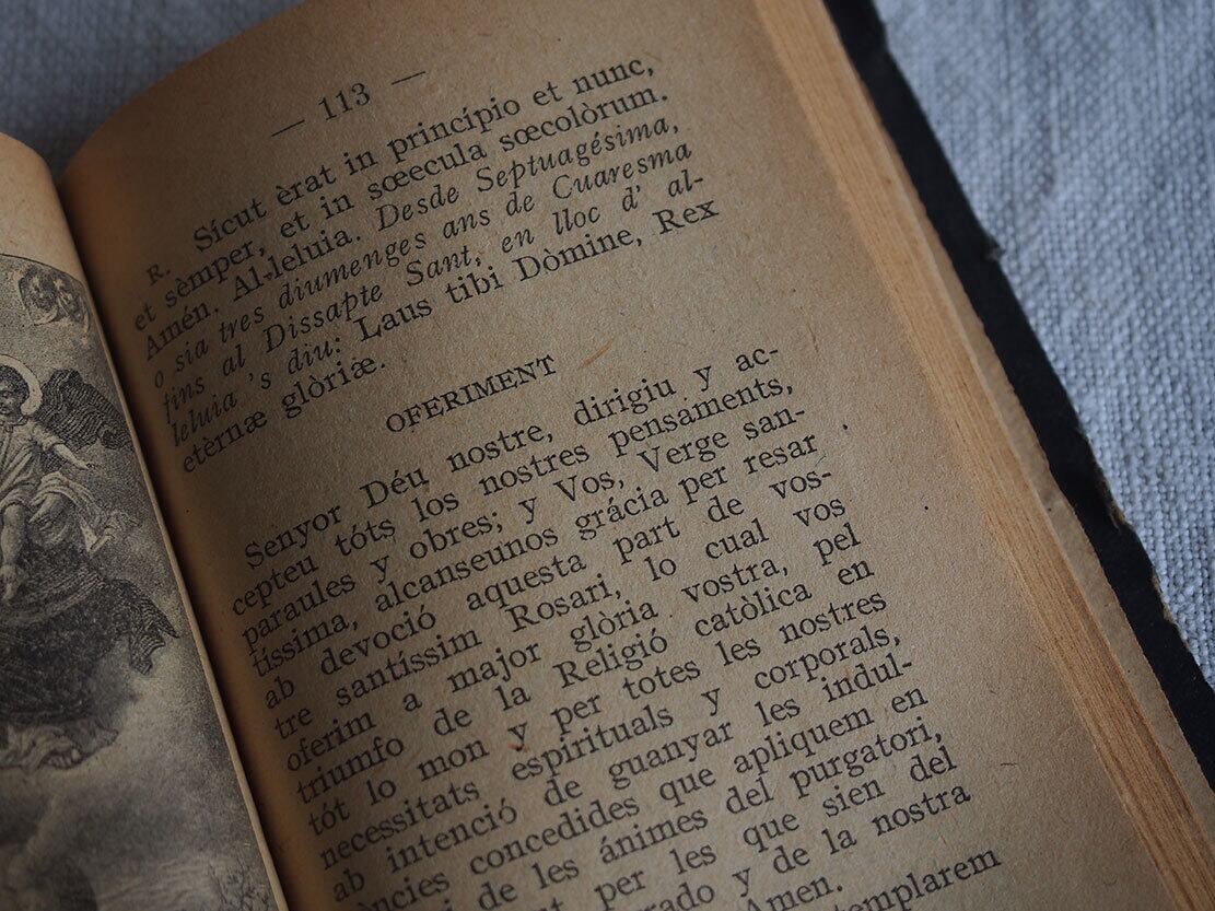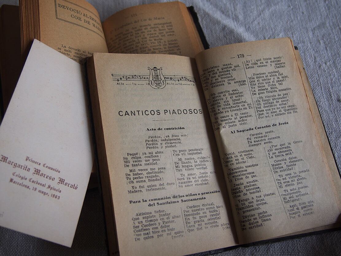 1924年と1935年に出版されたカトリック関連の古い本、2冊。表紙はどちらも美しいエンボス模様が施されています。90年以上も経過した古い典礼書です、経年による置きシミなどあります。全ページを確認していません、書き込みなどあるかもしれません。挟まっていたカードも付属します。置いておくだけで存在感のある古い本です。