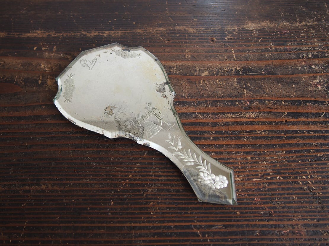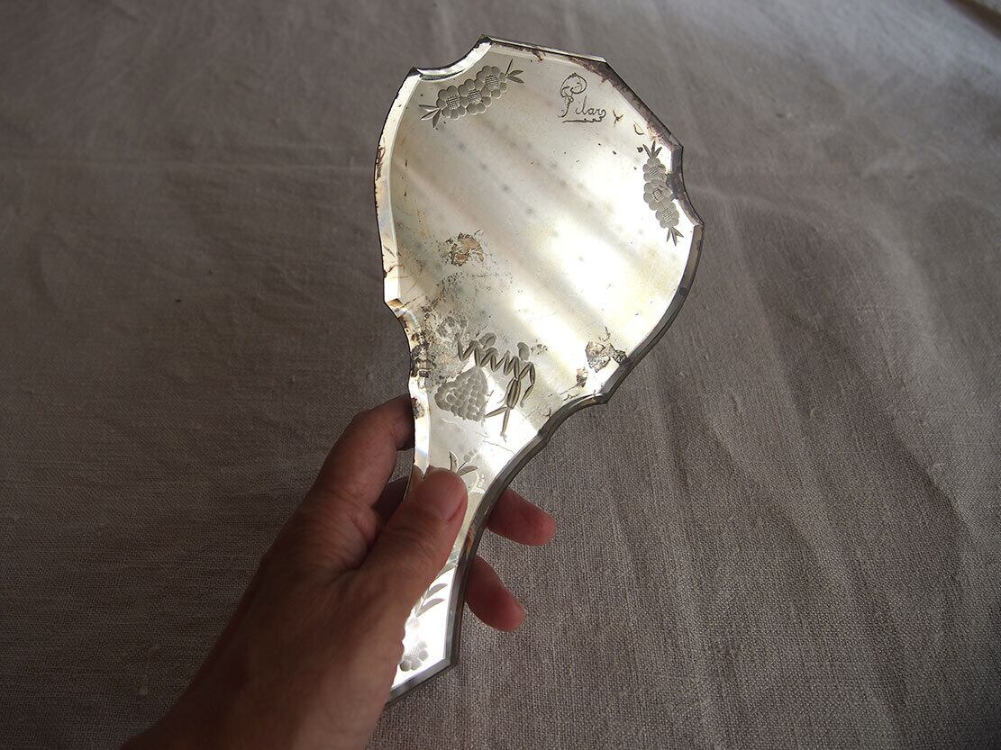 彫刻の施された古い手鏡 ハンドミラー 1900年 ガラスエッチング 南欧 フランス 家具 アンティーク/K271
