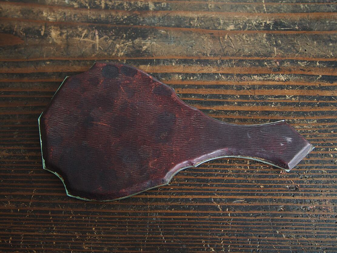 南欧の骨董市にて入手、1900年ぐらい?。古い手鏡、上部に名前が彫られているようなので、贈り物としてオーダーされたものでしょう。ダンスをする?男女や花の彫刻もほどこされています。裏面はエピのエンボス模様の革張りです。ご覧のように傷や腐食などあります。リメイク、参考資料にも。