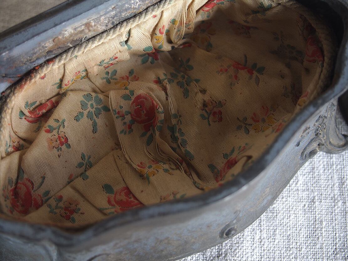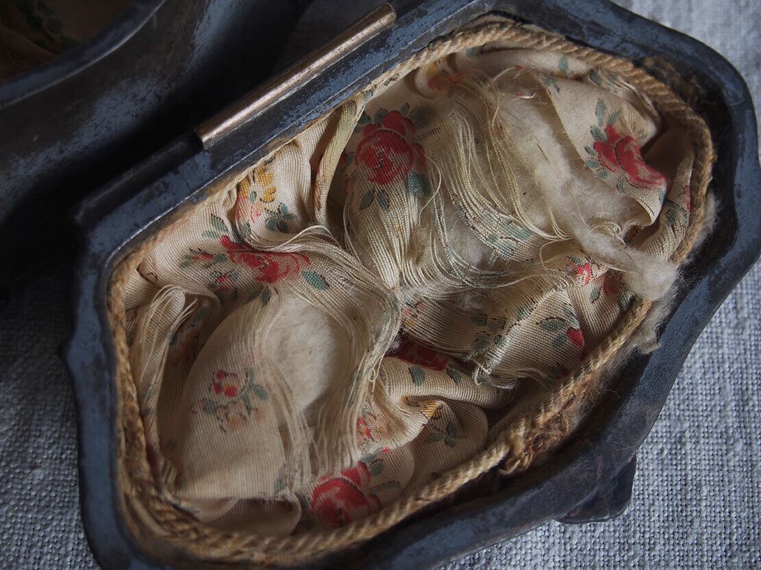 ヨーロッパのアンティーク市にて入手。美しい植物のレリーフの宝石箱、曲線的な装飾が特徴です。裏に "W.B. Mfg. Co" 362の刻印があります。Weidlich Brothersという会社の物のようです。蝶番の破損、本体の亀裂の修理、内部のクッションは絹、100年以上の時代を経てきたものなので、ご覧のように劣化があります。