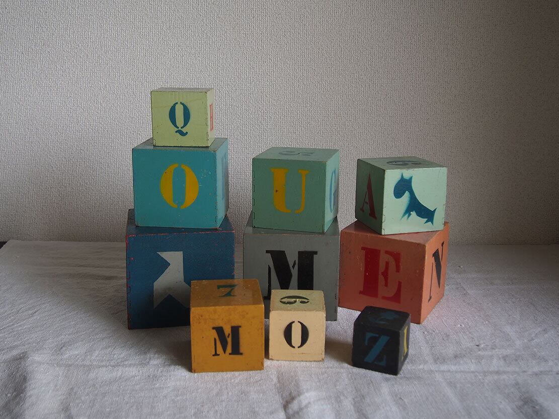 アルファベットの柄 古いネスティング積み木10個 入れ子 インテリア スタッキングブロック デコレーション アンティーク/K277