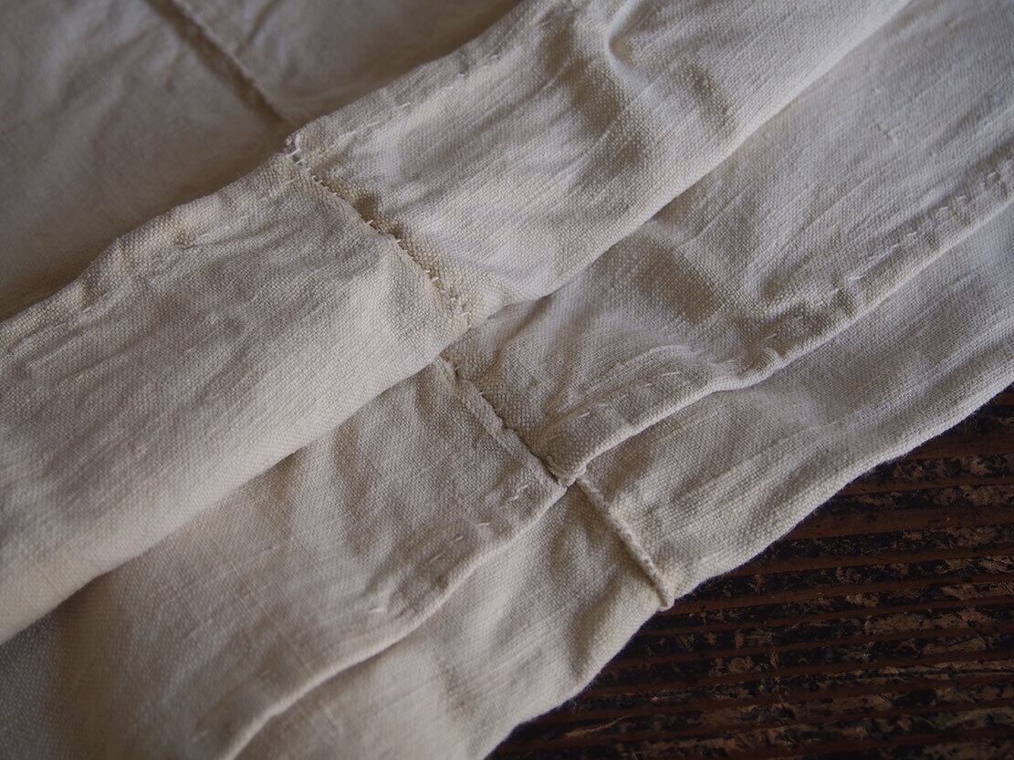 欧州のアンティーク市にて入手。1940年代ぐらい。色は真っ白ではなく未晒しの生成り。幅を広くするための手縫い継ぎ目あり、2枚ハギです。昔は幅広の織機が普及していなかった為、数枚を手縫い継いで幅の広いシーツを作っていました。少々厚手の固い手触りの平織生地。 薄いシミががあります、写真参照。他には特に目立つダメージは見当たりませんでした。洗濯済み。1点モノです、量産品ではないので同じ物はありません。昔の手作業をお楽しみ下さい。参考資料、リメイクなどにもどうぞ。ファブリック、衣装、手芸関連を得意としております。他の商品も是非ご覧下さい。