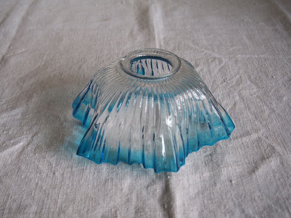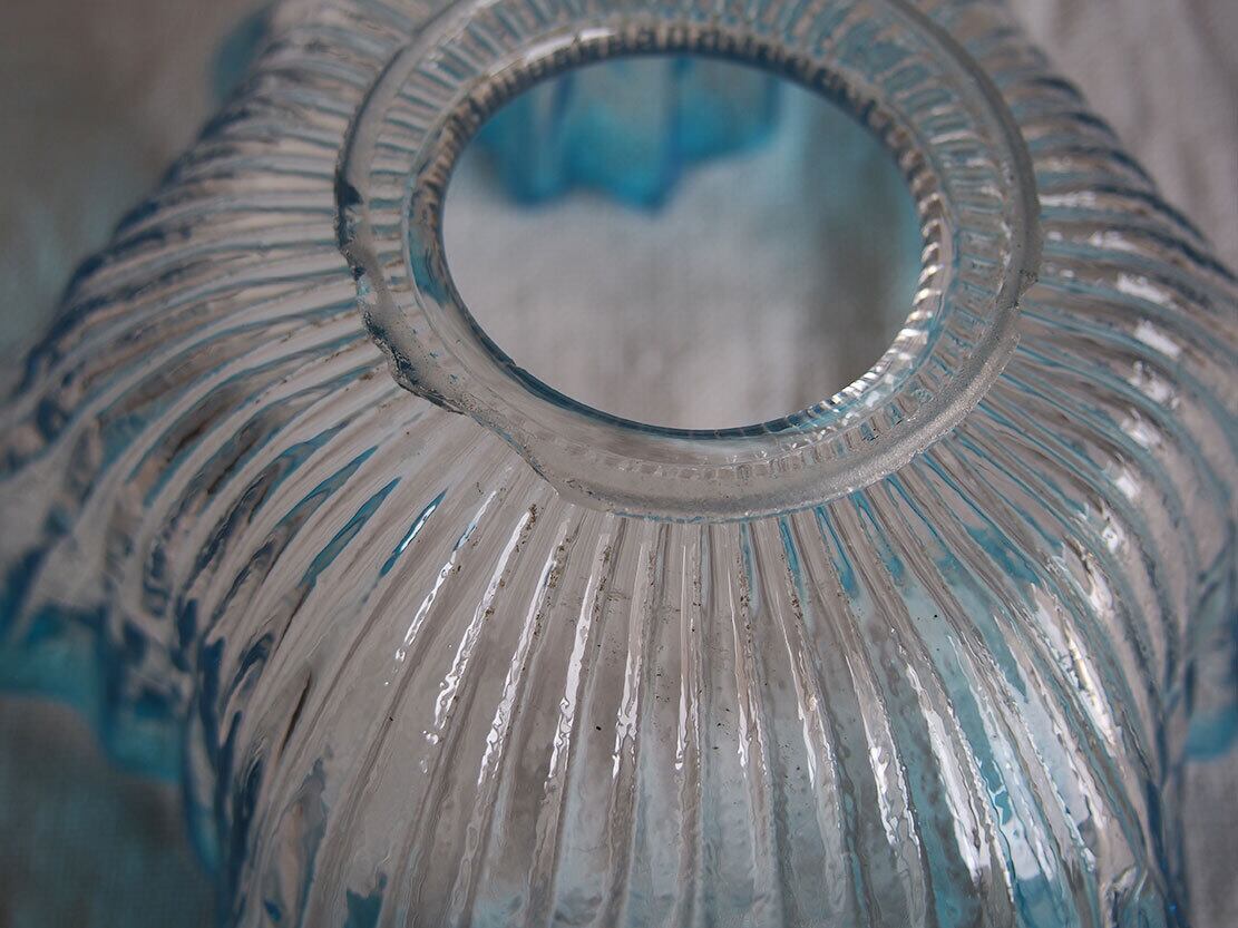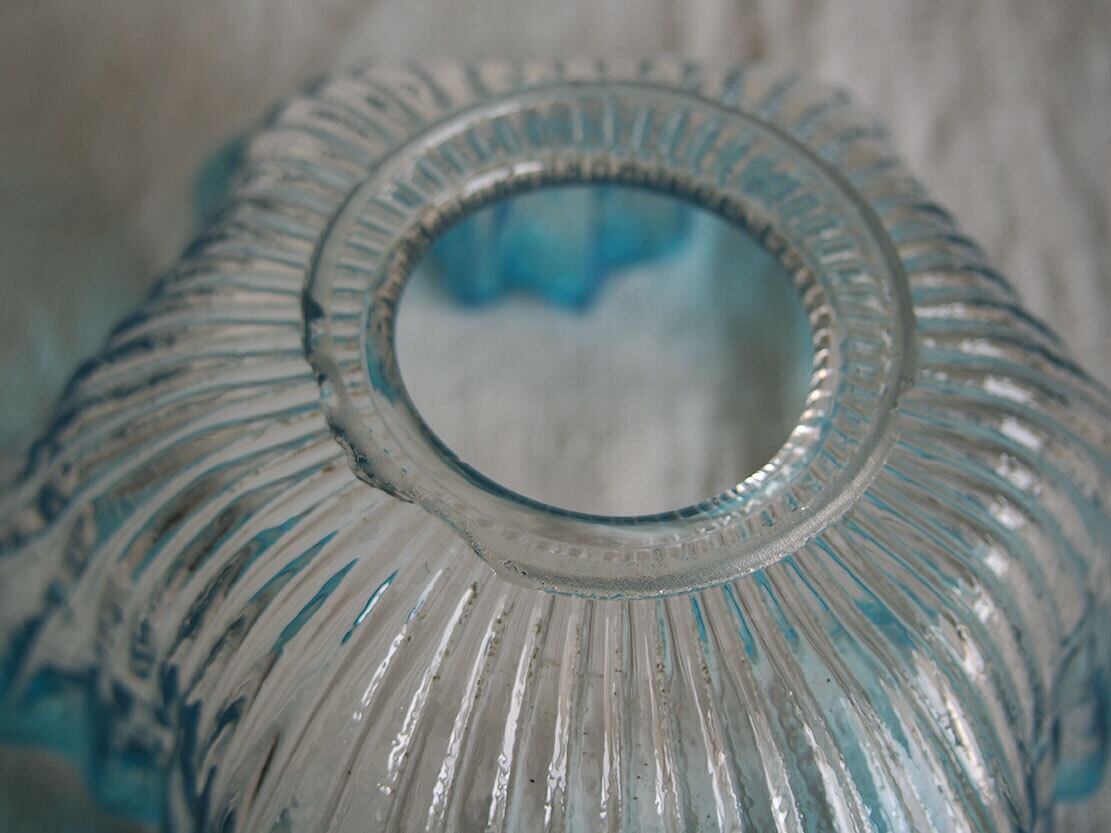 ヨーロッパのアンティーク市にて入手、1930年ぐらい? 美しいハンドメイドのガラスシェード。フリルの縁にセルリアンブルーのグラデーション。ソケット挿入口外径6cm くびれ部分外径5cm くびれ部分内径4.4cm。ギャラリー取り付け部分に小さな欠けがありますが、ご利用には差し支えない程度のものです。ほかには特に目立つダメージの無い良い状態のものです。日本の規格のソケットがご利用いただけます。参考資料、リメイクなどにどうぞ。