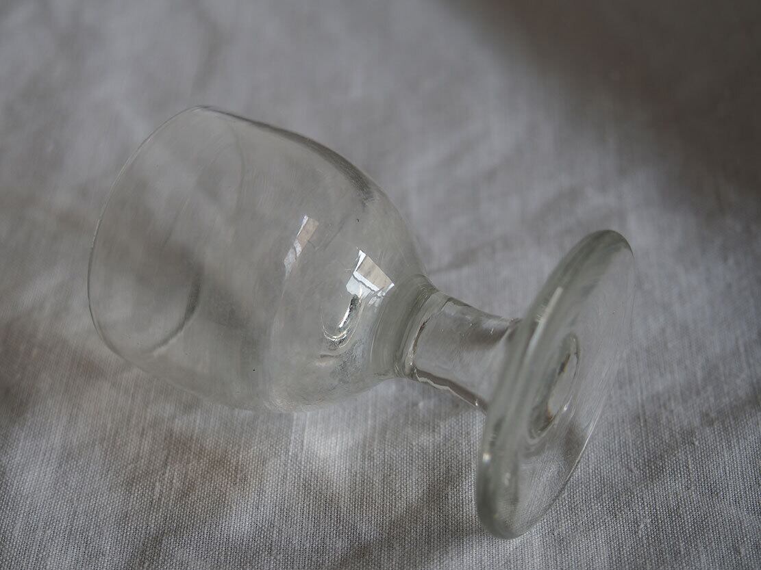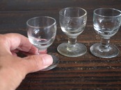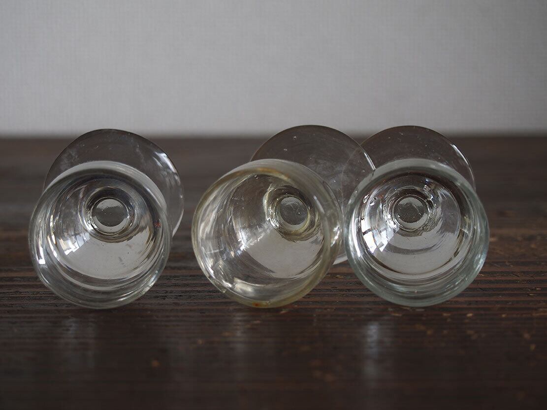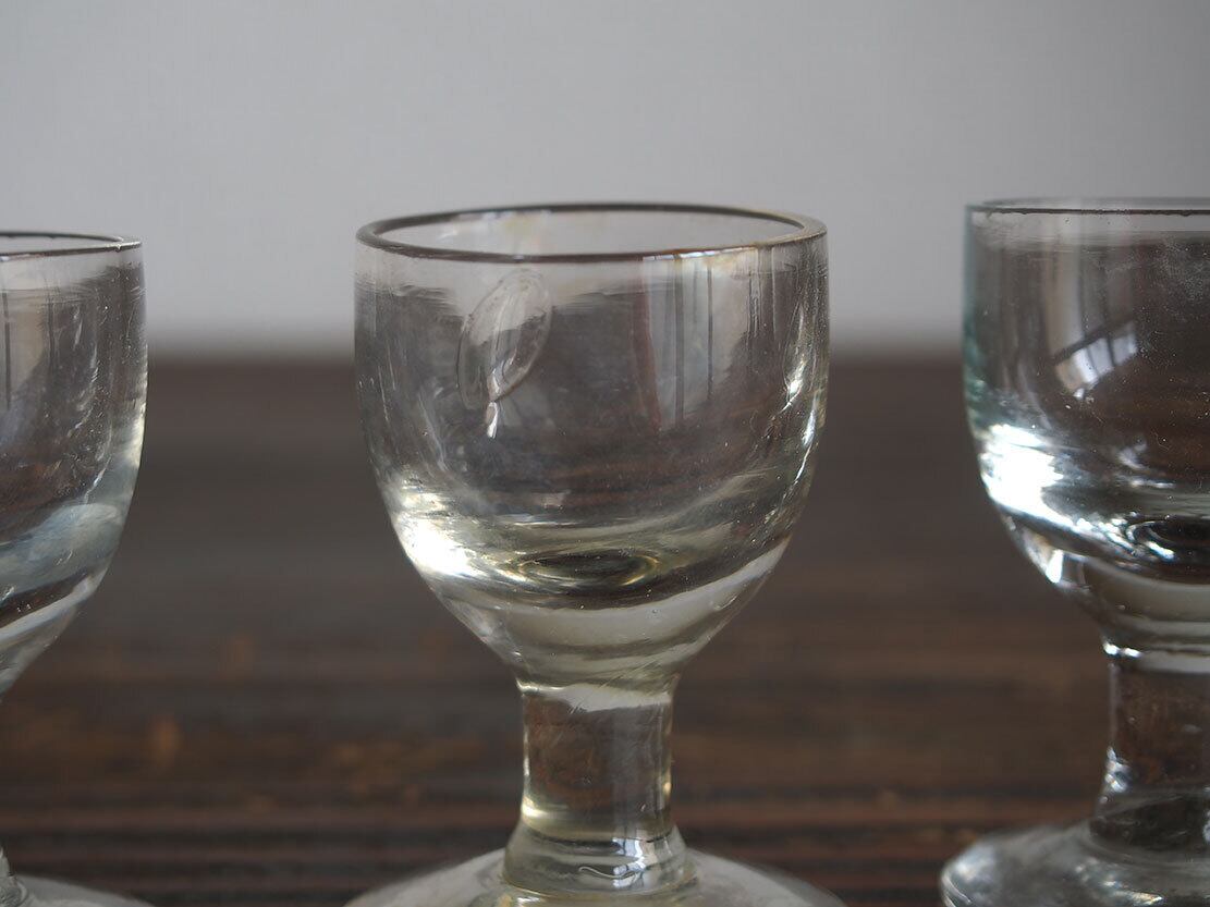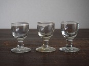 南欧のアンティーク市にて入手。食後のアルコール度数の高いお酒を飲むために使われたグラス、3点。1900年代前半。気泡が入っていたり、歪みなどある昔のグラスです。特に目立つダメージはありません。参考資料、リメイクなどにもどうぞ。*バラ売りはいたしません。