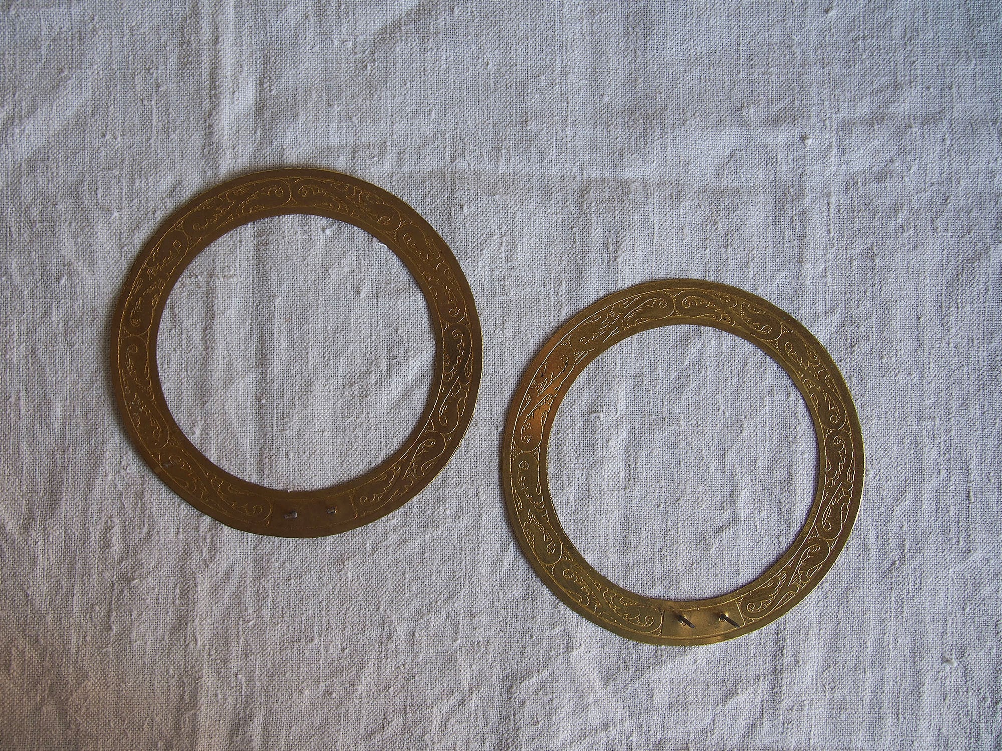 幼子イエス像や聖母マリア像に取り付ける金属製の光輪2点、真鍮板製に打ち目模様を施してあります。古い像は紛失している物が多いため、光輪と言えども高値で取引されています。数少ない工房で現在でもこのような冠や光輪はわずかに作られています。多少のくすみや歪みなどあります、詳細は写真でご確認ください。ばら売りはいたしません、2点セットでの販売です。