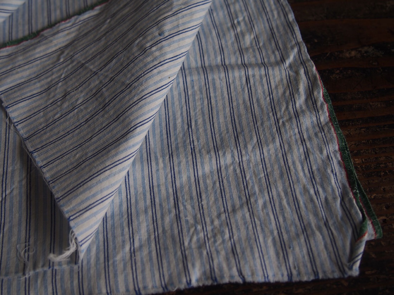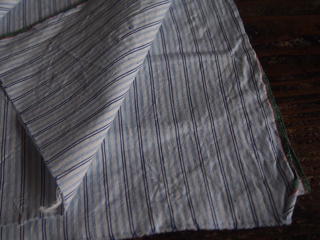 ヨーロッパのアンティーク市にて入手、1960年ぐらい?。長い間かけて収集したヴィンテージファブリックの一部を出品します。織柄の青系の濃淡2色のストライプ生地、未使用品。耳に見える黄色いものは生地メーカー名がプリントしてあるものが滲んでいます。古い生地です、ご覧のように折りたたんで保管してあった一番外側の部分に黄ばみが残っています、洗濯済。特に生地の弱りや摩耗などはありません。インテリア、衣類、ドールの衣装などの小物の製作に。デザイン、縫製の資料などにも。アンティーク衣装、ファブリックを得意としています、他の商品も是非ご覧ください。