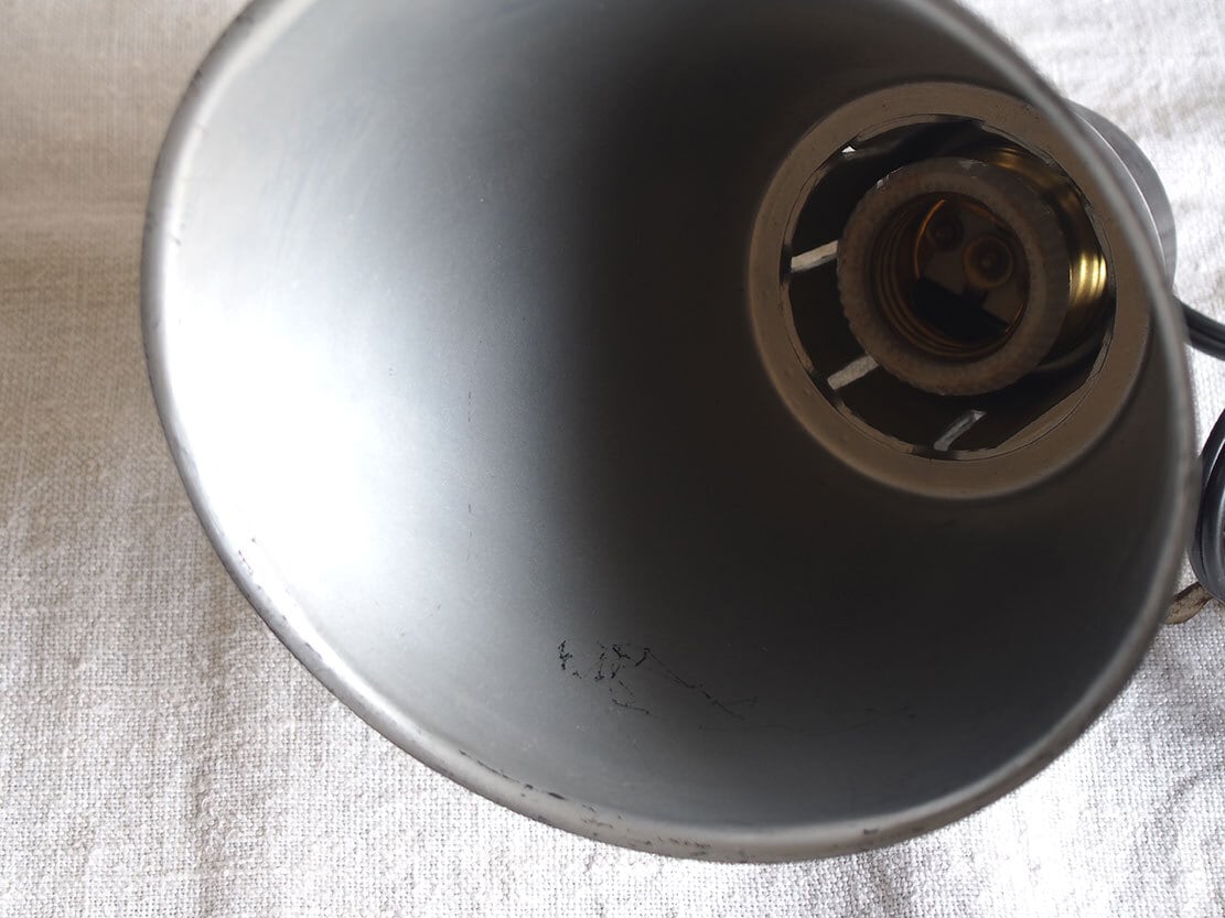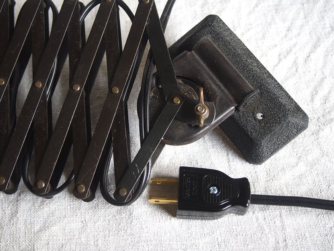 ヨーロッパのアンティーク市にて入手、1950年ぐらい?蛇腹ライト、黒。コードは長さ70cm~90cm。シェード直径14.2cm×14cm、台10cm×5cm。ソケットは日本でも一般的な規格のE26。シェード付け根、アームの付け根で自在に稼動します。シェードの上部には蛇腹ライトの刻印があります。蛇腹の伸縮は古い割にはスムーズです。シェードは樹脂製(ベークライト?)。アームにサビ少々あります。未使用品デッドストックで入手しました、コードはついていなかったので当店で配線、中間スイッチをつけました(コード、中間スイッチは日本で入手)。動作確認していますが、古いものなので、商品が届いて万が一点灯しなかった場合は恐れ入りますが、お客様の方でメンテナンスをお願いします。参考資料、リメイクなどにもどうぞ。*電球は付属しません。