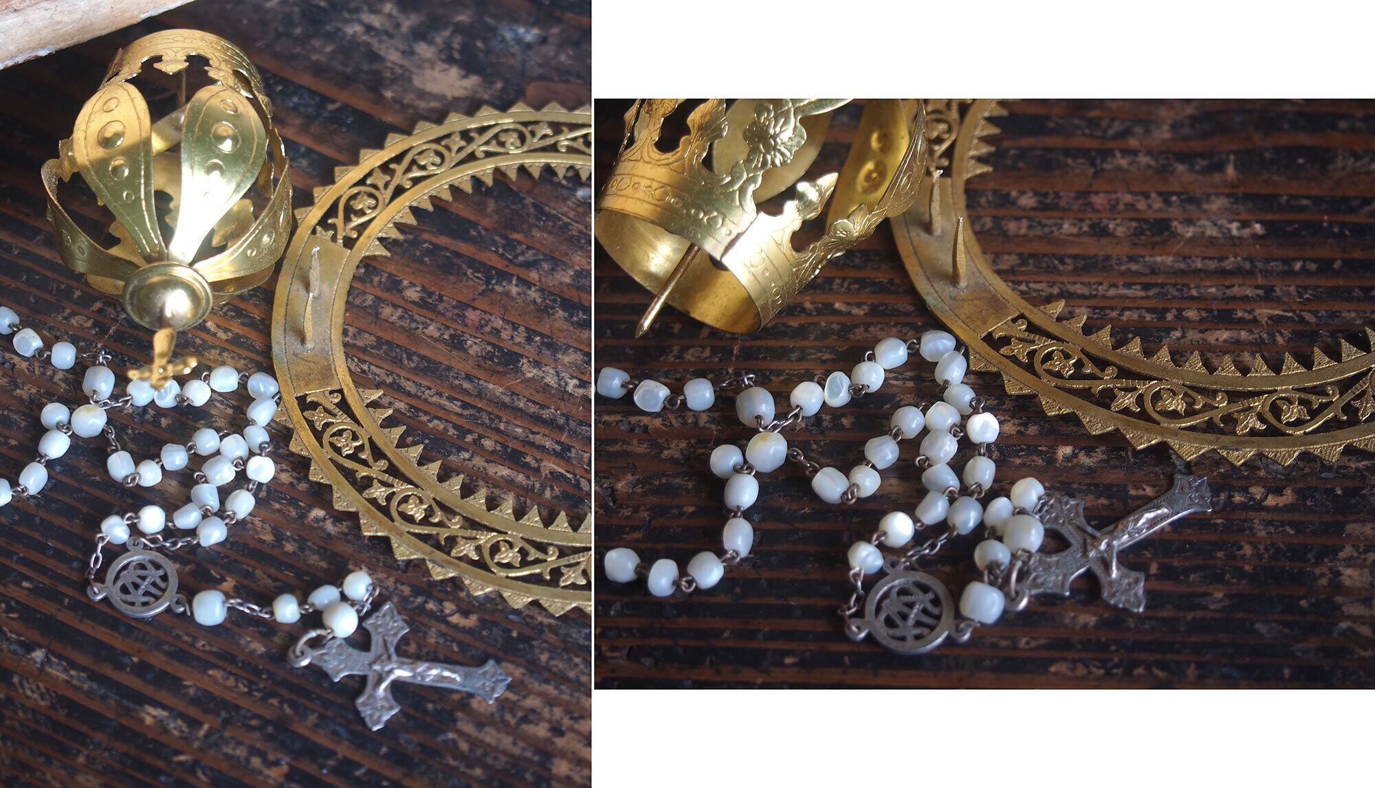 ファティマの聖母像、マザーオブパールのロザリオ付き。1950年代前後。主な材質はウッドペーストという木粉を樹脂と混ぜた物。塗装は全て手描き。台座に虫食い穴が2箇所程度有ります。多少のキズ、欠け、小さな傷や塗装のハゲ、またはそれらを目立たなくするための手入れ及び塗装程度はしてあります。 バックスタンプ有り、18世紀より秀作を数多く欧州各地に送り出したスペイン、オロットの物。高さは光輪上から台座下まで。破損防止のため光輪を取り外してお送りします。日本では見られない様な珍しい古い聖人像を多数取り扱っています。1点1点工房で手作りされた像、職人の腕によって同じ物はひとつとありません。この機会をお見逃し無く。 現在でもこのような聖人像を作っている工房は現存しますが、(実際に訪れて見学しました)このイエス像と同じ材料、製法では作られてはいません。残念なことですが、着色のテクニックも全く劣ります。 この機会をお見逃し無く。