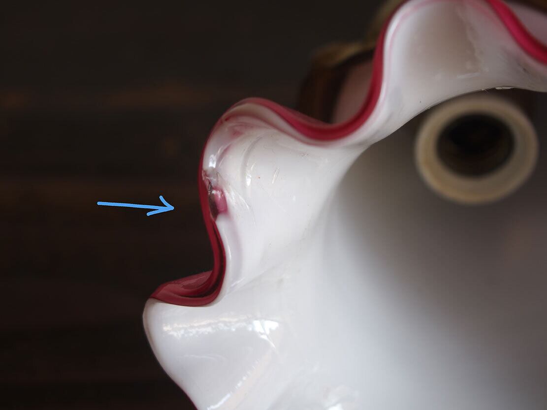 ヨーロッパのアンティーク市にて入手、1960年ぐらい?。本体金属製、金属アームの上からシェード下まで21cm、シェード高9.5cm 直径12.5cm。向かって左側の色の薄い方のシェードの縁から内側にに目立たない欠けがあります。よく見たらわかると思いますが、向かって右側のアームの上の葉に欠損があります。電球は付属しませんが日本でも入手が容易な規格E14。動作確認していますが、古いものなので、商品が届いて万が一点灯しなかった場合は恐れ入りますが、お客様の方でメンテナンスをお願いします。参考資料、リメイクなどにもどうぞ。*ガラスシェードはお取引には含まれません。