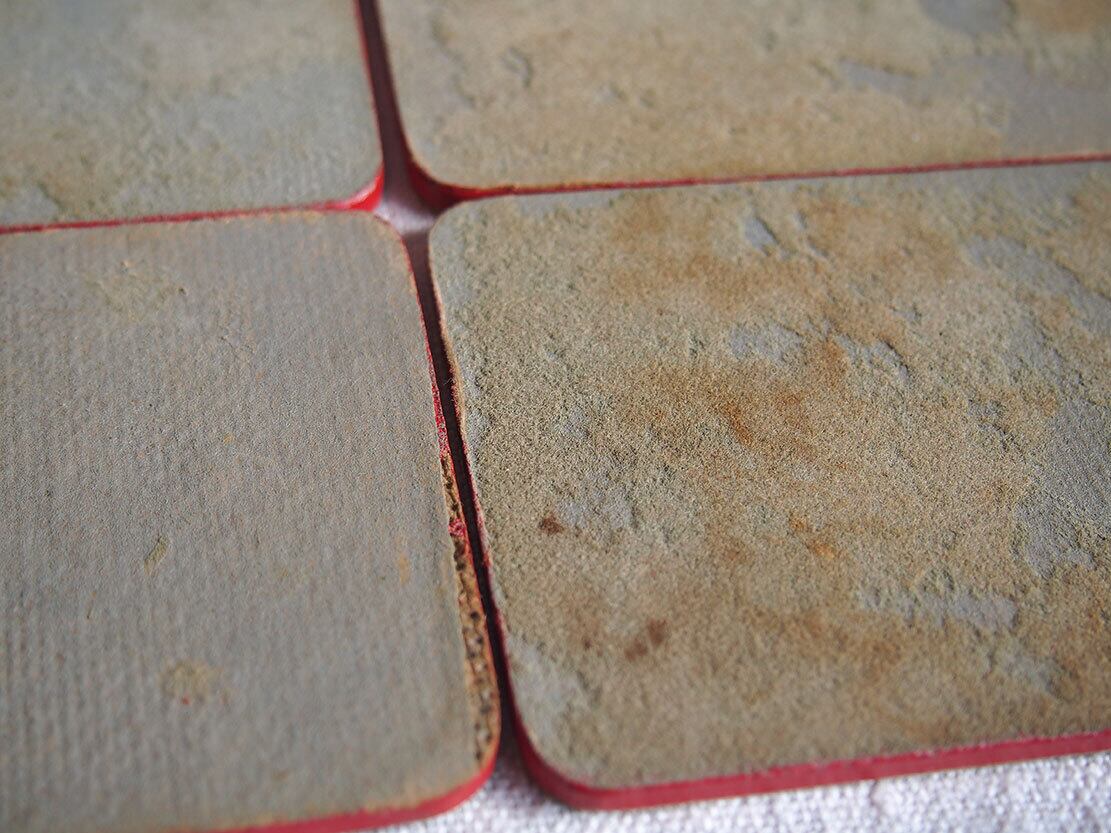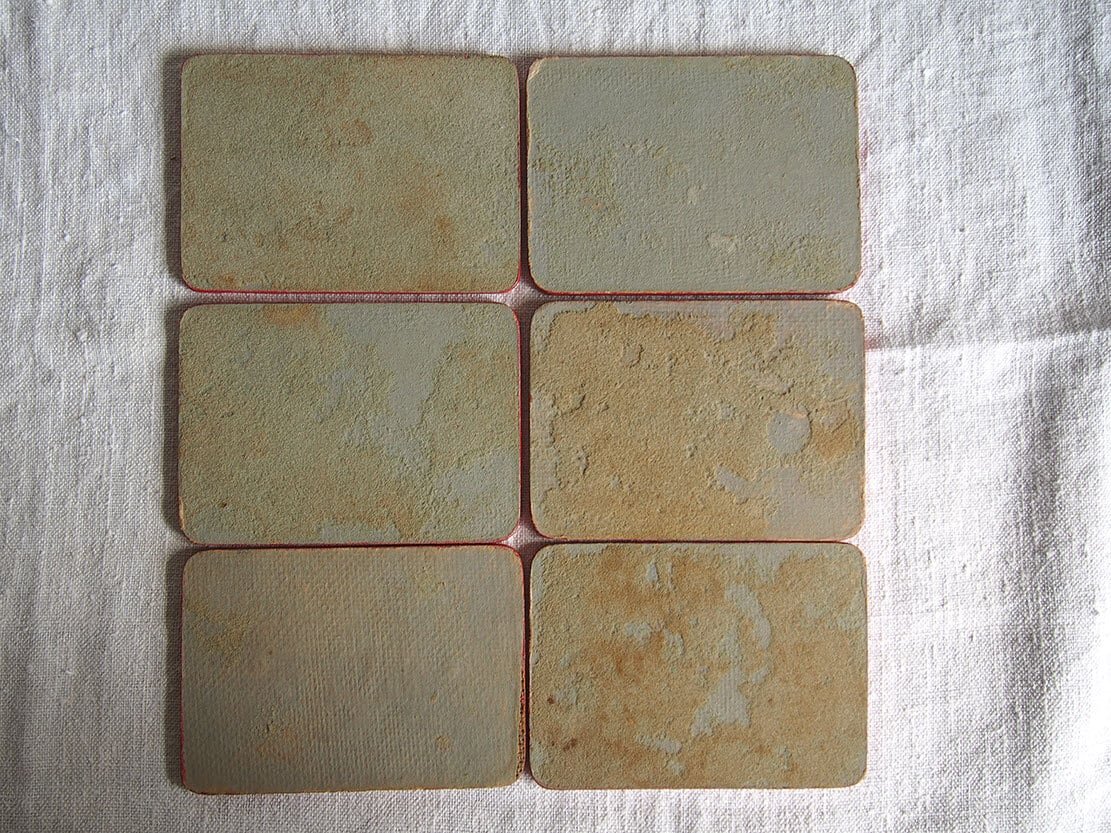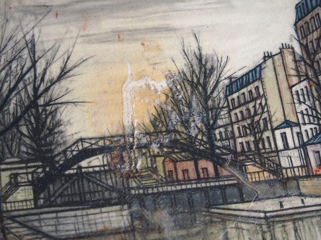 南欧のアンティーク市にて入手。パリ出身の画家ベルナール・ビュッフェのコースター5枚セット 1950年代ぐらい。樹脂にプリントされた絵画が木の板に貼り付けられたものです、裏面には薄いフェルトが貼ってあります。汚れなどあります。写真でご確認ください。参考資料、リメイクなどにもどうぞ。バラ売はいたしません。