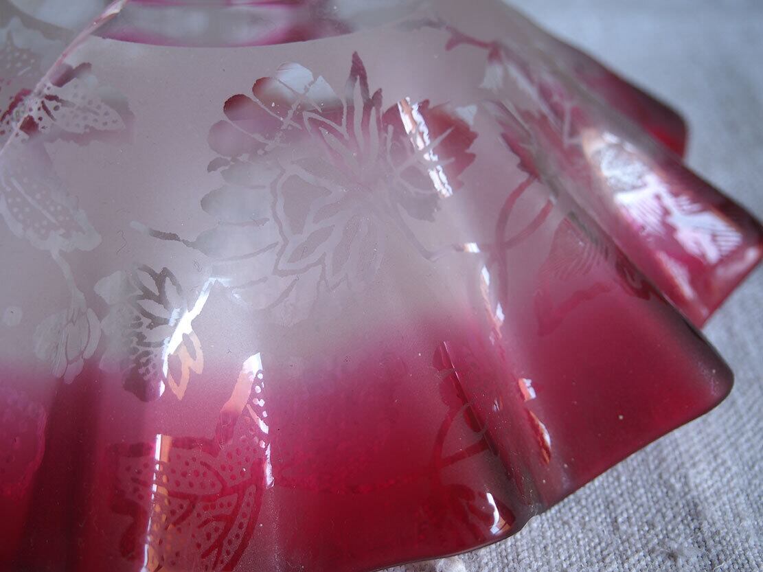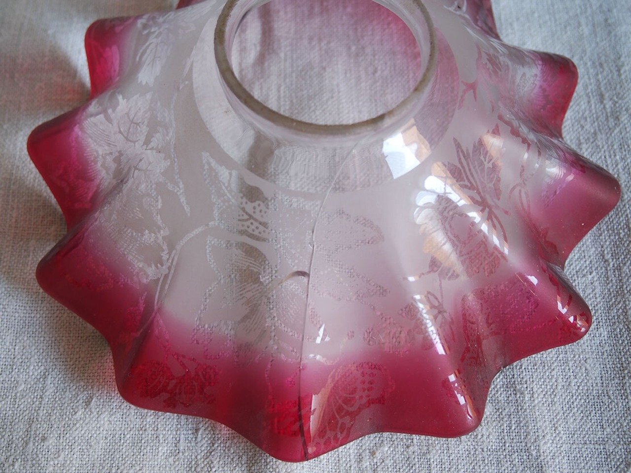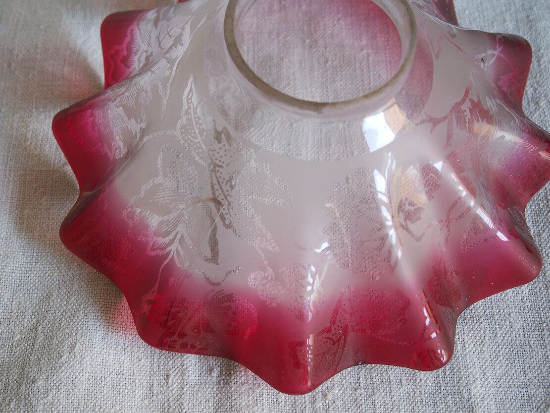 磨りガラスに植物モチーフ ピンク色 フリルガラス ランプシェード電笠 直径20cm アール・ヌーヴォー 大正ロマン ヨーロッパ アンティーク/K345