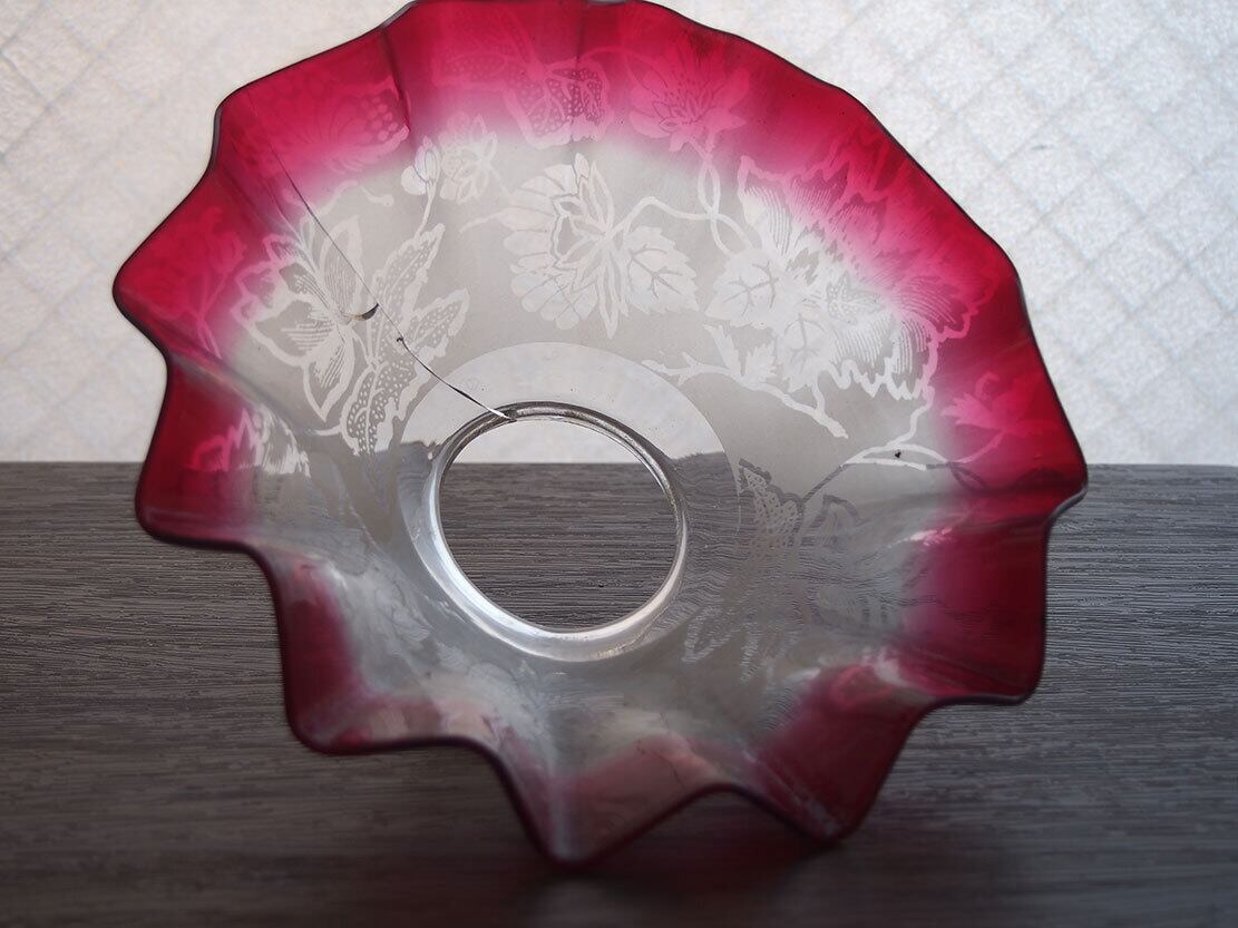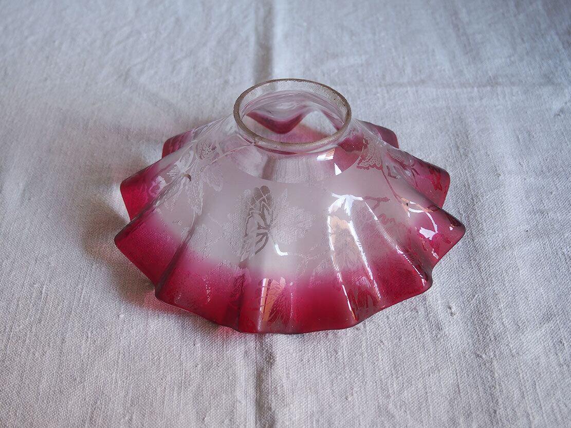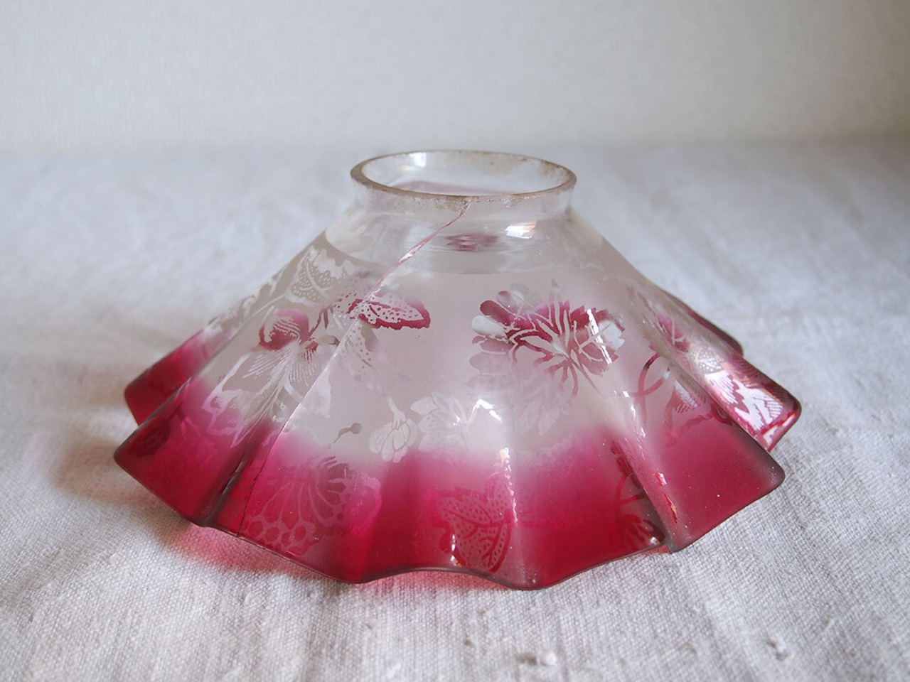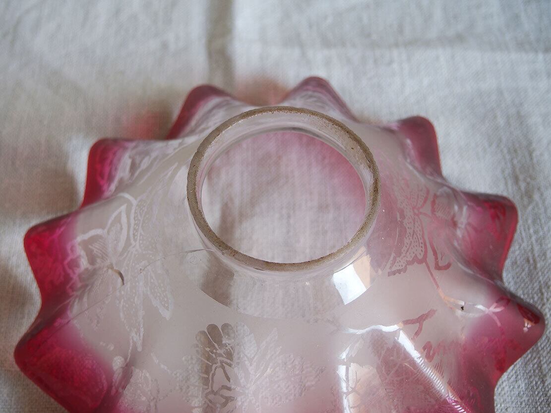 ヨーロッパのアンティーク市にて入手、1930年ぐらい? 美しいハンドメイドのガラスシェード。上部の花模様の部分は磨りガラスに研磨して模様が付けられています、下へ行くにつれて磨りガラスにピンクのグラデーションが美しい。ソケット挿入口外径6.2cm 内径5.2cm、くびれ部分外径5.5cm。残念ですが、大きくヒビが入っています。日本の規格のソケットがご利用いただけます。参考資料、リメイクなどにどうぞ。