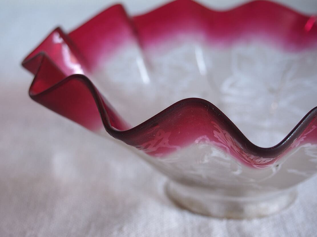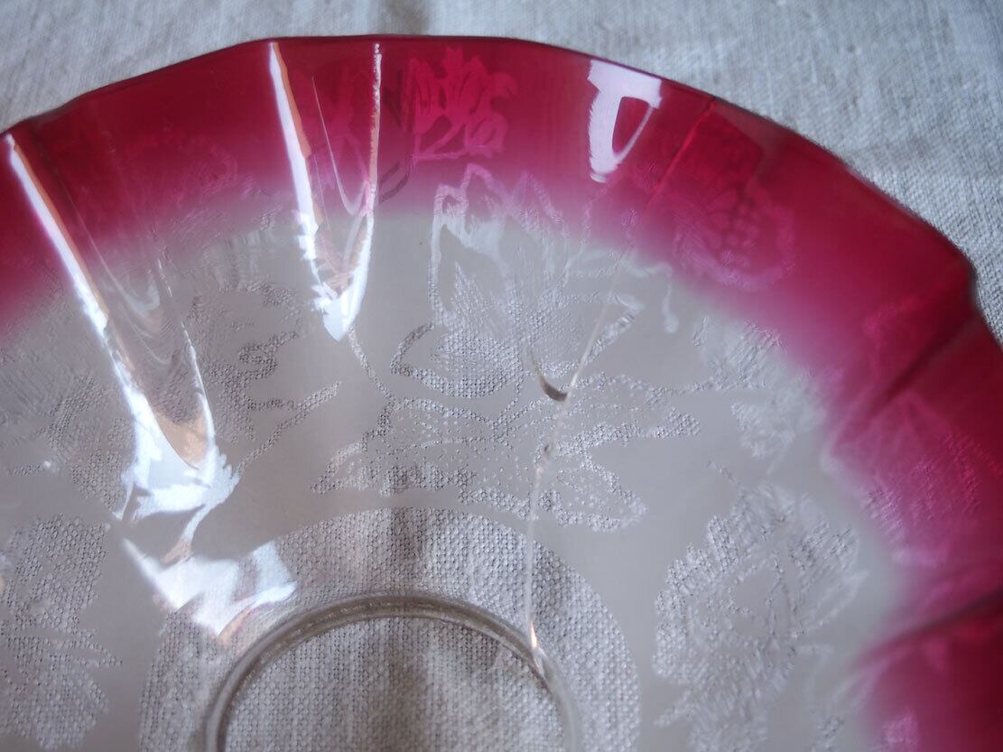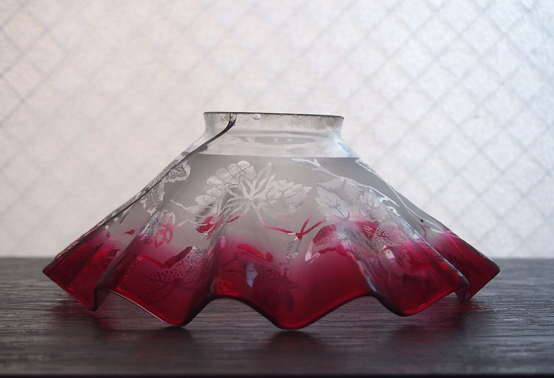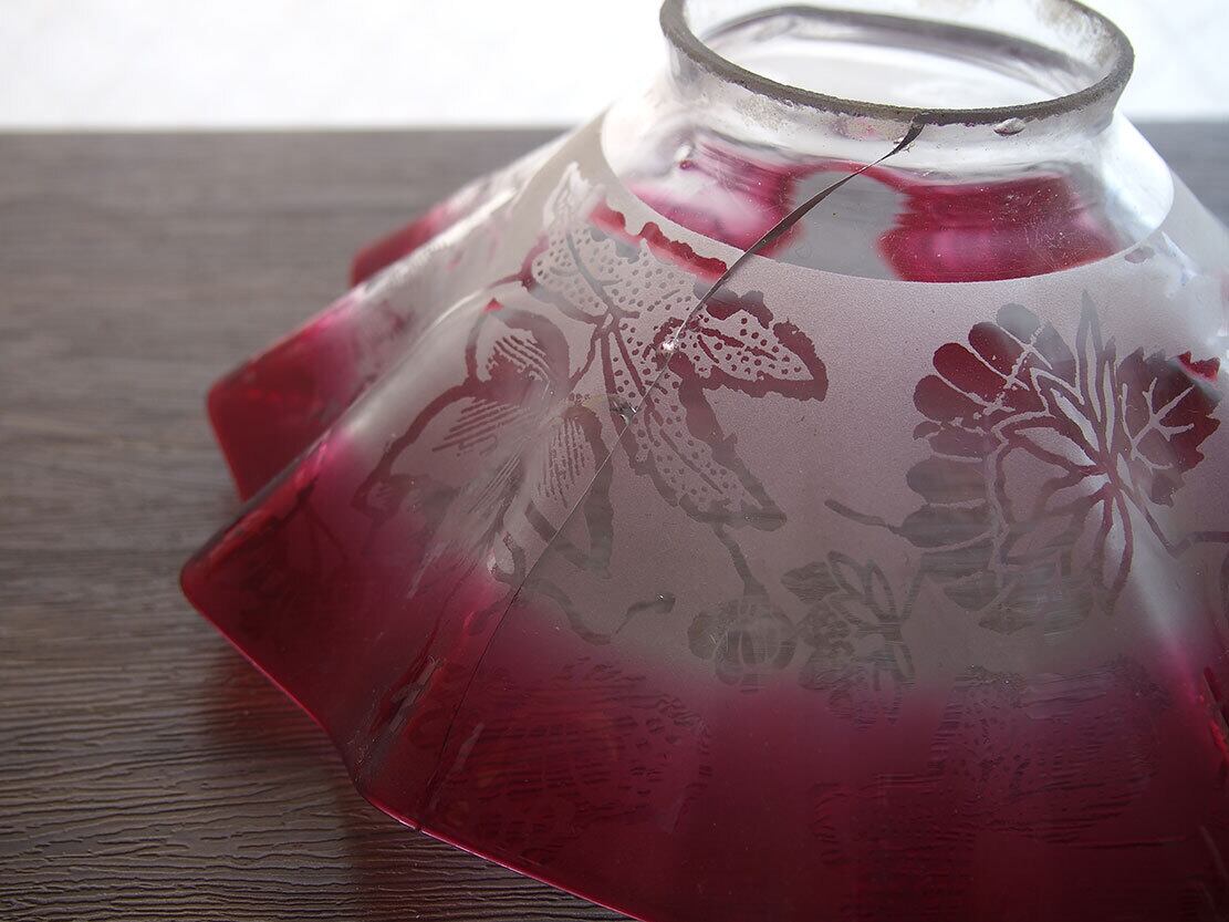 ヨーロッパのアンティーク市にて入手、1930年ぐらい? 美しいハンドメイドのガラスシェード。上部の花模様の部分は磨りガラスに研磨して模様が付けられています、下へ行くにつれて磨りガラスにピンクのグラデーションが美しい。ソケット挿入口外径6.2cm 内径5.2cm、くびれ部分外径5.5cm。残念ですが、大きくヒビが入っています。日本の規格のソケットがご利用いただけます。参考資料、リメイクなどにどうぞ。