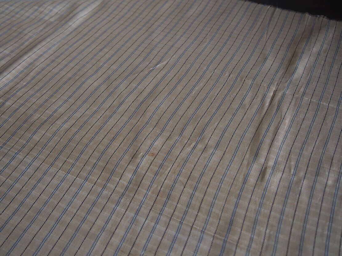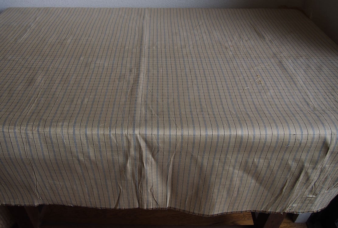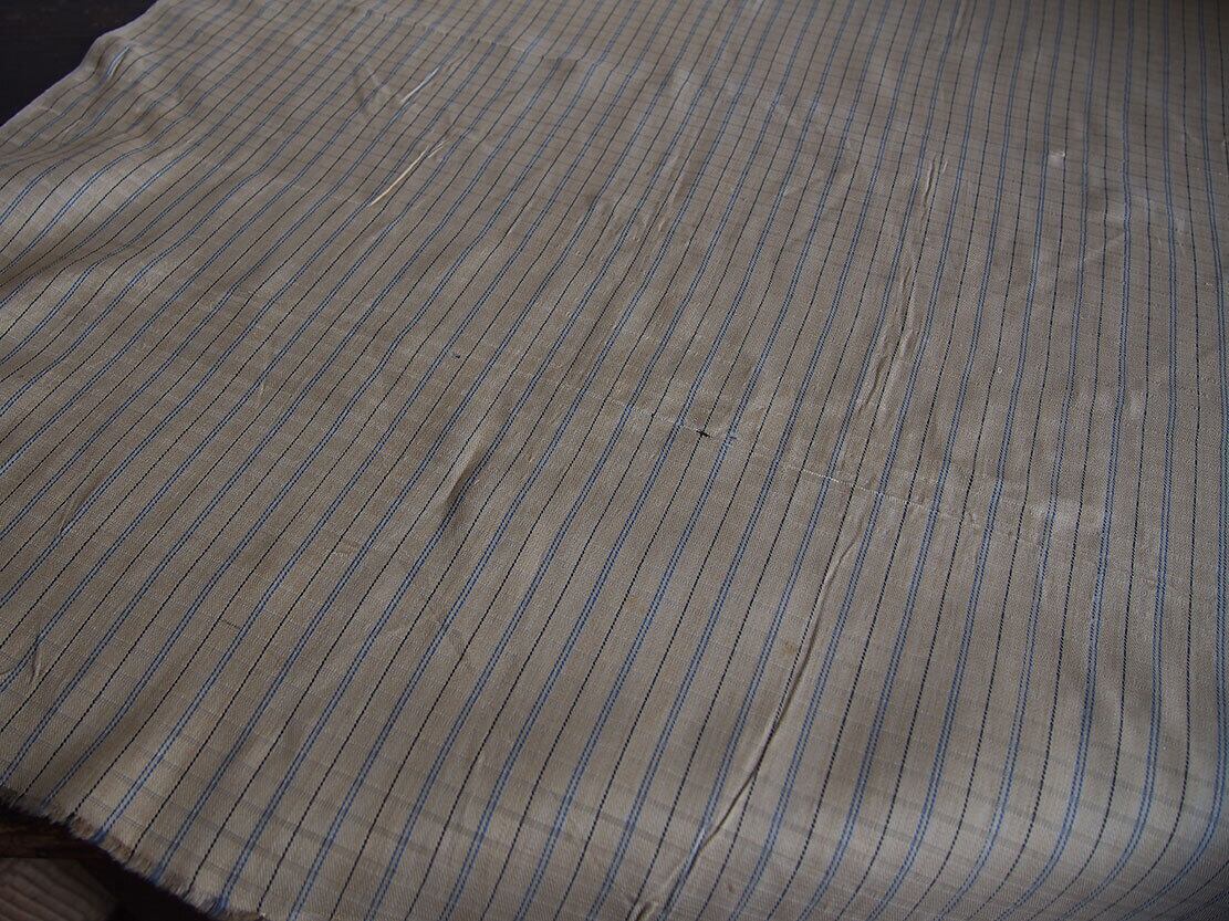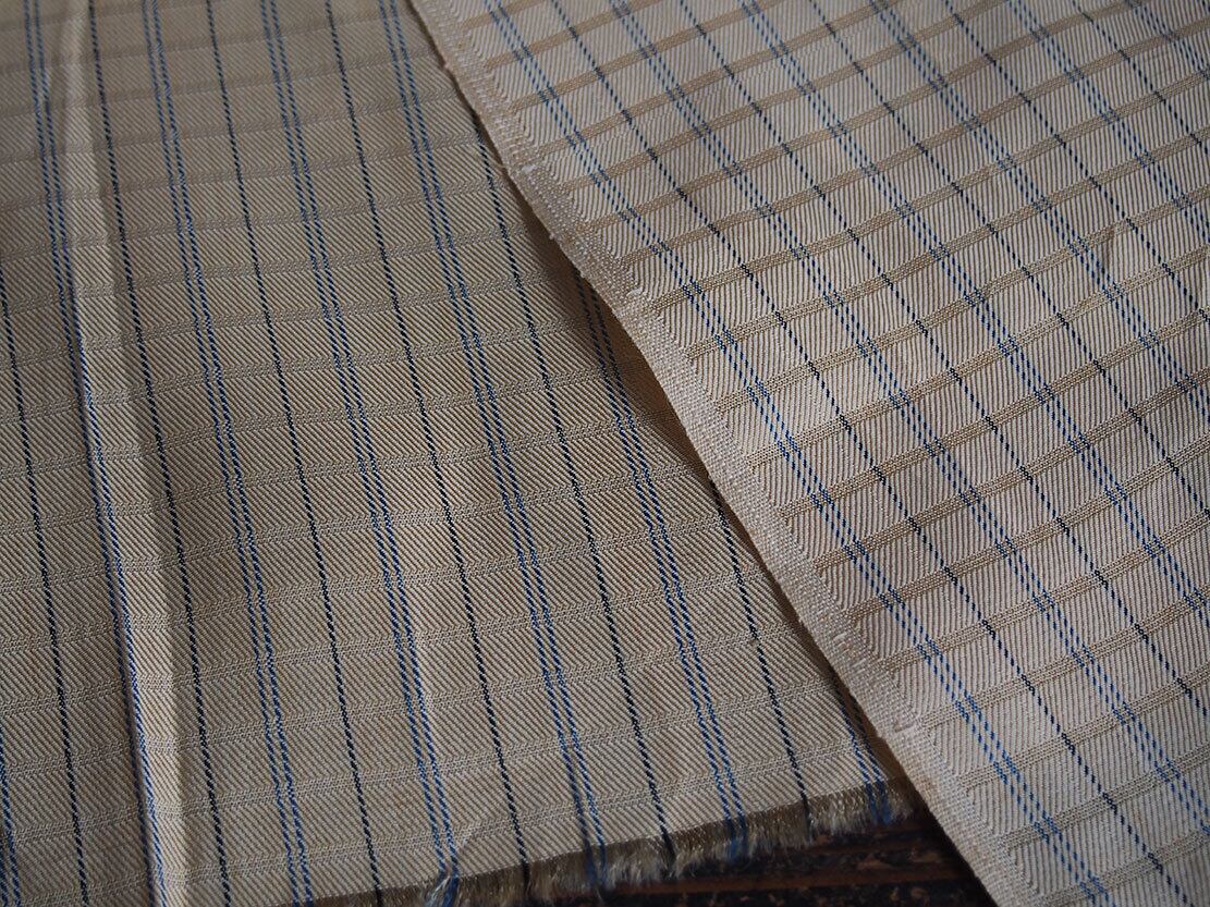 ヨーロッパのアンティーク市にて入手、1960年ぐらい?。長い間かけて収集したヴィンテージファブリックの一部を出品します。青系の濃淡2色のストライプ生地、光沢有、未使用品。紳士服の袖裏などに使われる副素材だと思います。古い生地です、ご覧のようにシミや痛みなどあります、未洗濯。インテリア、衣類、ドールの衣装などの小物の製作に。デザイン、縫製の資料などにも。アンティーク衣装、ファブリックを得意としています、他の商品も是非ご覧ください。