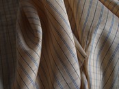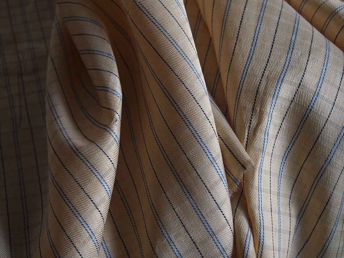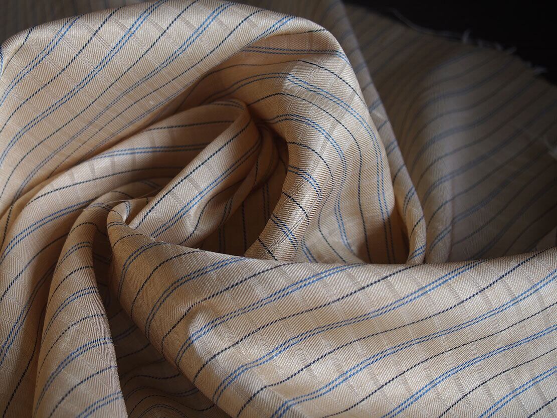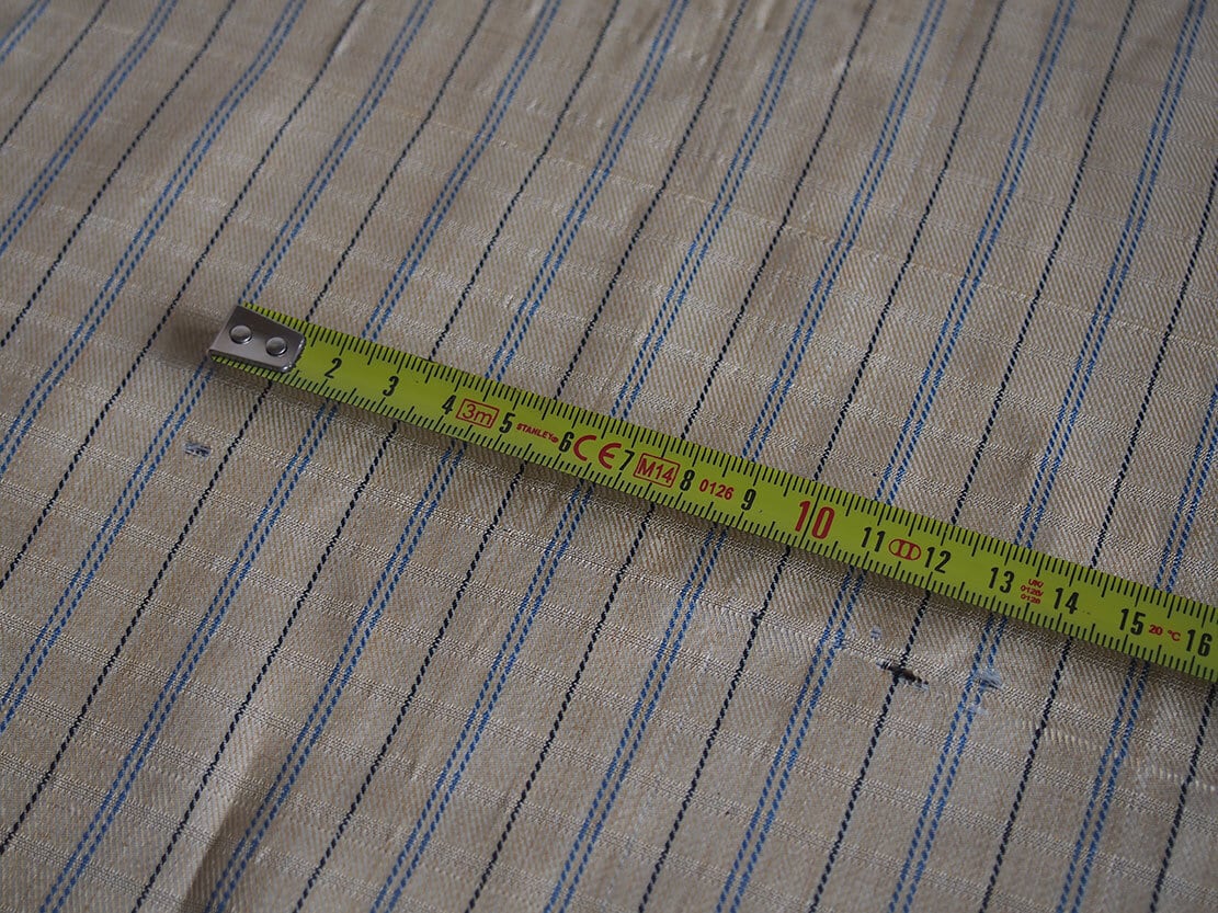 ヨーロッパのアンティーク市にて入手、1960年ぐらい?。長い間かけて収集したヴィンテージファブリックの一部を出品します。青系の濃淡2色のストライプ生地、光沢有、未使用品。紳士服の袖裏などに使われる副素材だと思います。古い生地です、ご覧のようにシミや痛みなどあります、未洗濯。インテリア、衣類、ドールの衣装などの小物の製作に。デザイン、縫製の資料などにも。アンティーク衣装、ファブリックを得意としています、他の商品も是非ご覧ください。