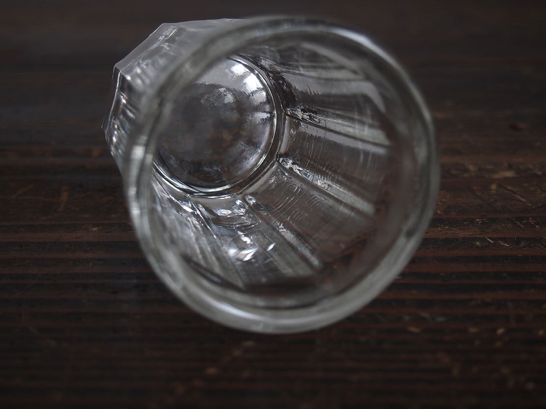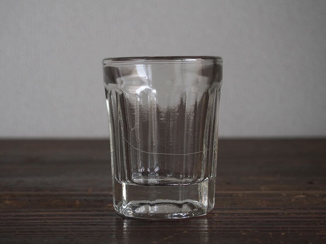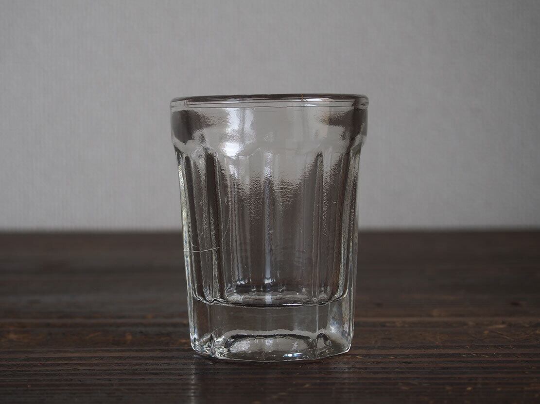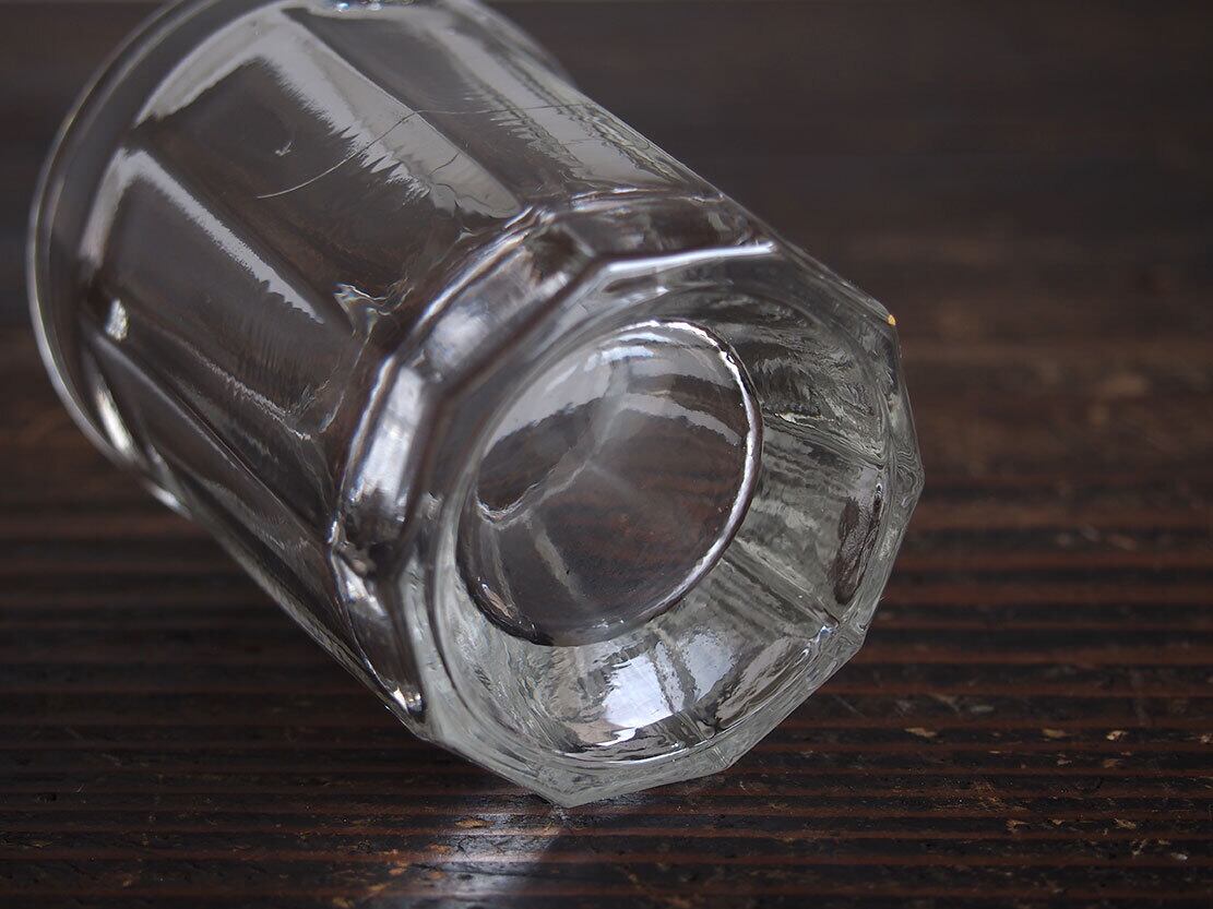 南欧のアンティーク市にて入手。昔のビストロで使われた厚手のグラス。1900年代前半。製造時にできたガラスの練りムラがあります、ヒビではありません。特に目立つダメージはありません。参考資料、リメイクなどにもどうぞ。