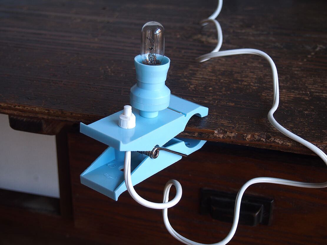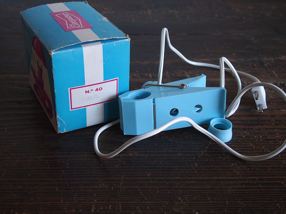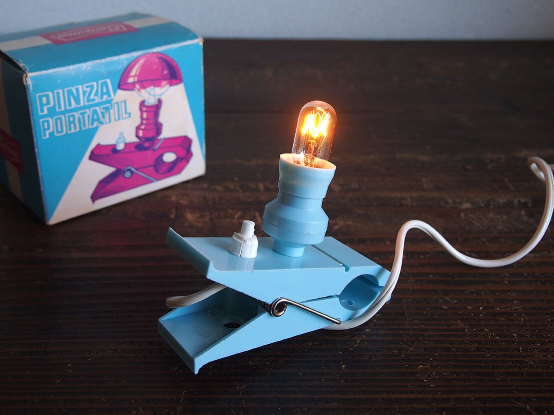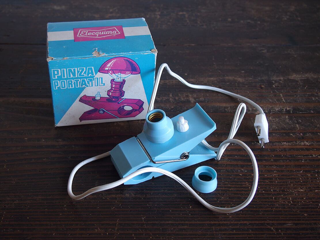 ヨーロッパのアンティーク市にて入手、1960年ぐらい?。未使用品ですが、箱にあるシェードが紛失しています。クリップ部分にあるスイッチの一部が変形しています。クリップ48.6cm×11cm。電球は付属しませんが日本でも入手が容易な規格E12。差込は海外仕様になっているので変換プラグを使用するか、差込を交換してください。動作確認していますが、古いものなので、商品が届いて万が一点灯しなかった場合は恐れ入りますが、お客様の方でメンテナンスをお願いします。コードは交換してご利用することをお勧めします。参考資料、リメイクなどにもどうぞ。
