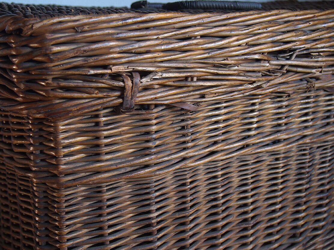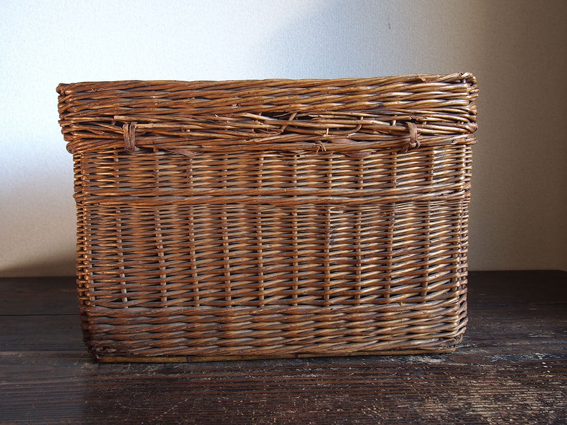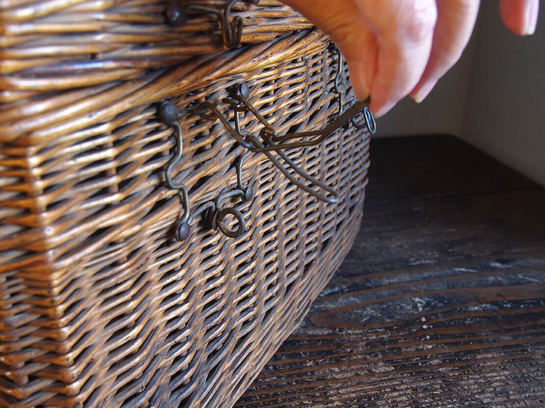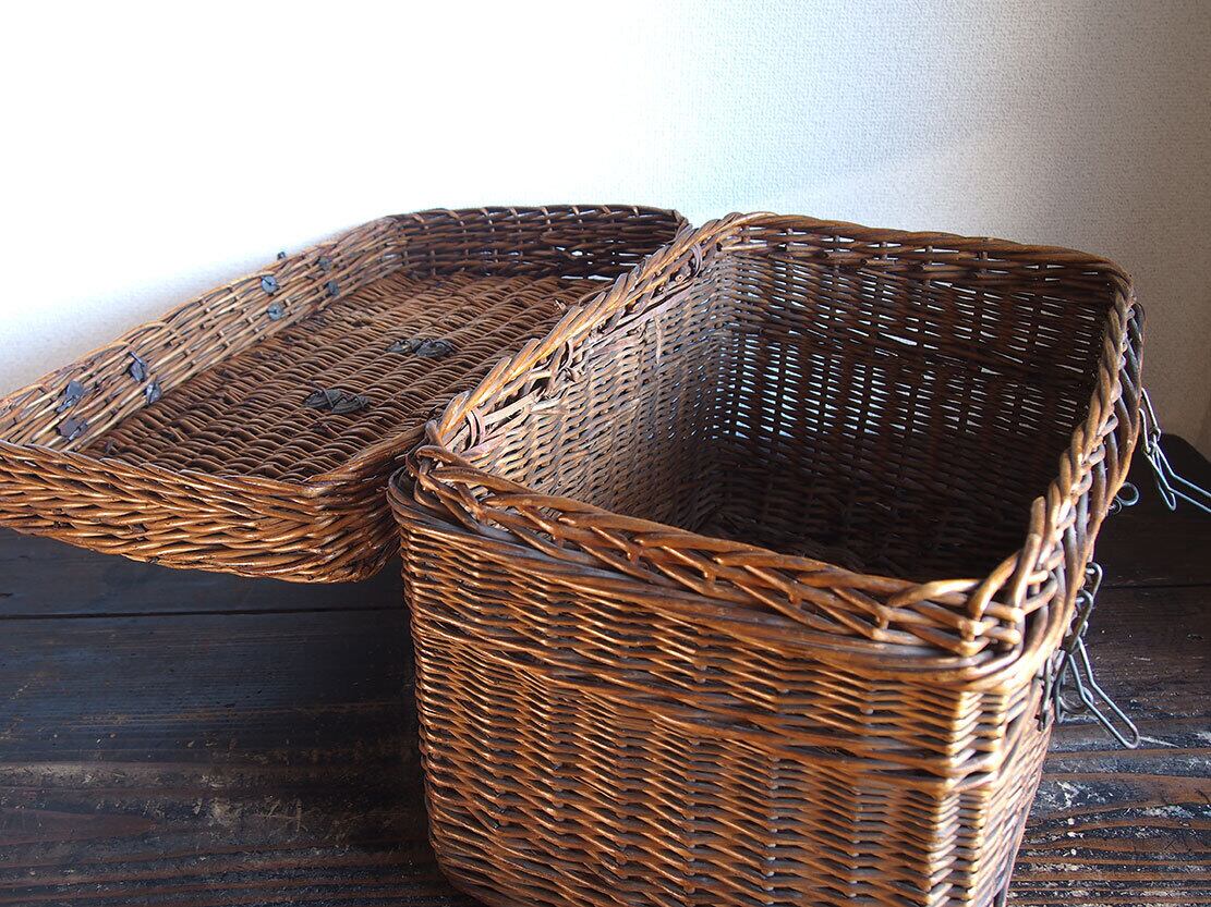 ヨーロッパのアンティーク市で入手したとても古いバスケット、1900年初頭ぐらい。ハンドルと留め金具の作りがとても珍しく、このタイプのものは初めての取り扱いです。編み目の切れ、蓋の多少の開けにくさなどあります。外部、内部共に水洗い後、乾燥させてあります。写真参照。収納やディスプレイにどうぞ。詳細は写真ご参照ください。*中に物を入れる事ができるので、他の商品との同梱包が可能です、ご希望のお客様は必ず事前にお問い合わせください。