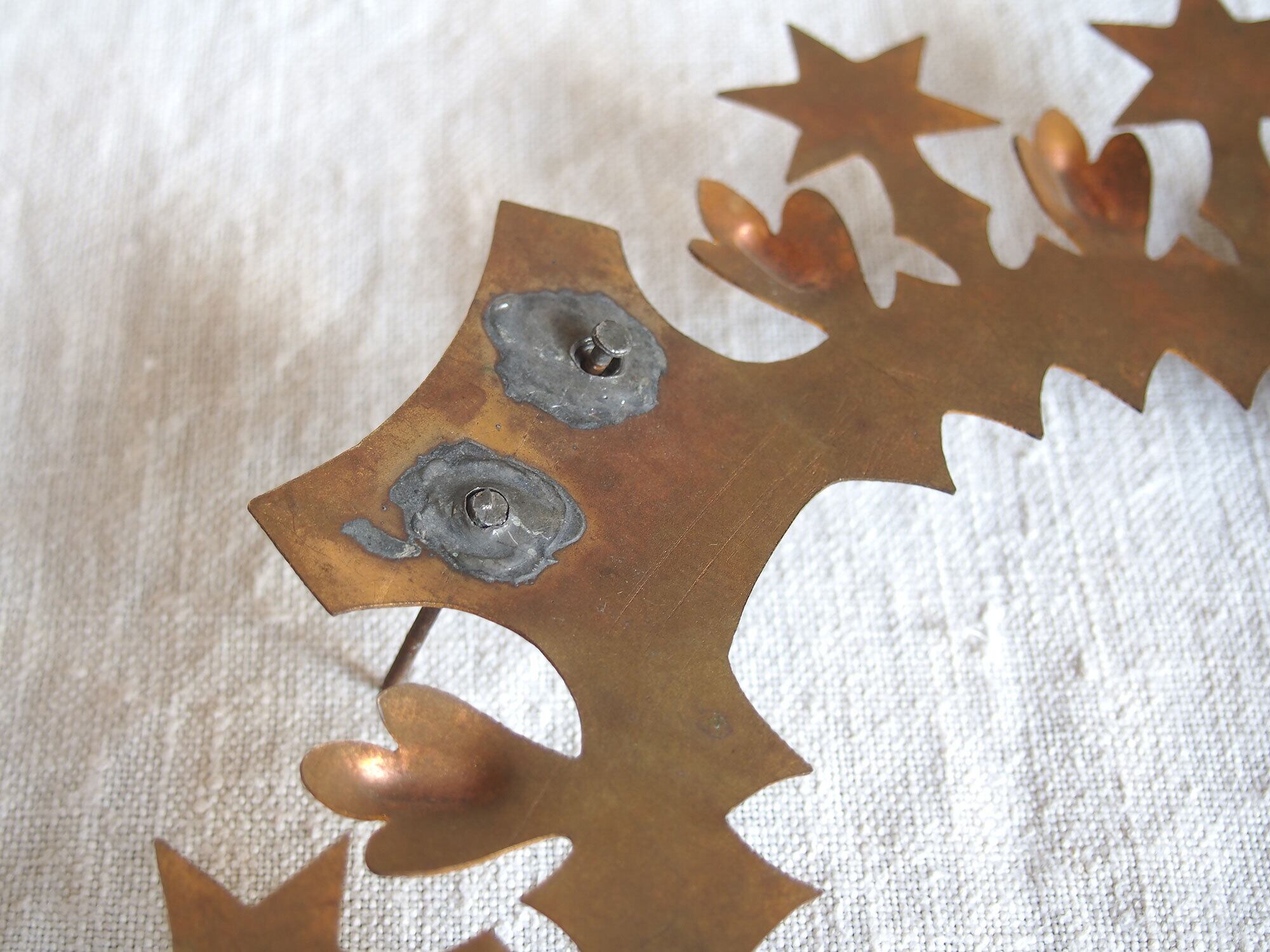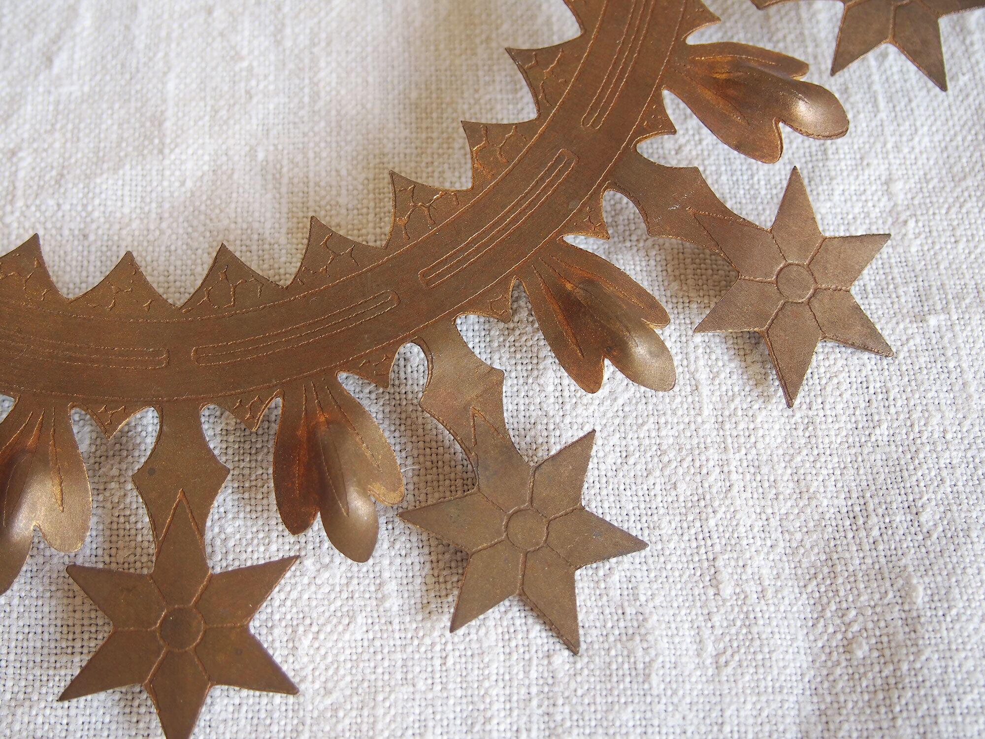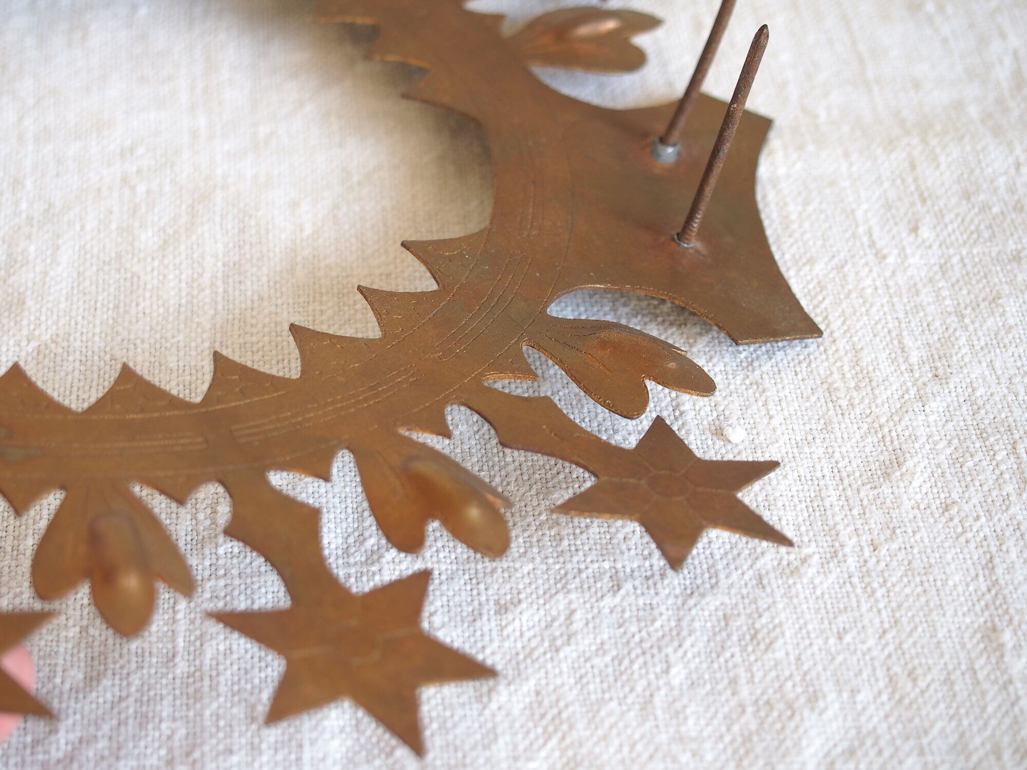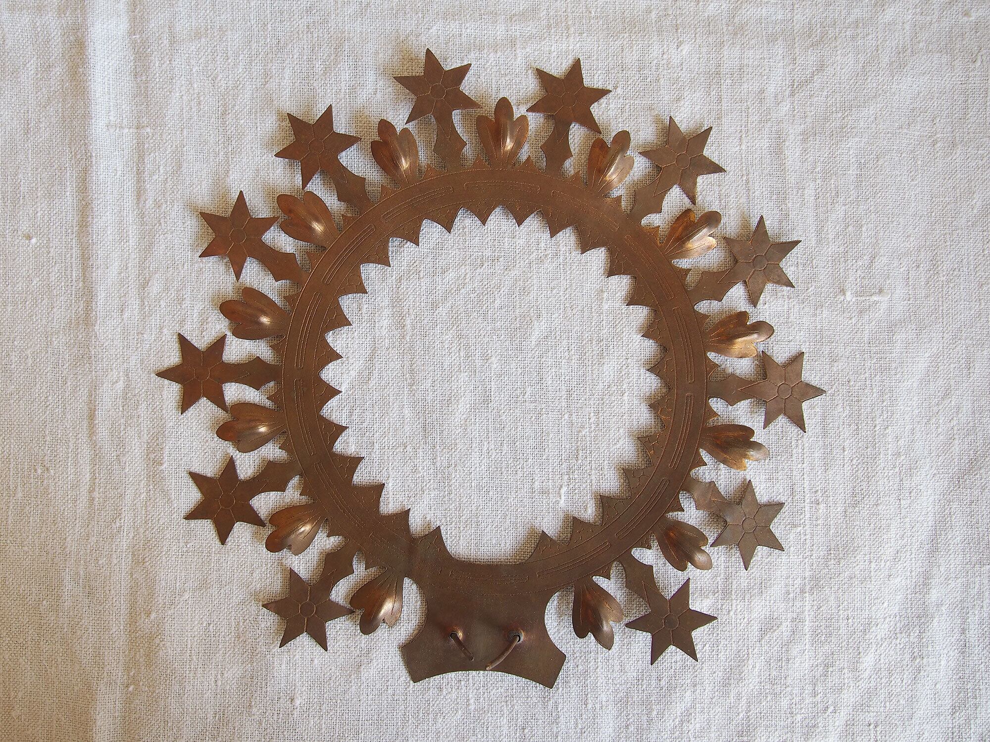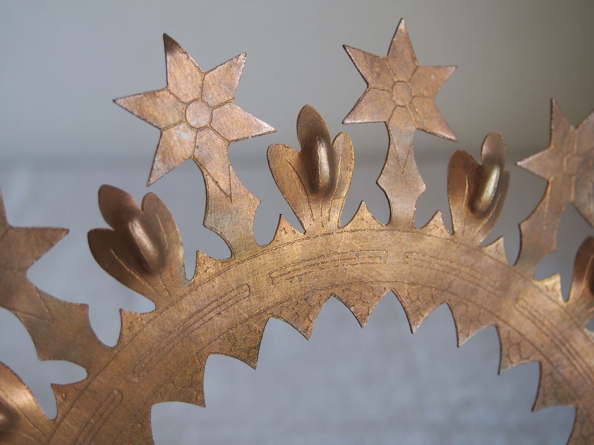 聖母マリア像に取り付ける真鍮製の光輪。 古い像は紛失している物が多いため、光輪と言えども高値で取引されています。数少ない工房で現在でもこのような冠や光輪はわずかに作られています。多少のくすみや歪みなどあります、詳細は写真でご確認ください。