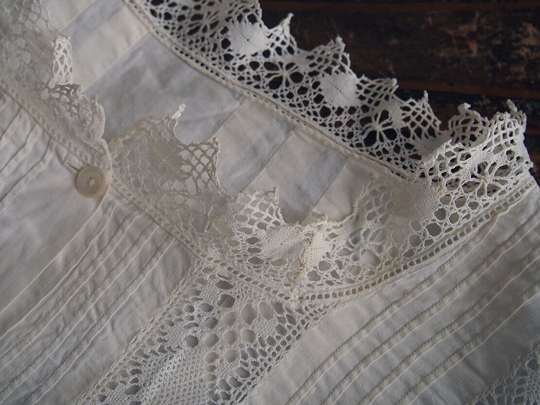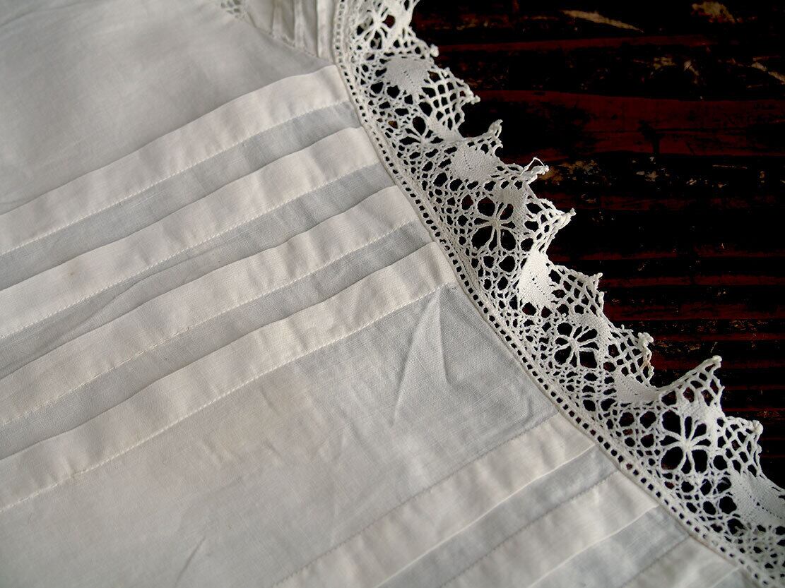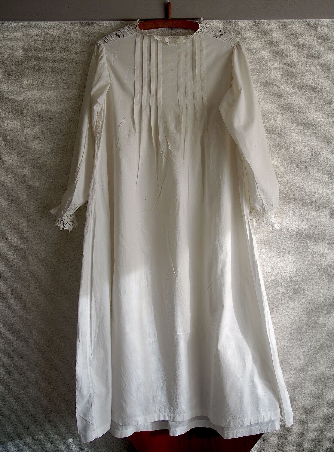 ヨーロッパのアンティーク市にて入手、1940年ぐらいのナイティ。肩襟ぐりからハイウエストのレース下まで31cm。透け感のない平織りコットンに豪華な手刺繍とレースにピンタック。裾の左右両脇から45cmあたりに小さな生地の痛みあり、たぶん畳んで販売中にピンで留めてあった跡だと思います。そのほかにも小さな穴があります。写真でご確認ください。色は真っ白ではなく未晒しの生成り、洗濯済。デザイン、縫製の資料などにも。アンティーク衣装、ファブリックを得意としています、他の商品も是非ご覧ください。