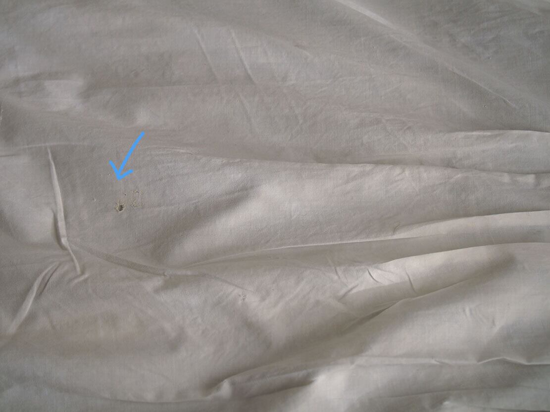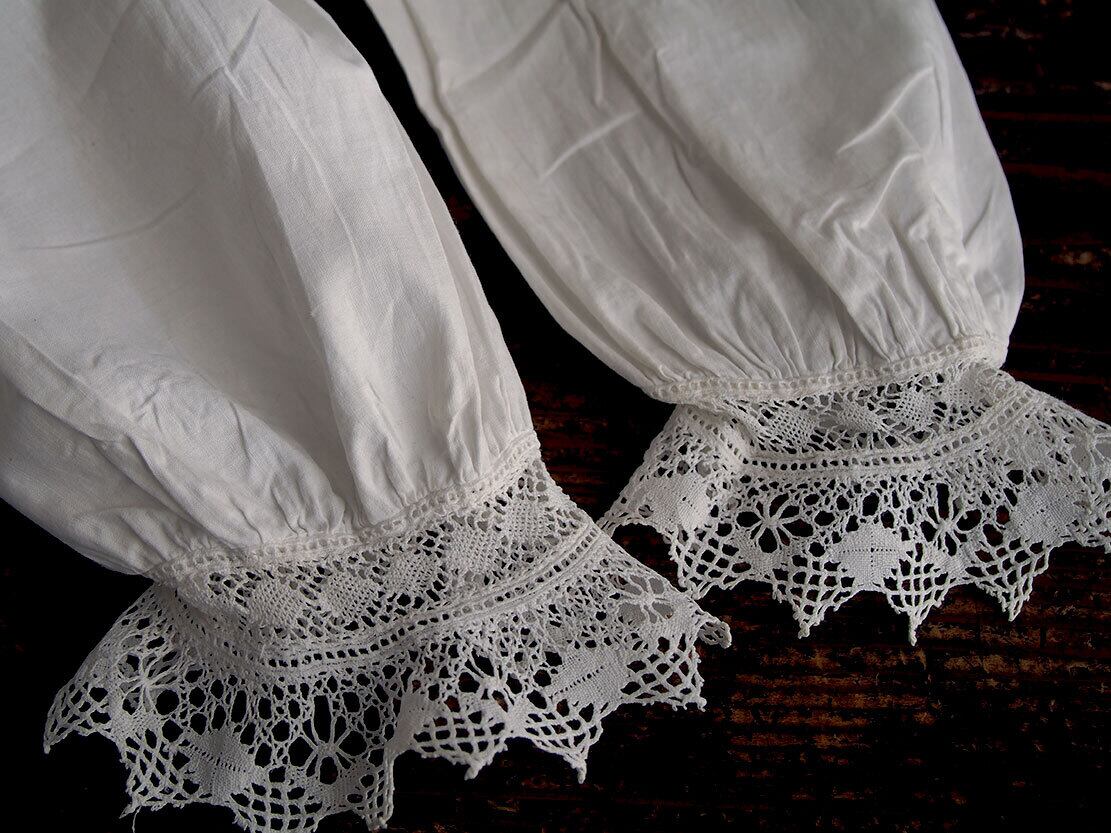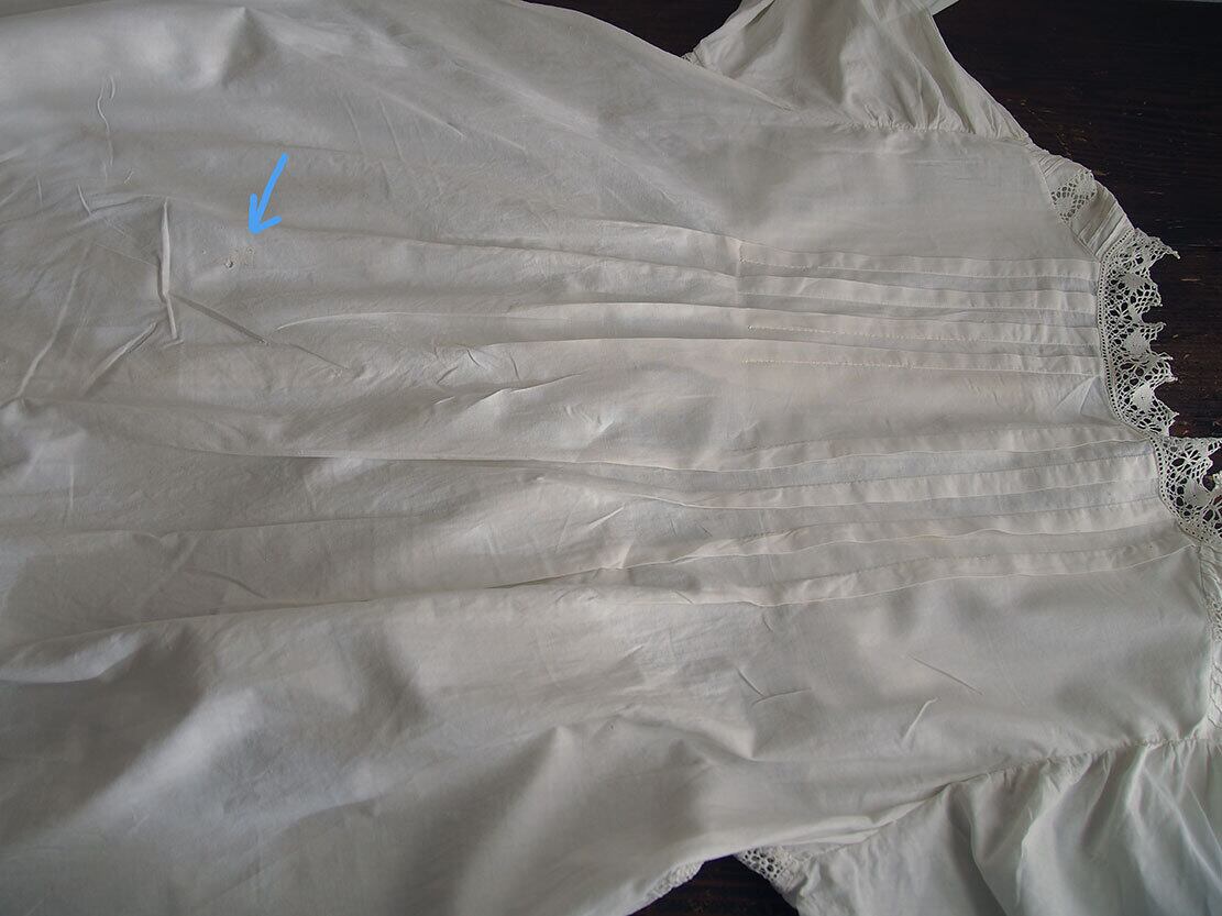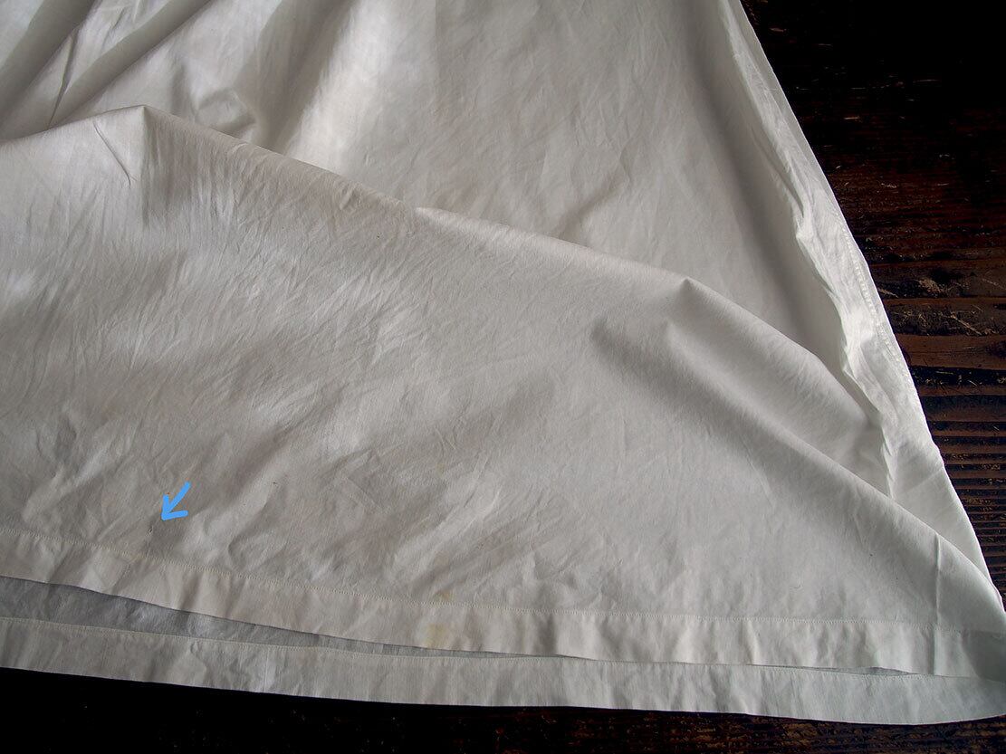 ヨーロッパのアンティーク市にて入手、1940年ぐらいのナイティ。肩襟ぐりからハイウエストのレース下まで31cm。透け感のない平織りコットンに豪華な手刺繍とレースにピンタック。裾の左右両脇から45cmあたりに小さな生地の痛みあり、たぶん畳んで販売中にピンで留めてあった跡だと思います。そのほかにも小さな穴があります。写真でご確認ください。色は真っ白ではなく未晒しの生成り、洗濯済。デザイン、縫製の資料などにも。アンティーク衣装、ファブリックを得意としています、他の商品も是非ご覧ください。