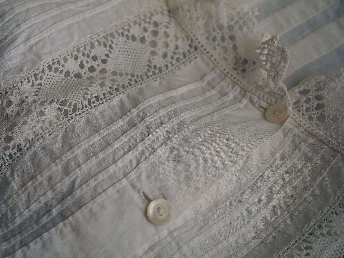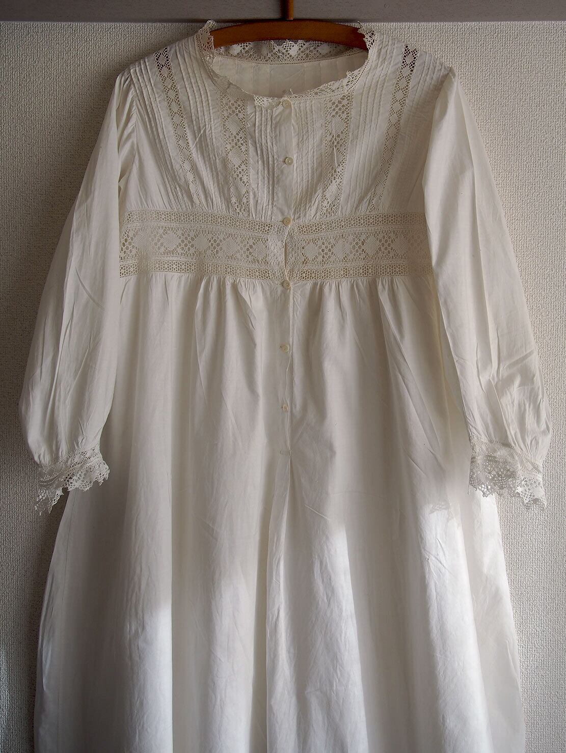 刺繍レースとシェルボタンの部屋着 ナイティ時代衣装 丈111cm 1940年 ヴィンテージ アンティーク ヨーロッパ /K379