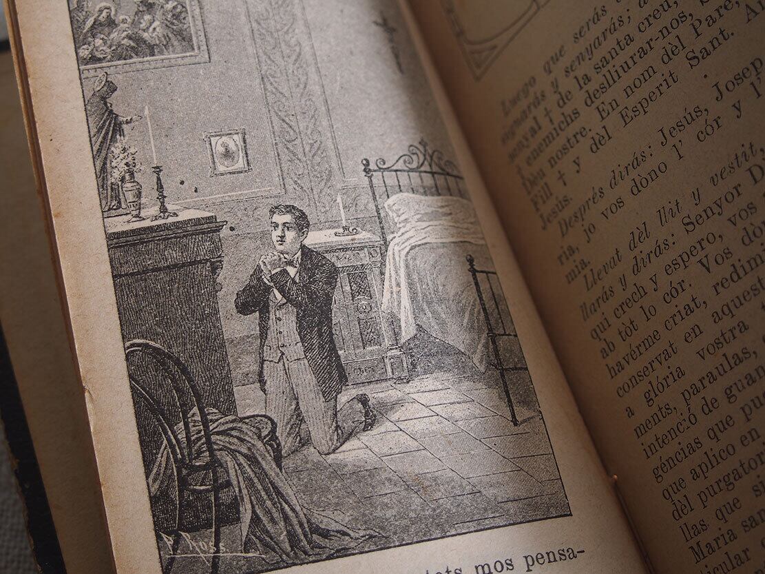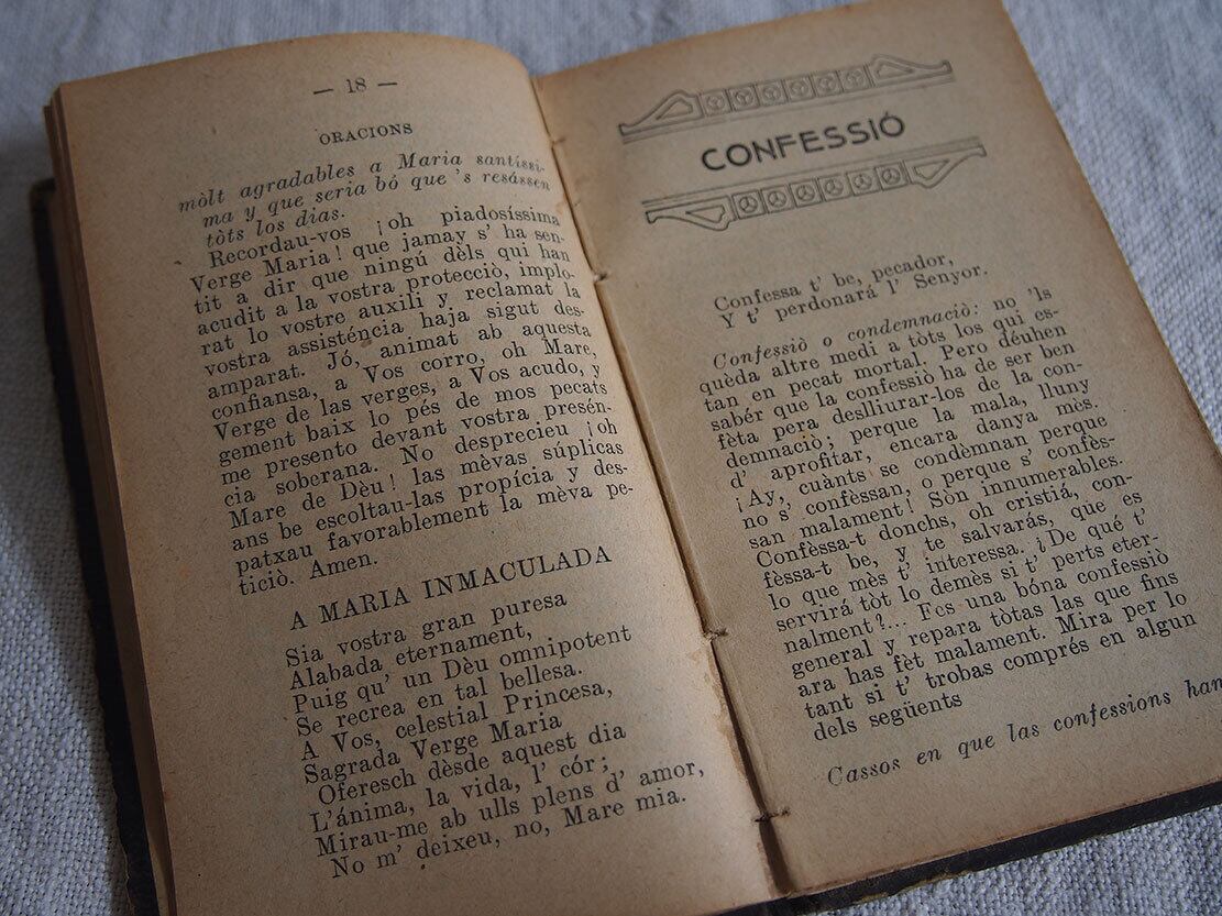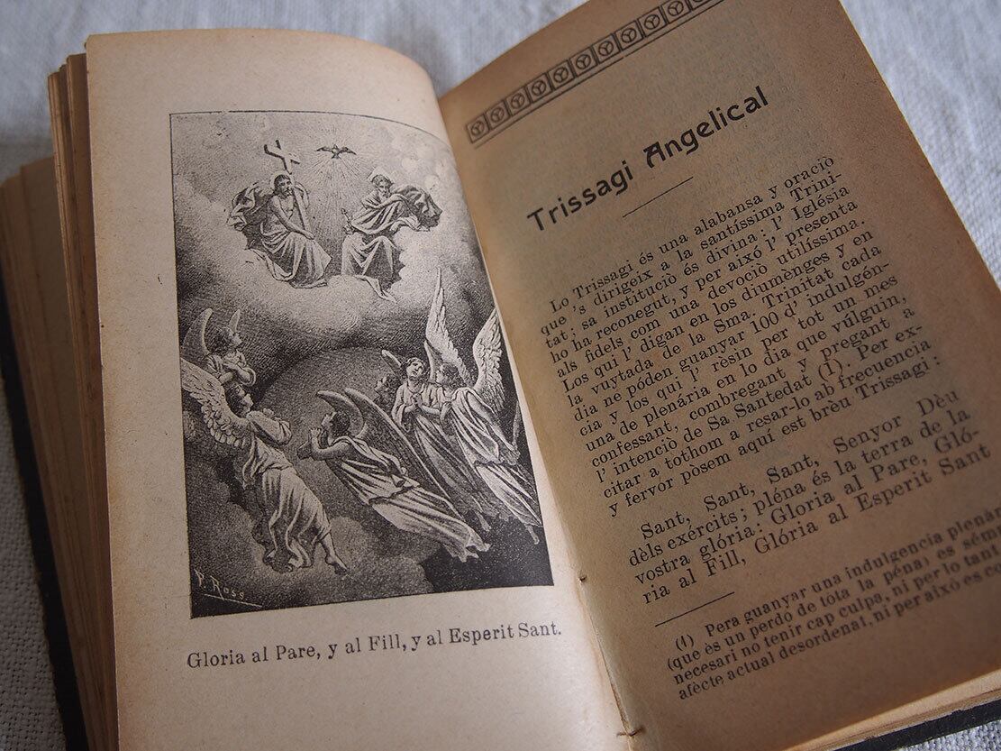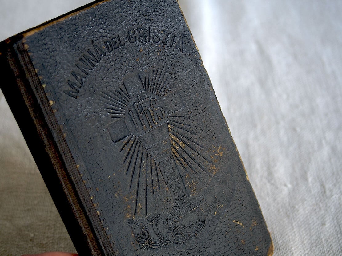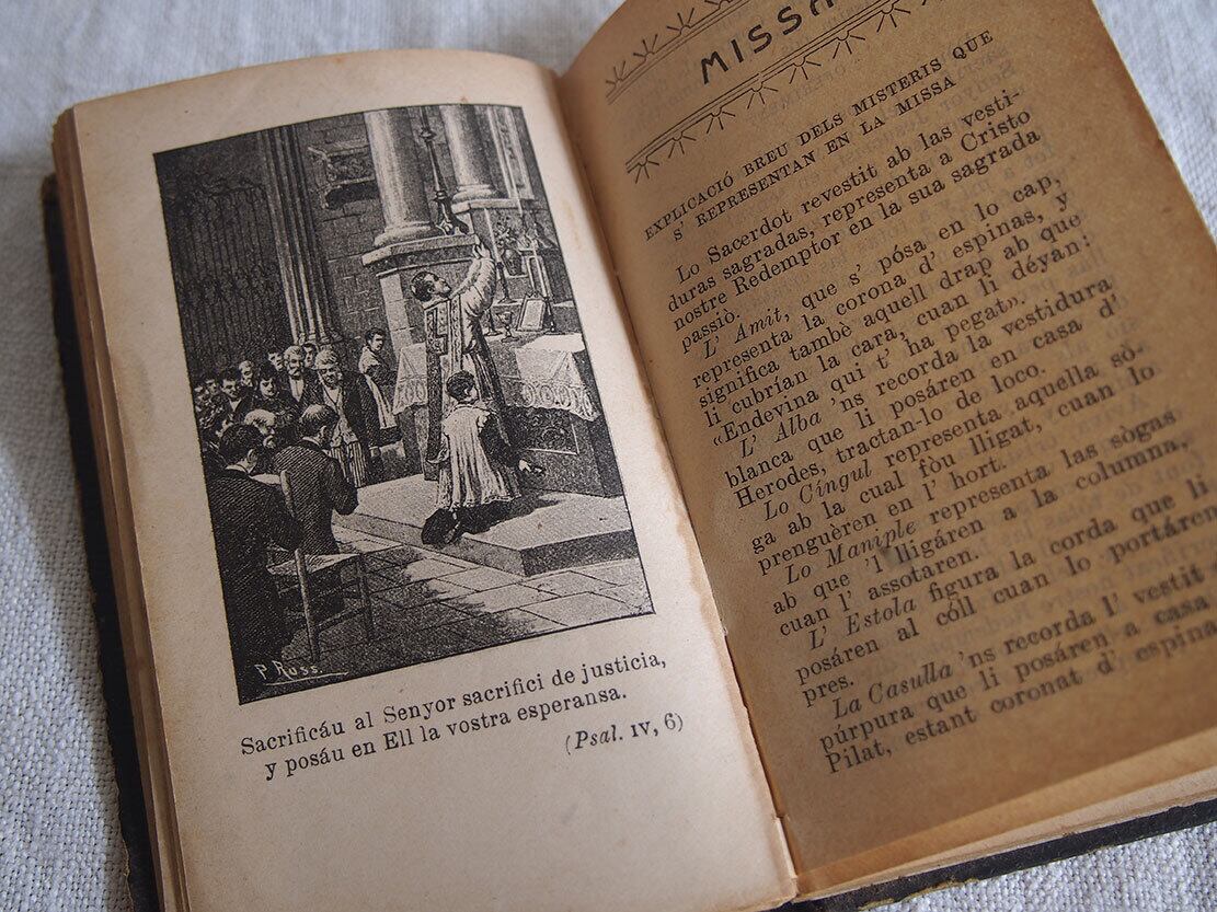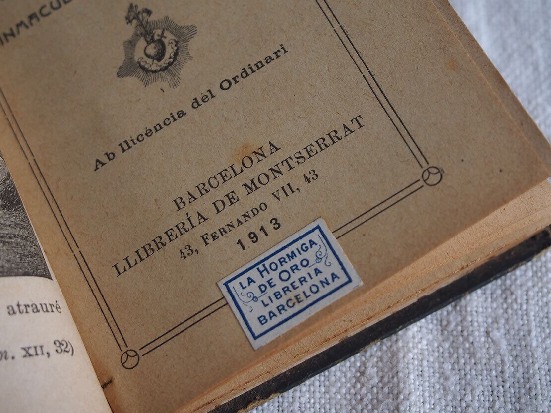 1913年にスペイン・バルセロナで出版された、カトリックの古い祈祷書(ミサ用書籍)です。 表紙には十字架と「IHS(イエスのモノグラム)」が型押しで施され、信仰の象徴性と時代を感じさせる重厚な佇まいを備えています。100年以上も経過した古い典礼書です、経年による置きシミなどあります。全ページを確認していません、書き込みなどあるかもしれません。挟まっていたカードも付属します。置いておくだけで存在感のある古い本です。