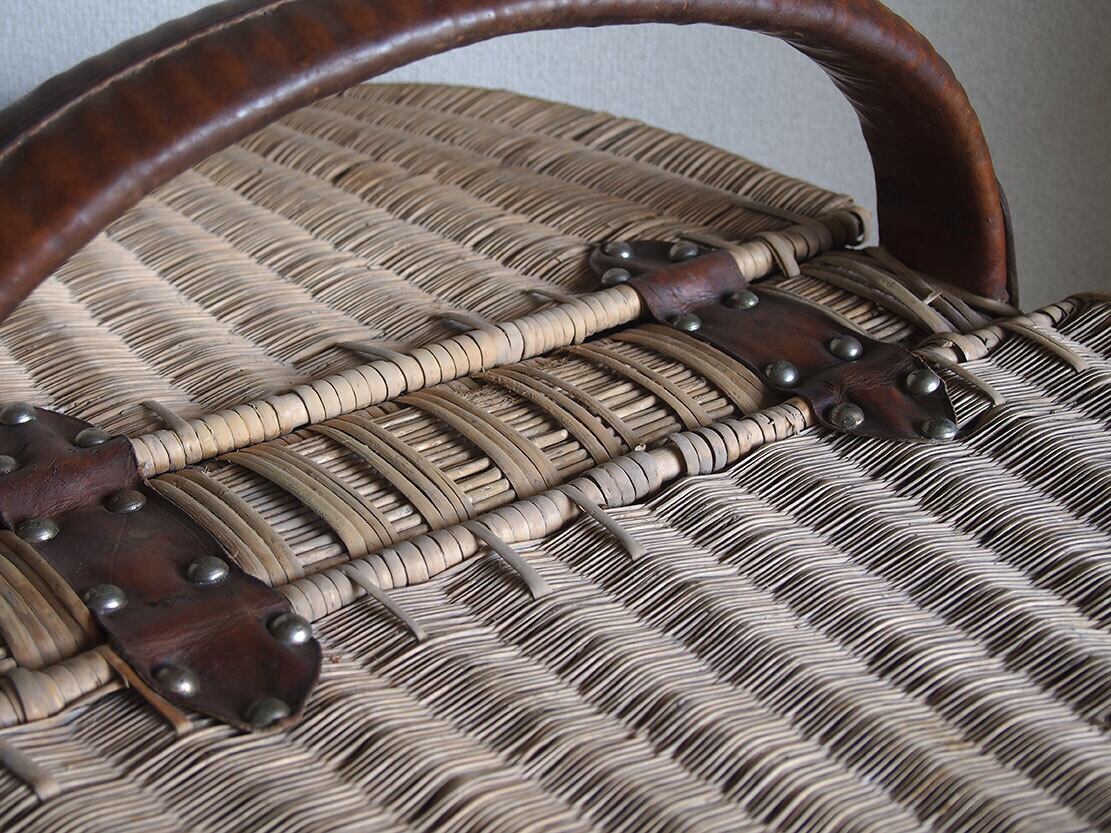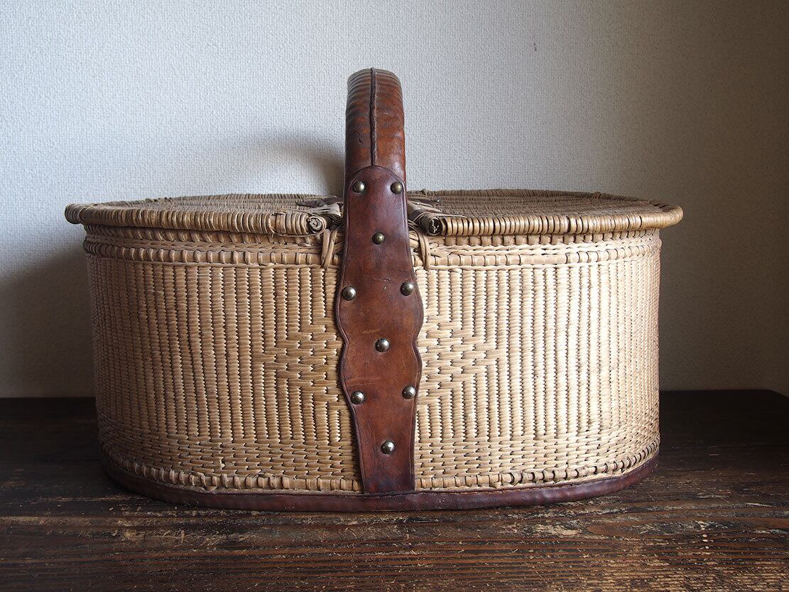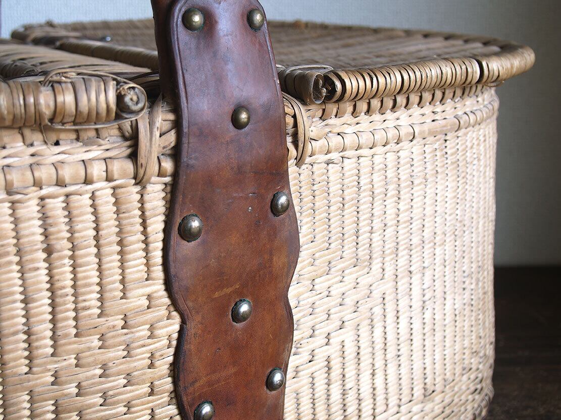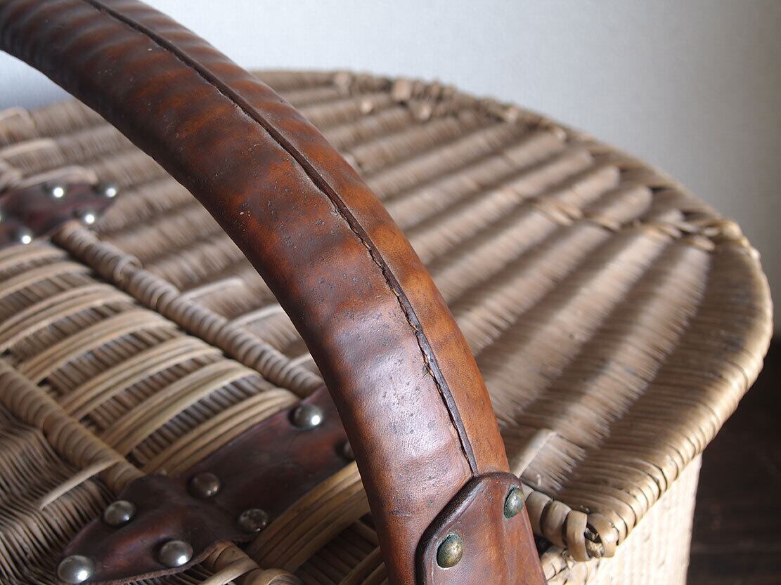 ふた付き 皮ハンドルの大きなバスケット 民藝 パニエ かご細工 柳 籐 枝編み細工 フランス ヨーロッパ ブロカント 蚤の市 アンティーク/K351