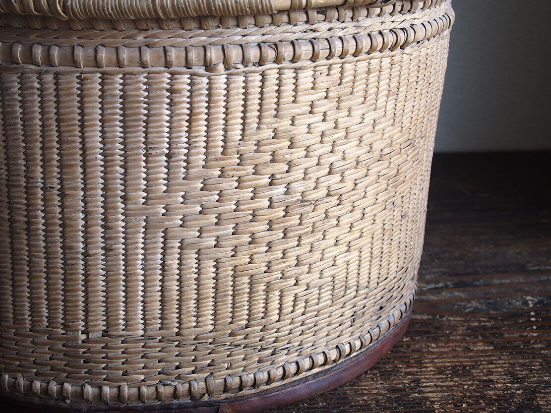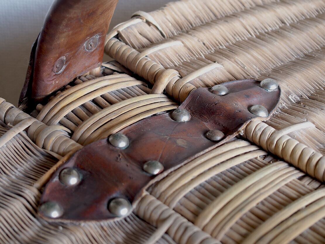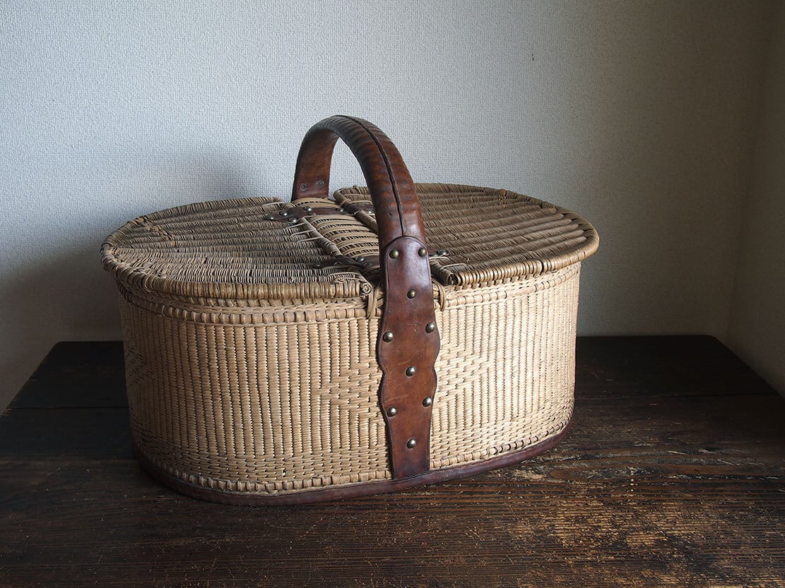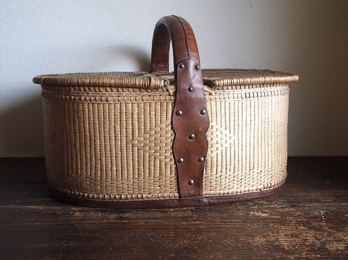 ふた付き 皮ハンドルの大きなバスケット 民藝 パニエ かご細工 柳 籐 枝編み細工 フランス ヨーロッパ ブロカント 蚤の市 アンティーク/K351