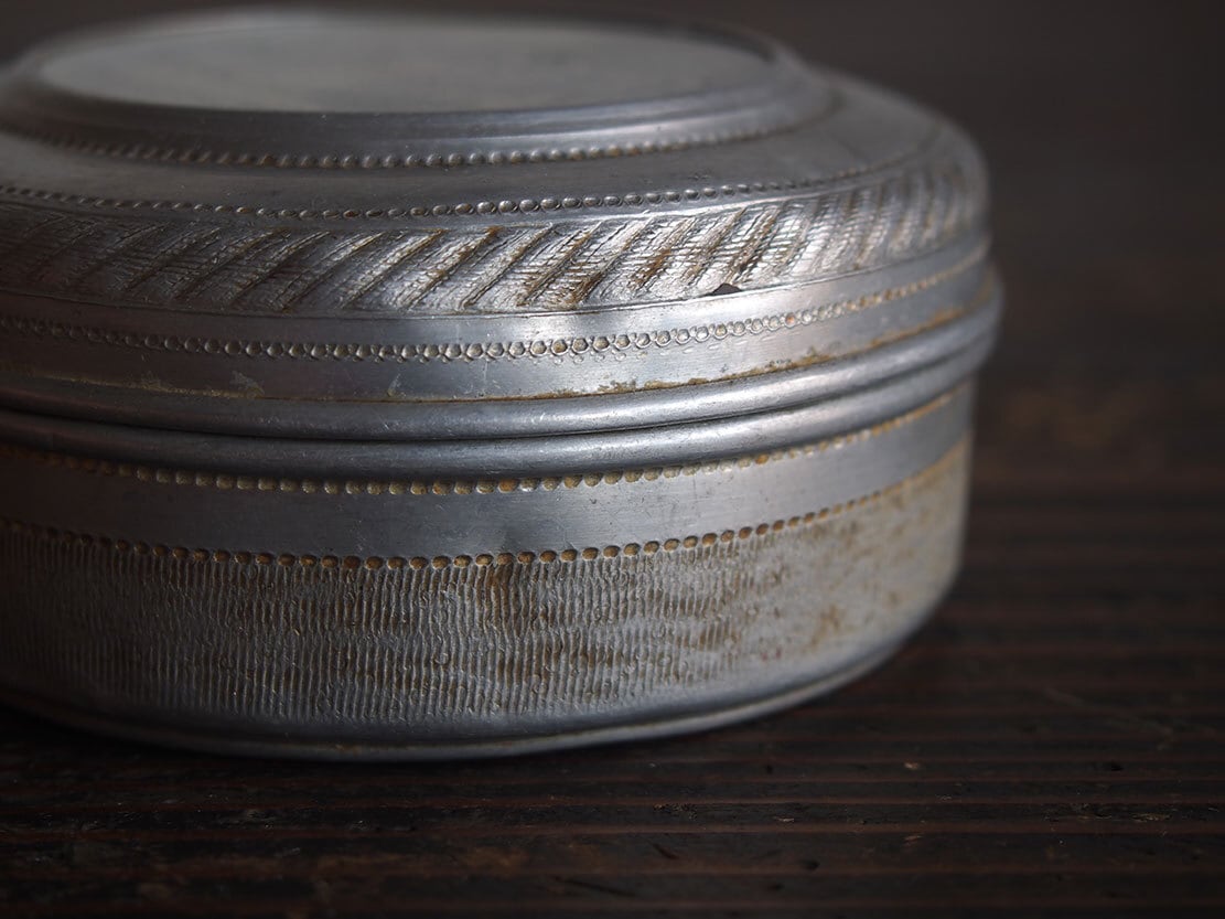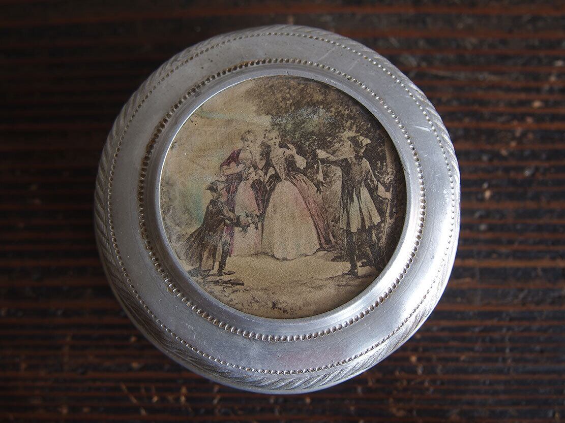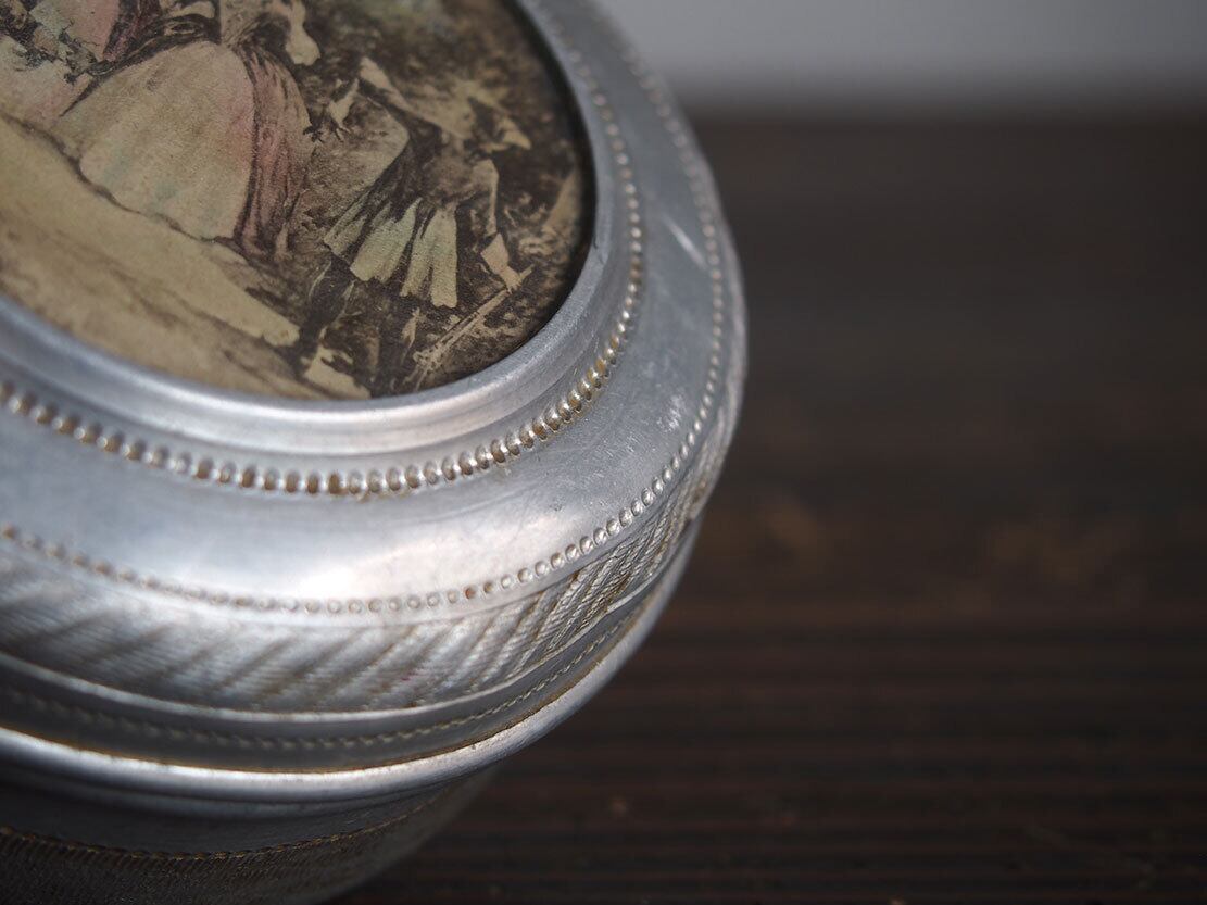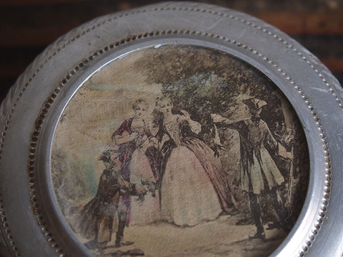 ヨーロッパの蚤の市で入手。19世紀の社交場面を描いた版画図像があしらわれた、雰囲気のあるアンティークメタルボックスです。蓋中央には、優雅なドレス姿の人物たちが描かれた紙絵(版画由来と思われる図柄)が収められており、ヴィクトリア時代らしいロマンティックな空気を感じさせます。側面には斜線模様のエンボスが施されています。作りや装飾の様子から、19世紀後半(ヴィクトリア時代〜世紀末頃)と思われます。小物入れ、裁縫道具入れ、アクセサリーケース、ディスプレイ用としてもおすすめです。傷や凹みなどあります、写真参照。コレクション、実用にもいかがでしょう。