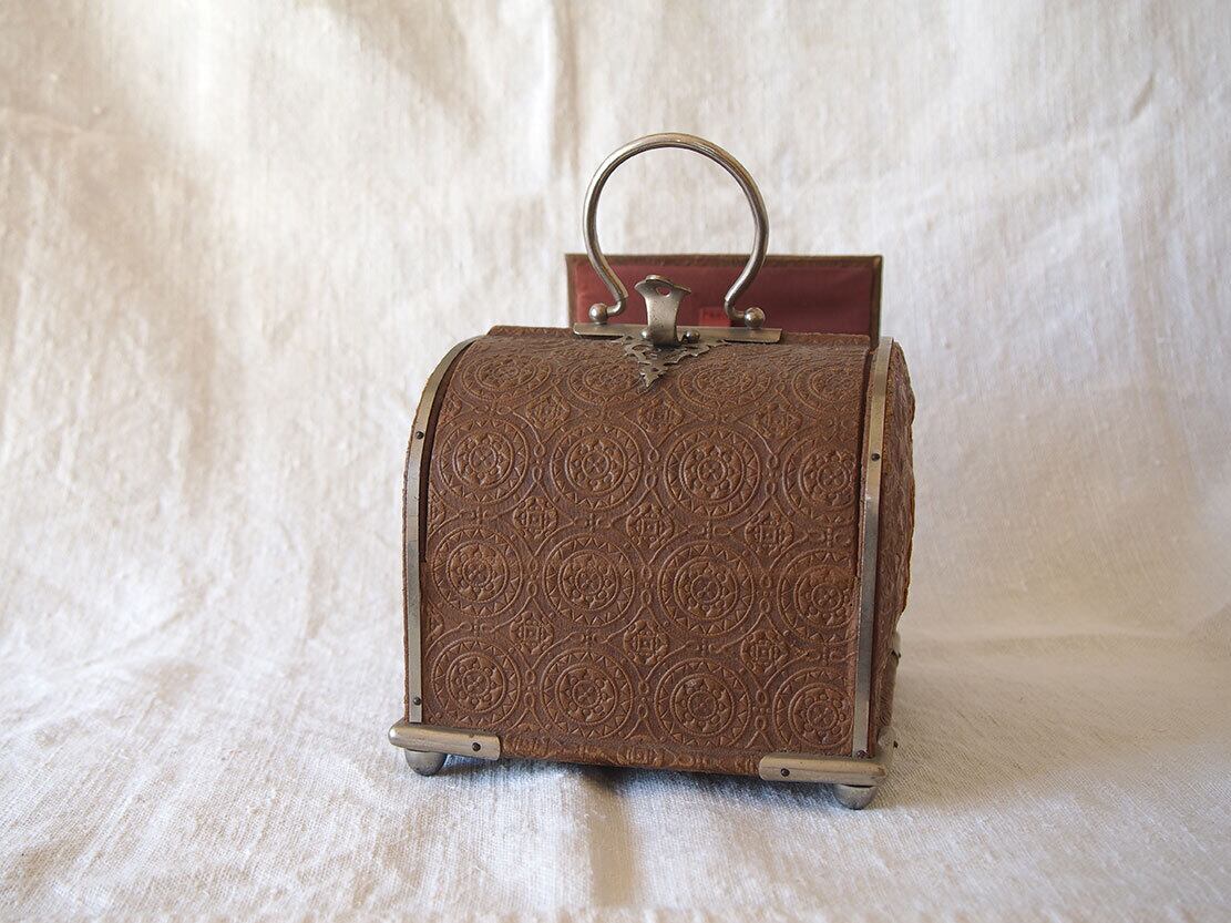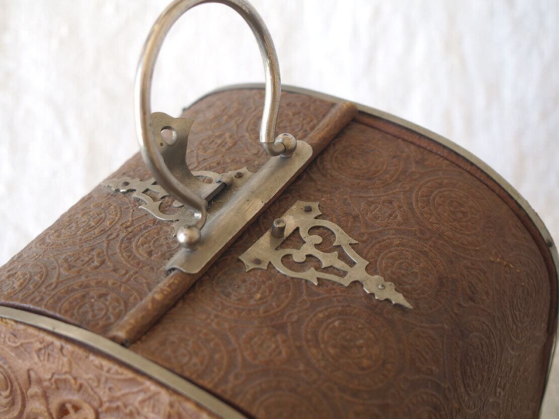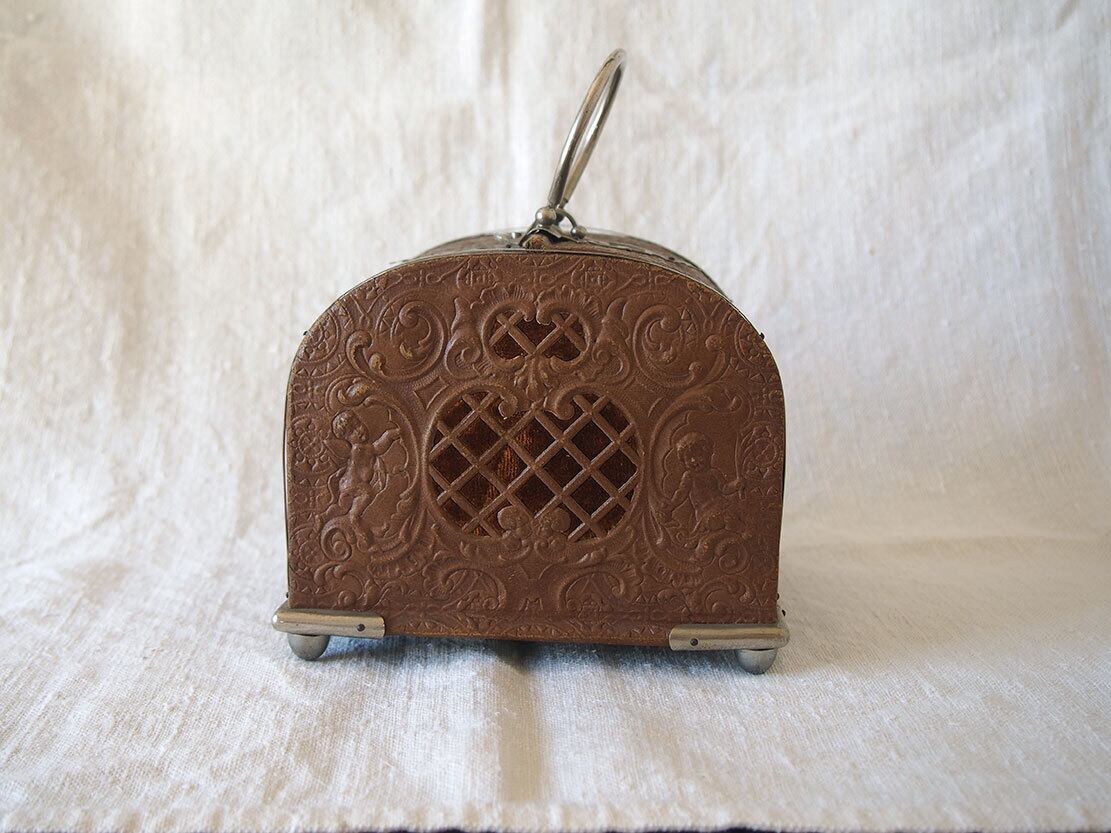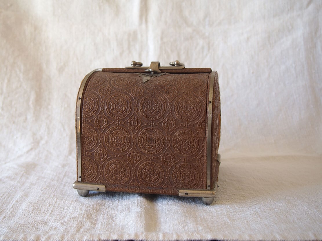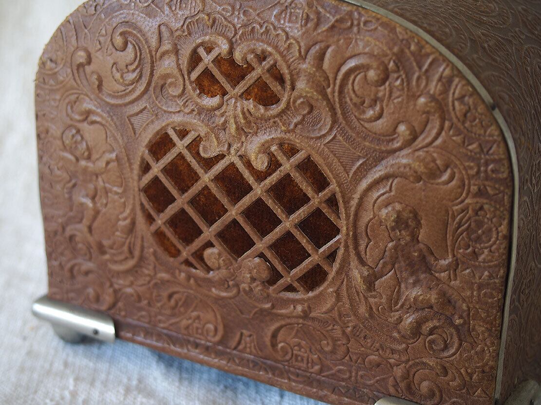 ヨーロッパのアンティーク市にて入手。おおよそ1880〜1920年頃に作られたと考えられる、アンティーク・デヴォーショナルボックスです。19世紀後半のロココ・リヴァイヴァル様式。型押し装飾が施された紙製の外装には、プット(天使)や唐草文様が表現されたロココ調のデザイン、中央には格子状の透かし装飾が配されています。内部はサテン張りで、当時の信仰用品らしい丁寧な作りです。 ロザリオやメダイ、小さな聖品、祈りのための私的な品を収める目的で用いられていたものと思われます。外側は紙製ですが、内部は厚紙などを利用したしっかりとした作りで、装飾性と実用性を兼ね備えた一点です。経年による擦れや風合い、わずかな使用感は見られますが、実用可能な小箱です。コレクションやディスプレイ、カトリック信仰に関わる品の保管用としてもおすすめです。