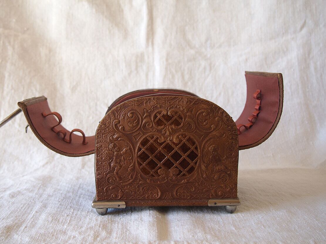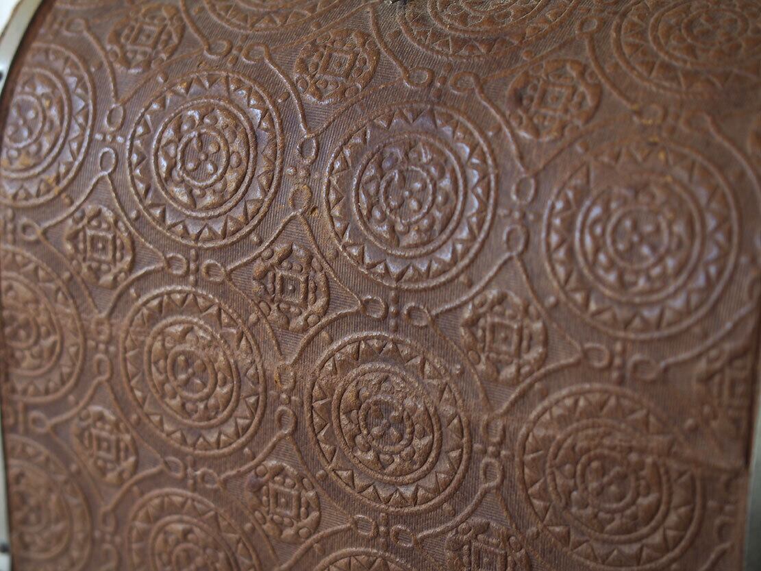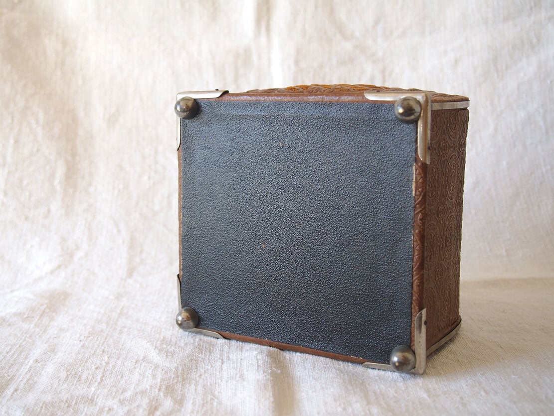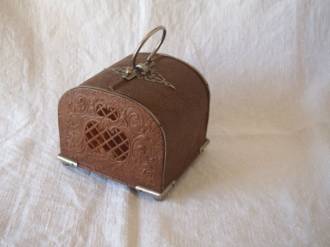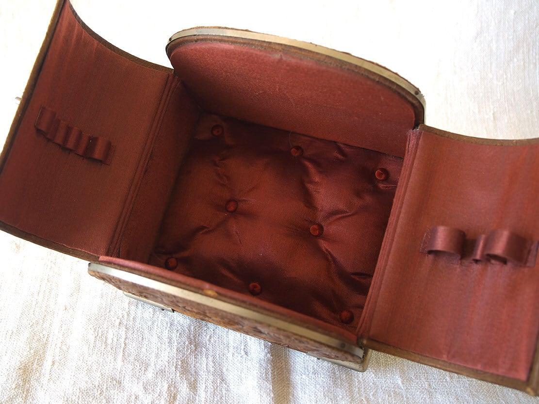 ヨーロッパのアンティーク市にて入手。おおよそ1880〜1920年頃に作られたと考えられる、アンティーク・デヴォーショナルボックスです。19世紀後半のロココ・リヴァイヴァル様式。型押し装飾が施された紙製の外装には、プット(天使)や唐草文様が表現されたロココ調のデザイン、中央には格子状の透かし装飾が配されています。内部はサテン張りで、当時の信仰用品らしい丁寧な作りです。 ロザリオやメダイ、小さな聖品、祈りのための私的な品を収める目的で用いられていたものと思われます。外側は紙製ですが、内部は厚紙などを利用したしっかりとした作りで、装飾性と実用性を兼ね備えた一点です。経年による擦れや風合い、わずかな使用感は見られますが、実用可能な小箱です。コレクションやディスプレイ、カトリック信仰に関わる品の保管用としてもおすすめです。