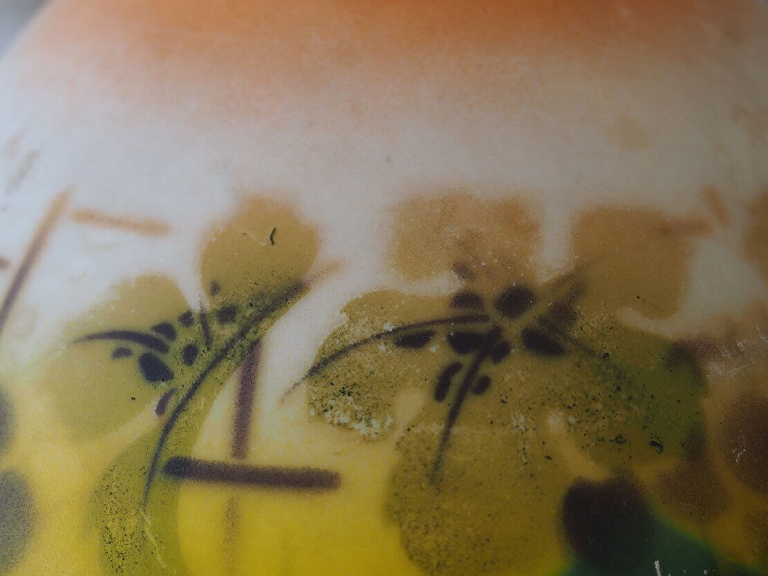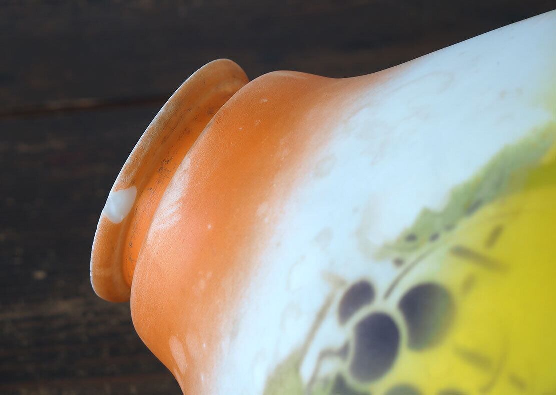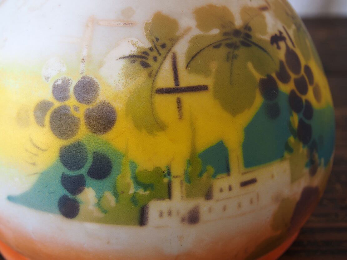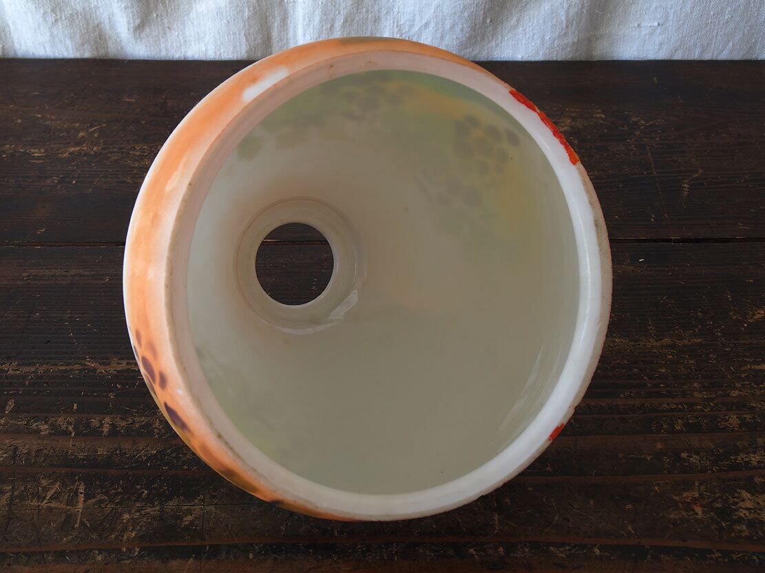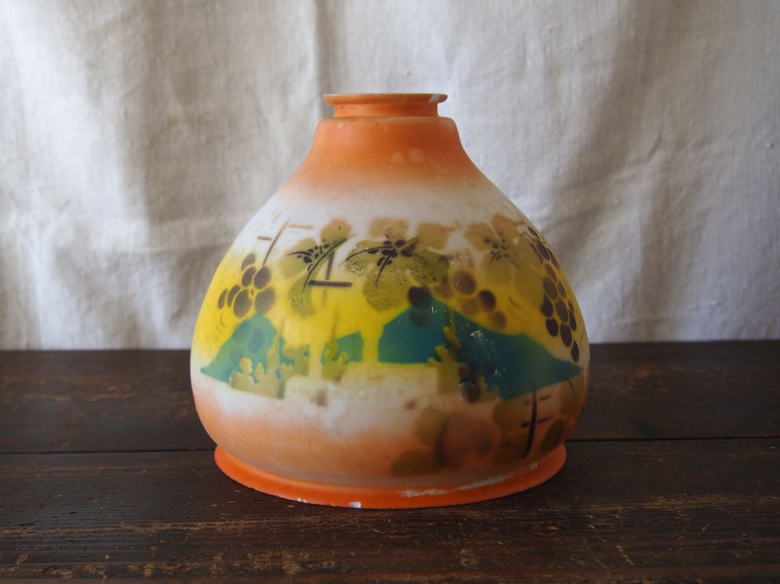 ヨーロッパのアンティーク市にて入手、1930年ぐらい? 美しいハンドメイドのガラスシェード。アール・デコ期(192030s)に非常に流行した乳白がかった磨りガラスに、黄色・緑・青・紫などを重ねたステンシルや吹き付けによる着色。特に醜いダメージはありませんが、ソケット挿入部分や裾に小さな表面だけの欠けや色のハゲがあります。色のソケット挿入口外径5.9m 内径4.4cm くびれ部分外径4.4cm。日本の規格のソケットがご利用いただけます。参考資料、リメイクなどにどうぞ。