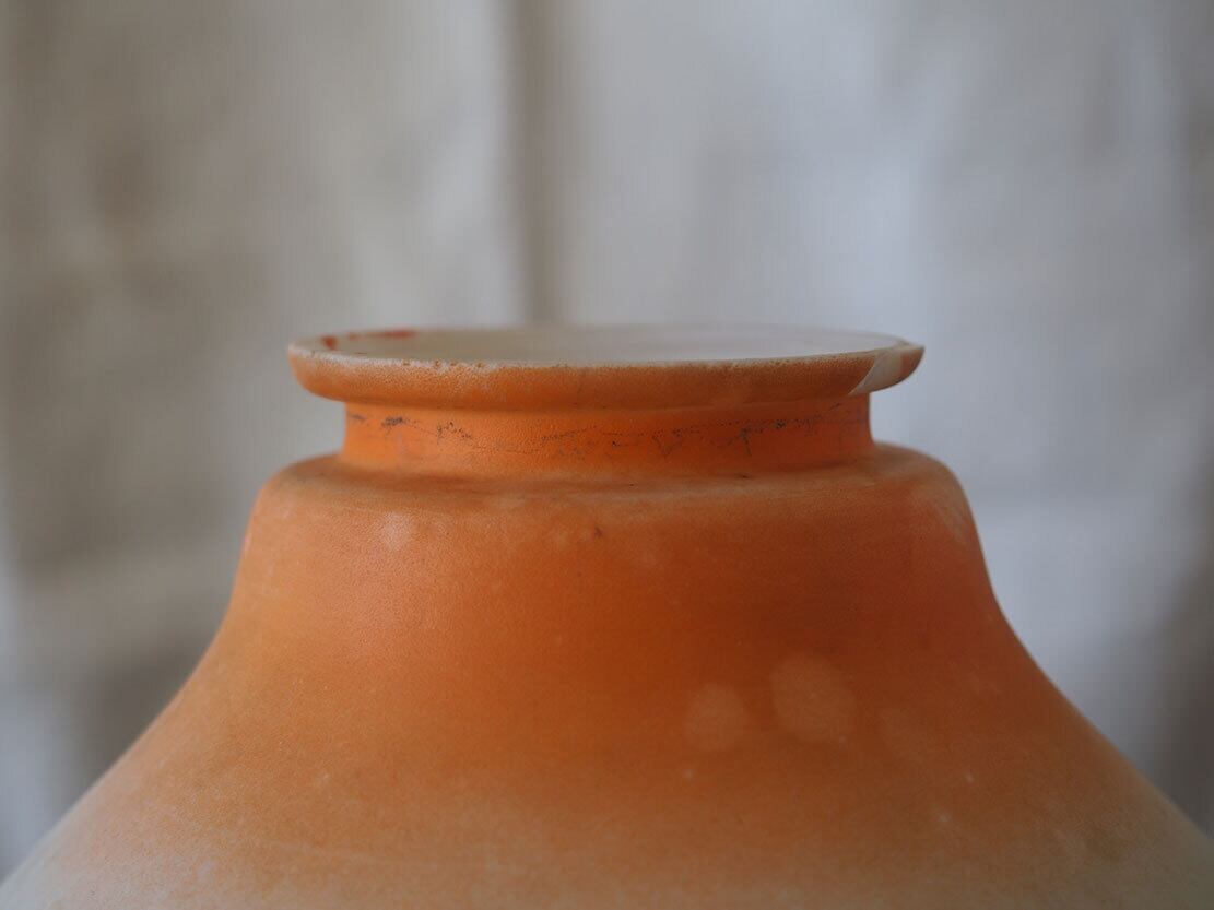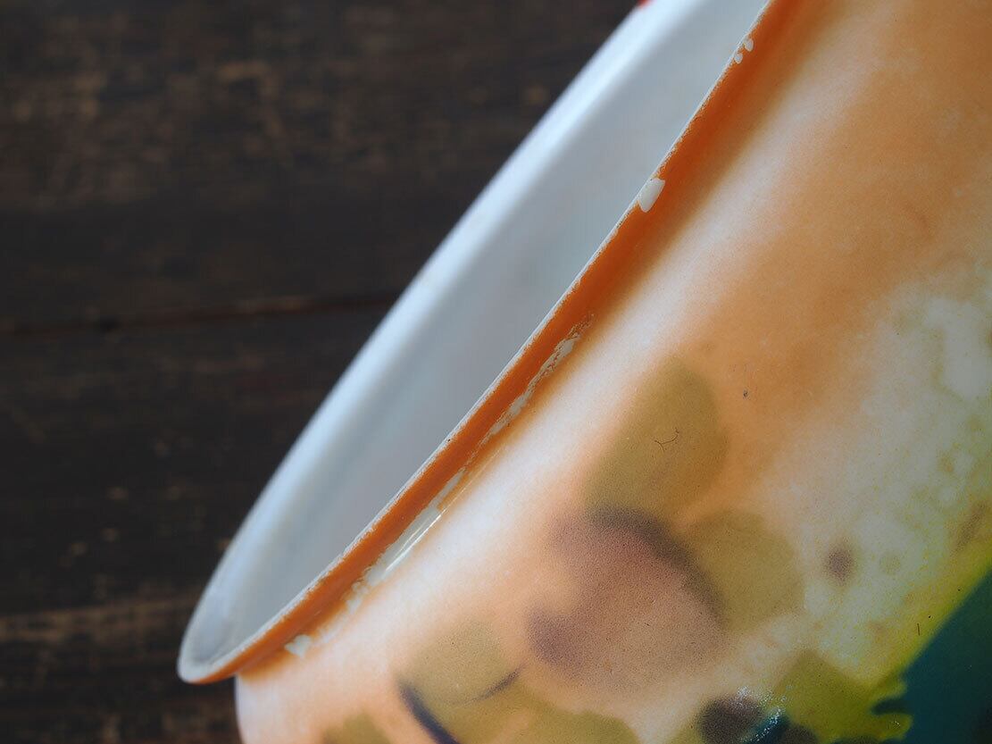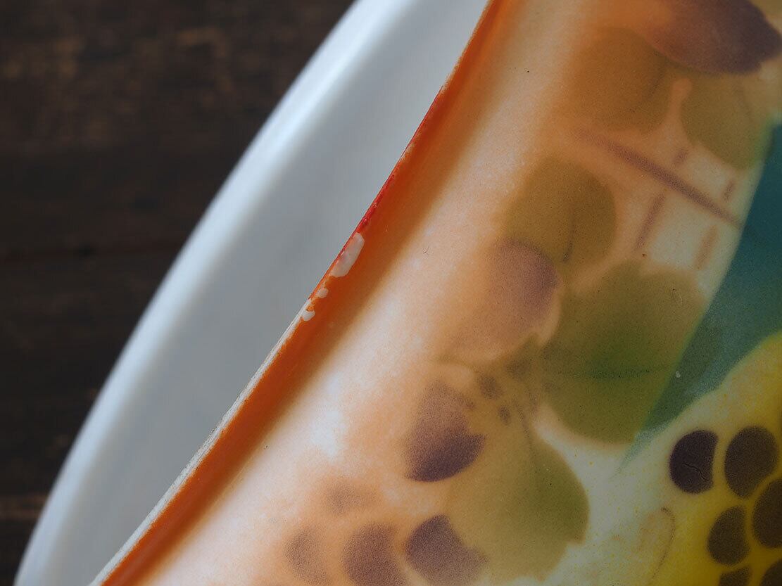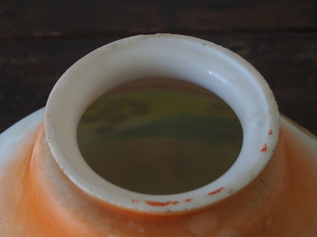 ヨーロッパのアンティーク市にて入手、1930年ぐらい? 美しいハンドメイドのガラスシェード。アール・デコ期(192030s)に非常に流行した乳白がかった磨りガラスに、黄色・緑・青・紫などを重ねたステンシルや吹き付けによる着色。特に醜いダメージはありませんが、ソケット挿入部分や裾に小さな表面だけの欠けや色のハゲがあります。色のソケット挿入口外径5.9m 内径4.4cm くびれ部分外径4.4cm。日本の規格のソケットがご利用いただけます。参考資料、リメイクなどにどうぞ。