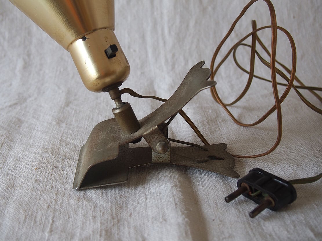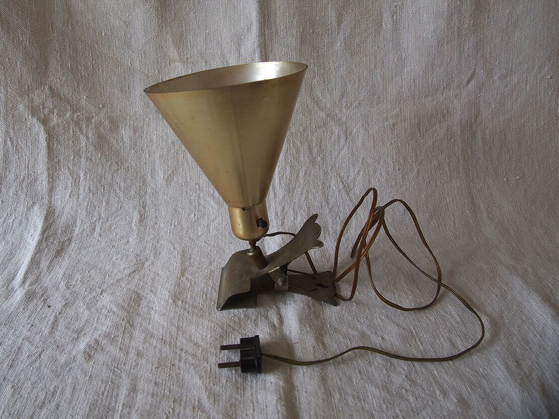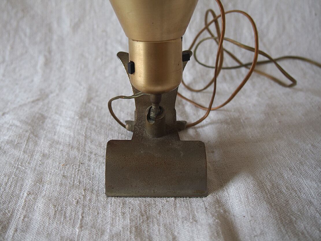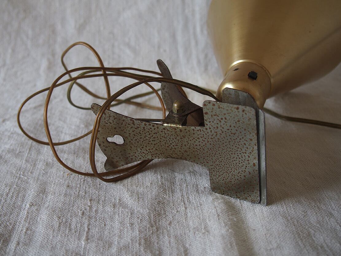 ヨーロッパのアンティーク市にて入手、1930年代後半〜1950年代前半頃に製造された、アルミ製のヴィンテージ・クリップランプ。シェードは薄いクリーム色、シェード付け根にスイッチあり、台座はクリップになっており、置くことも何かに挟むことも可能。電球は付属しませんが日本でも入手が容易な規格E26。差込は海外仕様になっているので変換プラグを使用するか、差込を交換してください(写真の変換プラグは見本です、商品には付属しません)。動作確認していますが、古いものなので、商品が届いて万が一点灯しなかった場合は恐れ入りますが、お客様の方でメンテナンスをお願いします。コードは硬化しているので交換してご利用することをお勧めします。参考資料、リメイクなどにもどうぞ。