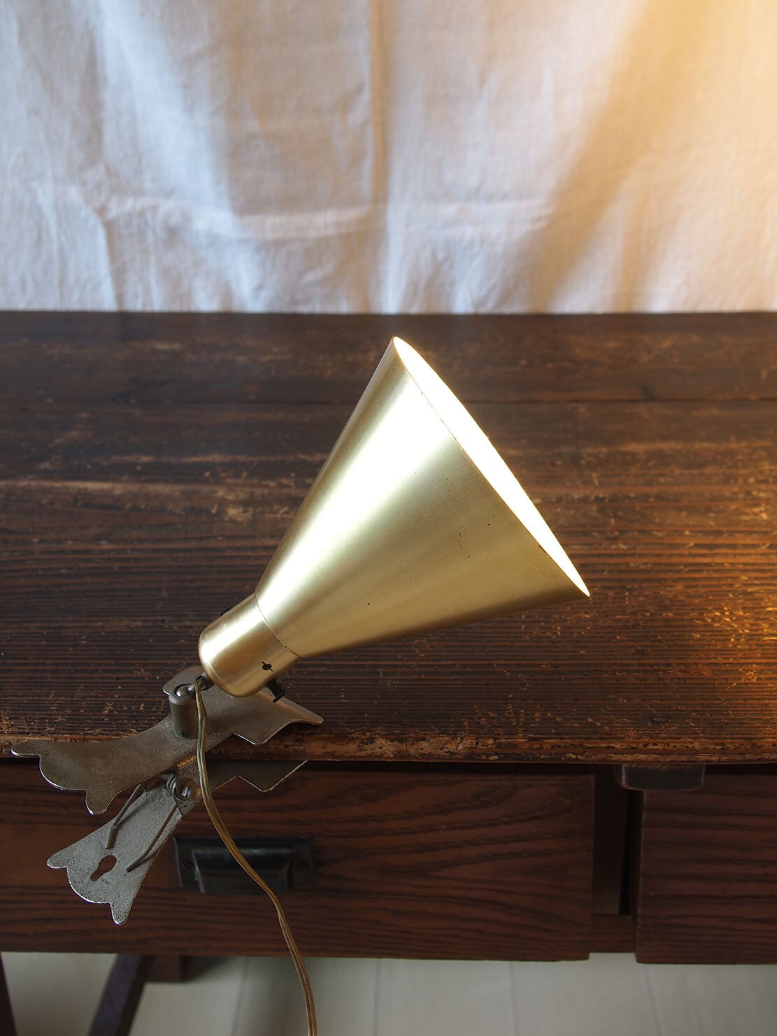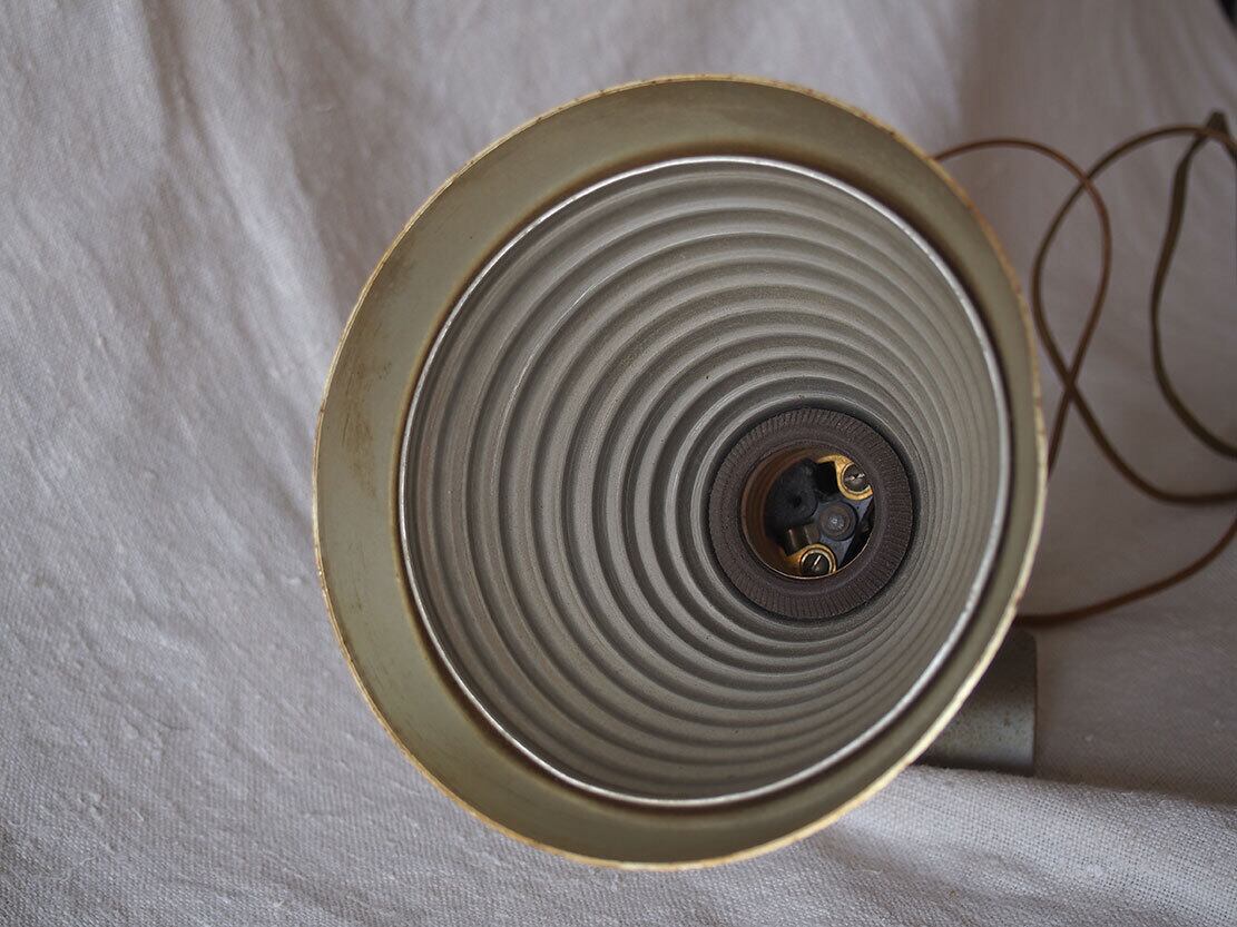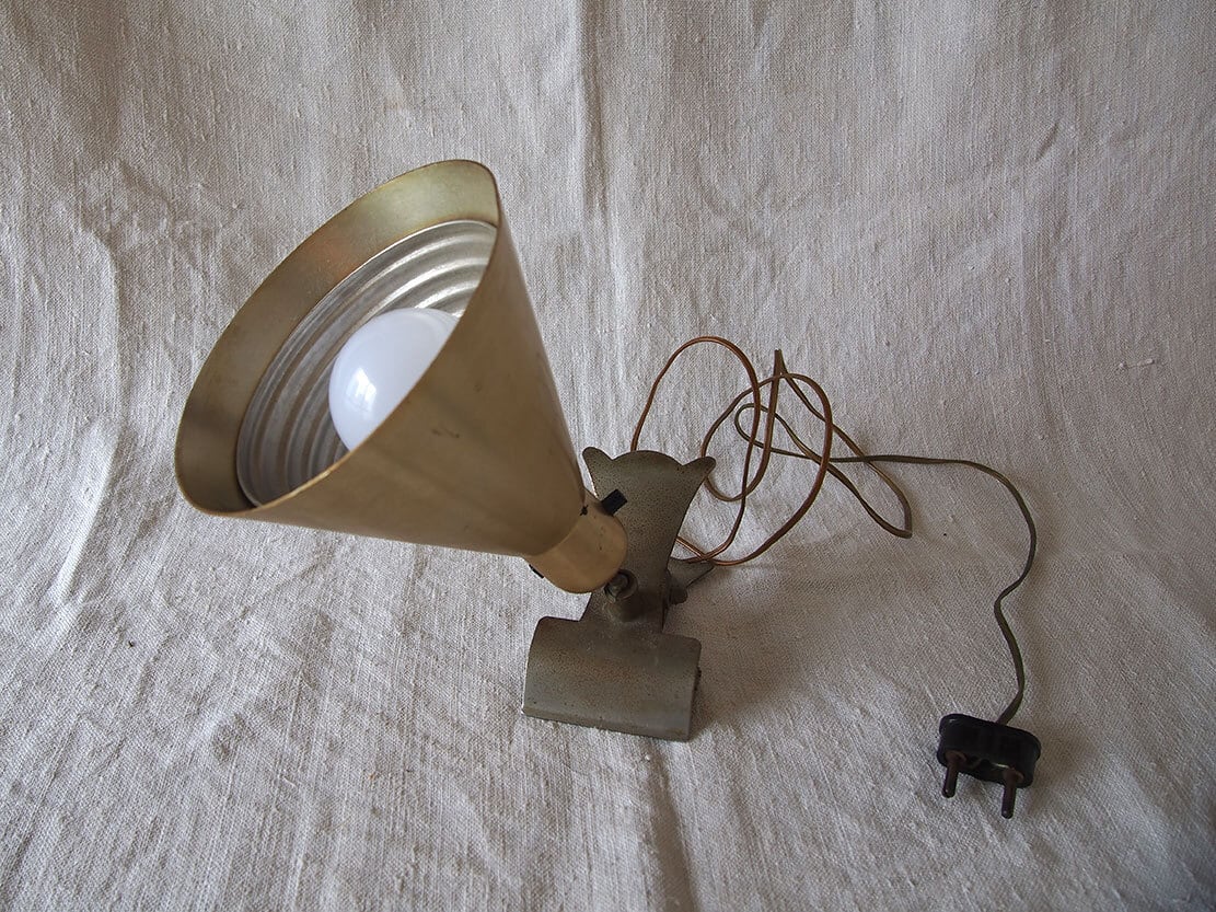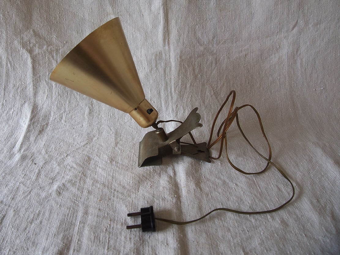 ヨーロッパのアンティーク市にて入手、1930年代後半〜1950年代前半頃に製造された、アルミ製のヴィンテージ・クリップランプ。シェードは薄いクリーム色、シェード付け根にスイッチあり、台座はクリップになっており、置くことも何かに挟むことも可能。電球は付属しませんが日本でも入手が容易な規格E26。差込は海外仕様になっているので変換プラグを使用するか、差込を交換してください(写真の変換プラグは見本です、商品には付属しません)。動作確認していますが、古いものなので、商品が届いて万が一点灯しなかった場合は恐れ入りますが、お客様の方でメンテナンスをお願いします。コードは硬化しているので交換してご利用することをお勧めします。参考資料、リメイクなどにもどうぞ。