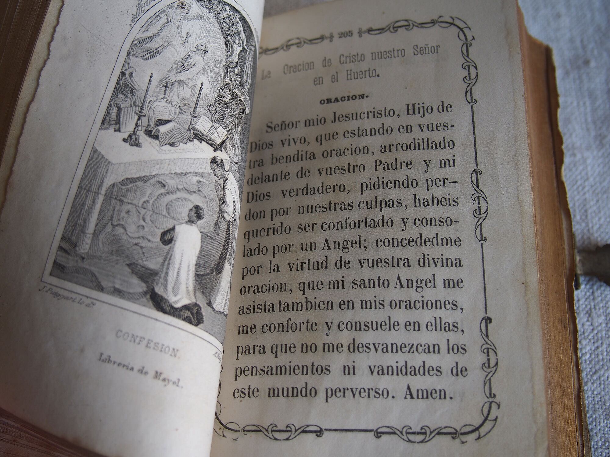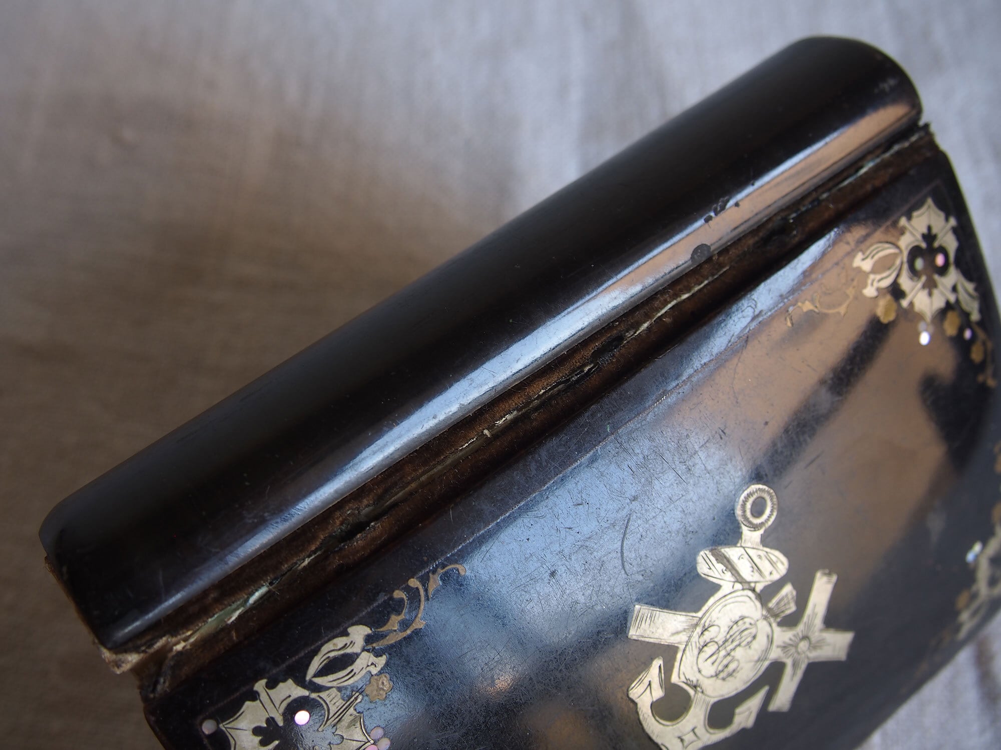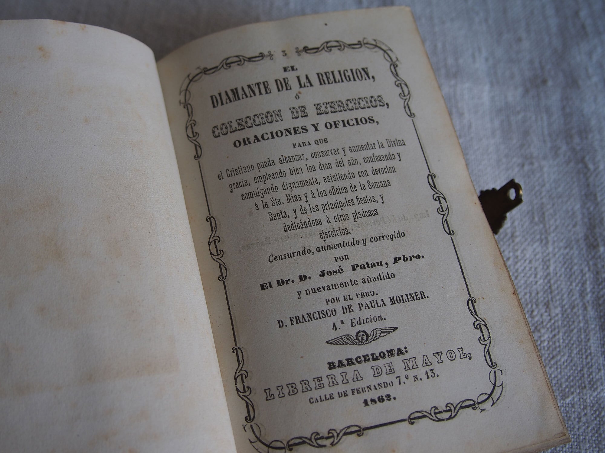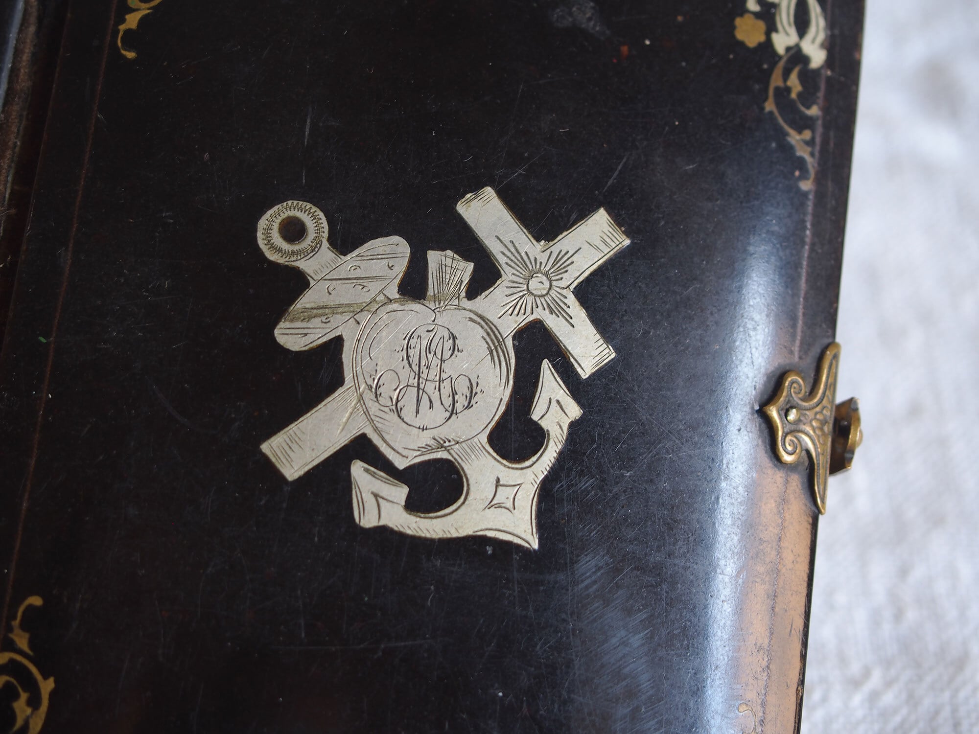 カトリック関連の古い本。表紙は樹脂に貝や金属のモチーフを埋め込んであります。El Diamante de la Religin/宗教のダイヤモンド、1862年刊。100年以上も前の古い本です、中央の銀色のモチーフは、カトリックの象徴を組み合わせた図像です。十字架:キリストの受難、錨:希望、燃える心臓:キリストの聖心・愛、円形中央のモノグラム(IHS) :イエス・キリストの名。経年による置きシミなどあります。全ページを確認していません、書き込みなどあるかもしれません。挟まっていたカードも付属します。置いておくだけで存在感のある古い本です。